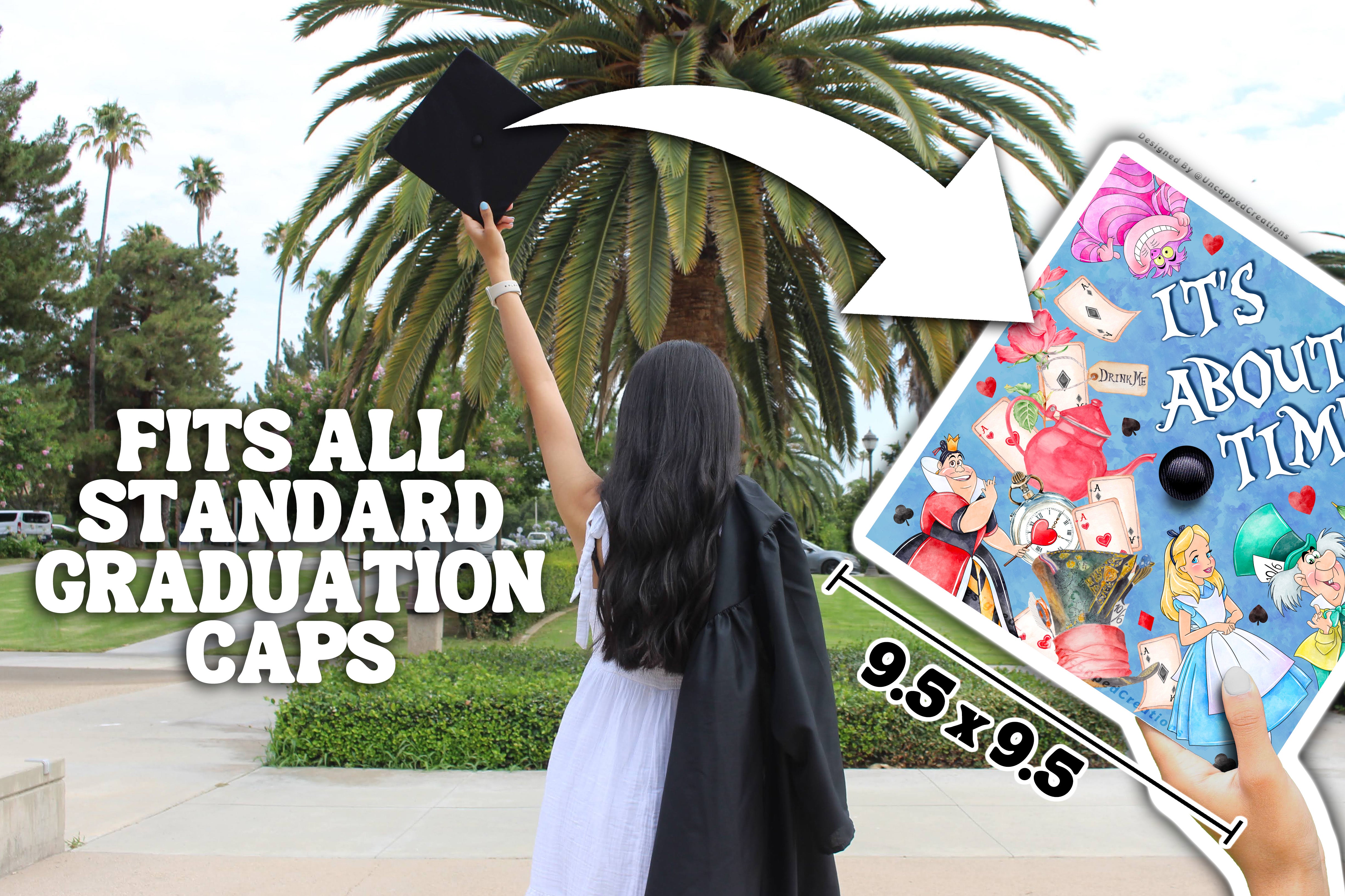 Design is 9.5 x 9.5 inches with an approximate 1 inch hole in the center and double sided adhesive in the back. Design is printed on cardstock, not hand painted. The topper will fit the standard 9 x 9 inches graduation cap / mortar board. Cap/Mortar board is not included. Center circle is not included.
