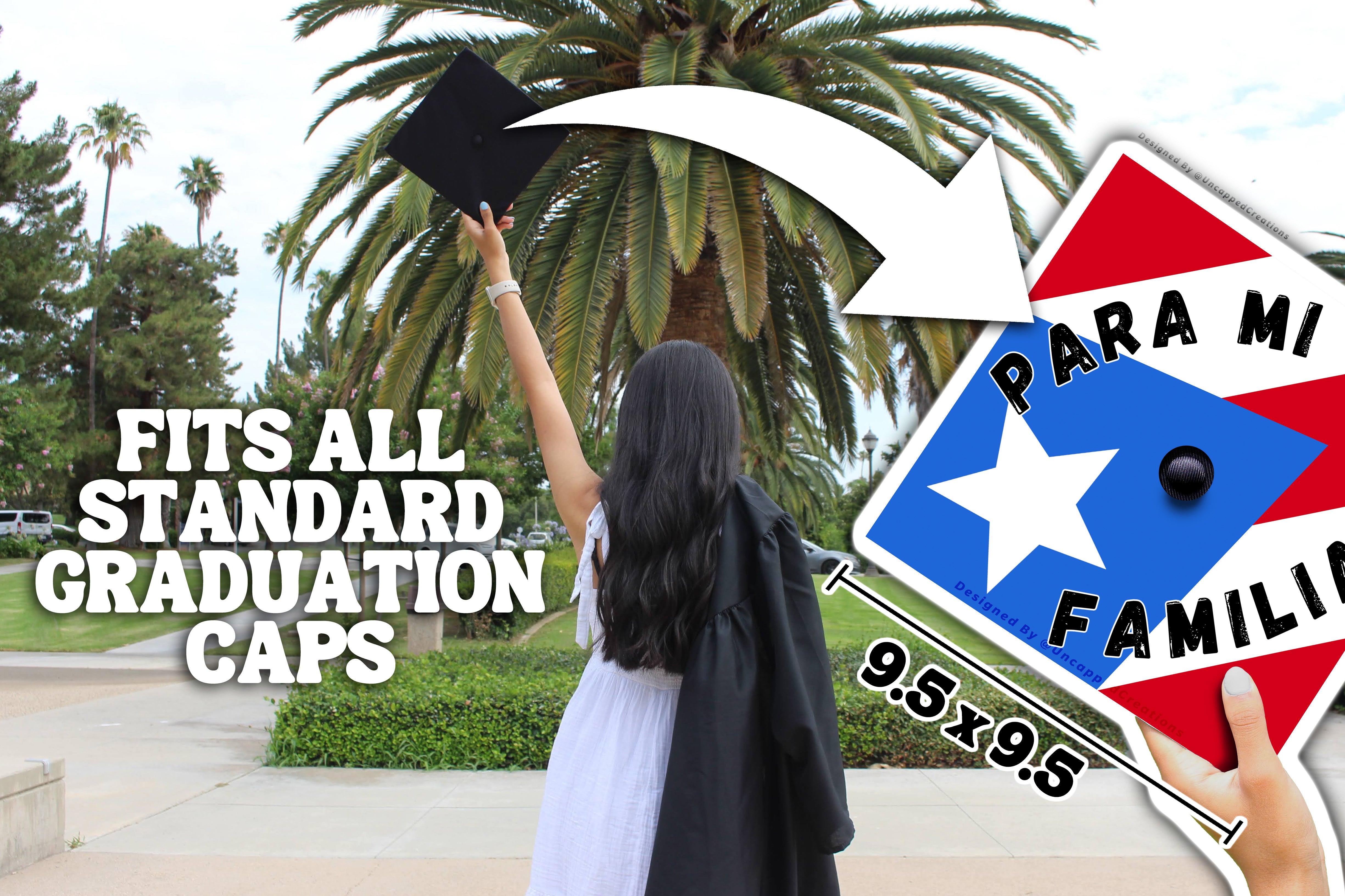 Design is 9.5 x 9.5 inches with an approximate 1 inch hole in the center and double sided adhesive in the back. Design is printed on cardstock, not hand painted. The topper will fit the standard 9 x 9 inches graduation cap / mortar board. Cap is not included.
