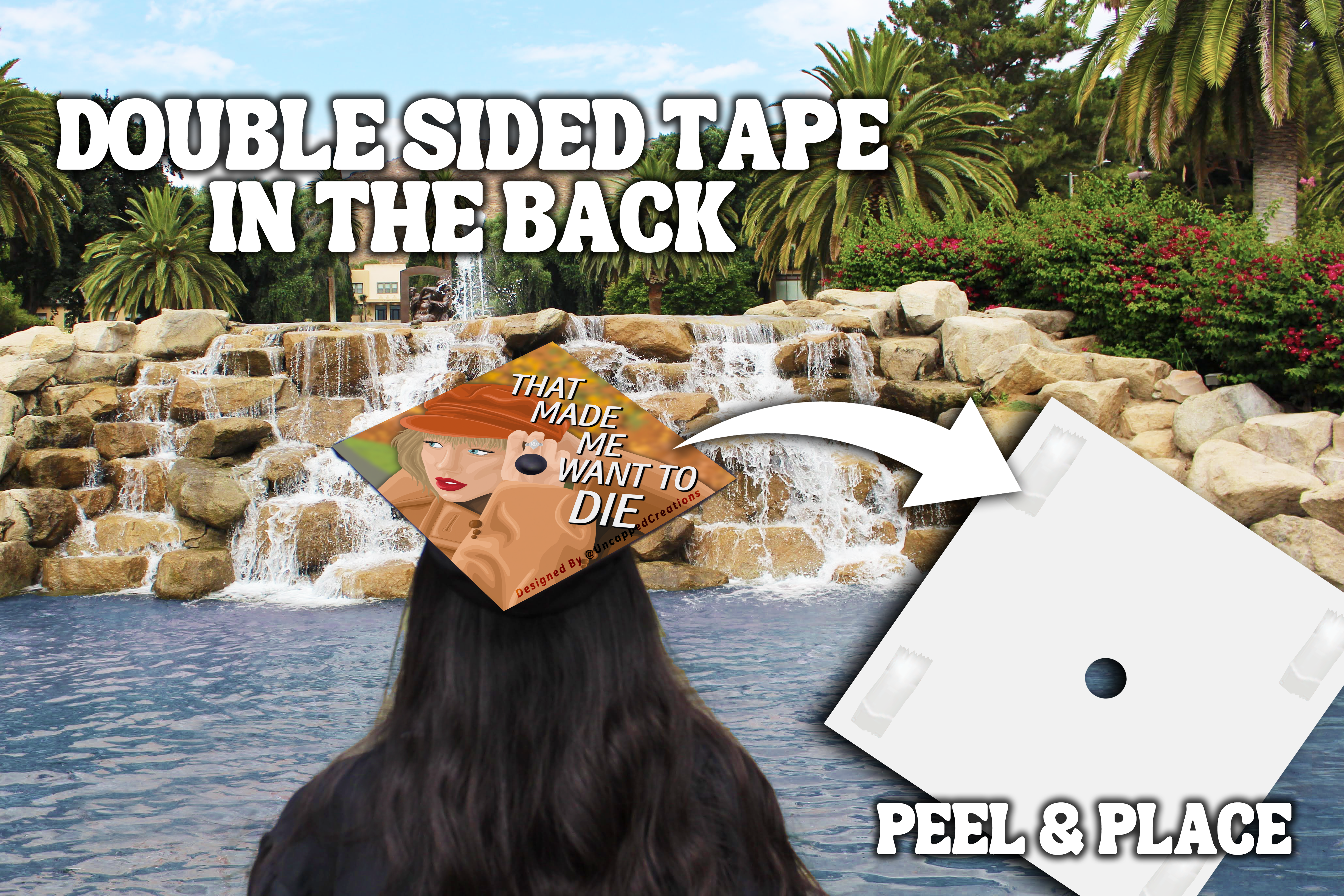 Design is 9.5 x 9.5 inches with an approximate 1 inch hole in the center and double sided adhesive in the back. Design is printed on cardstock, not hand painted. The topper will fit the standard 9 x 9 inches graduation cap / mortar board. Cap/Mortar board is not included. Center circle is not included.d Policy.” Read the Return section and the Exchange section for details on how to return and/or exchange your topper.