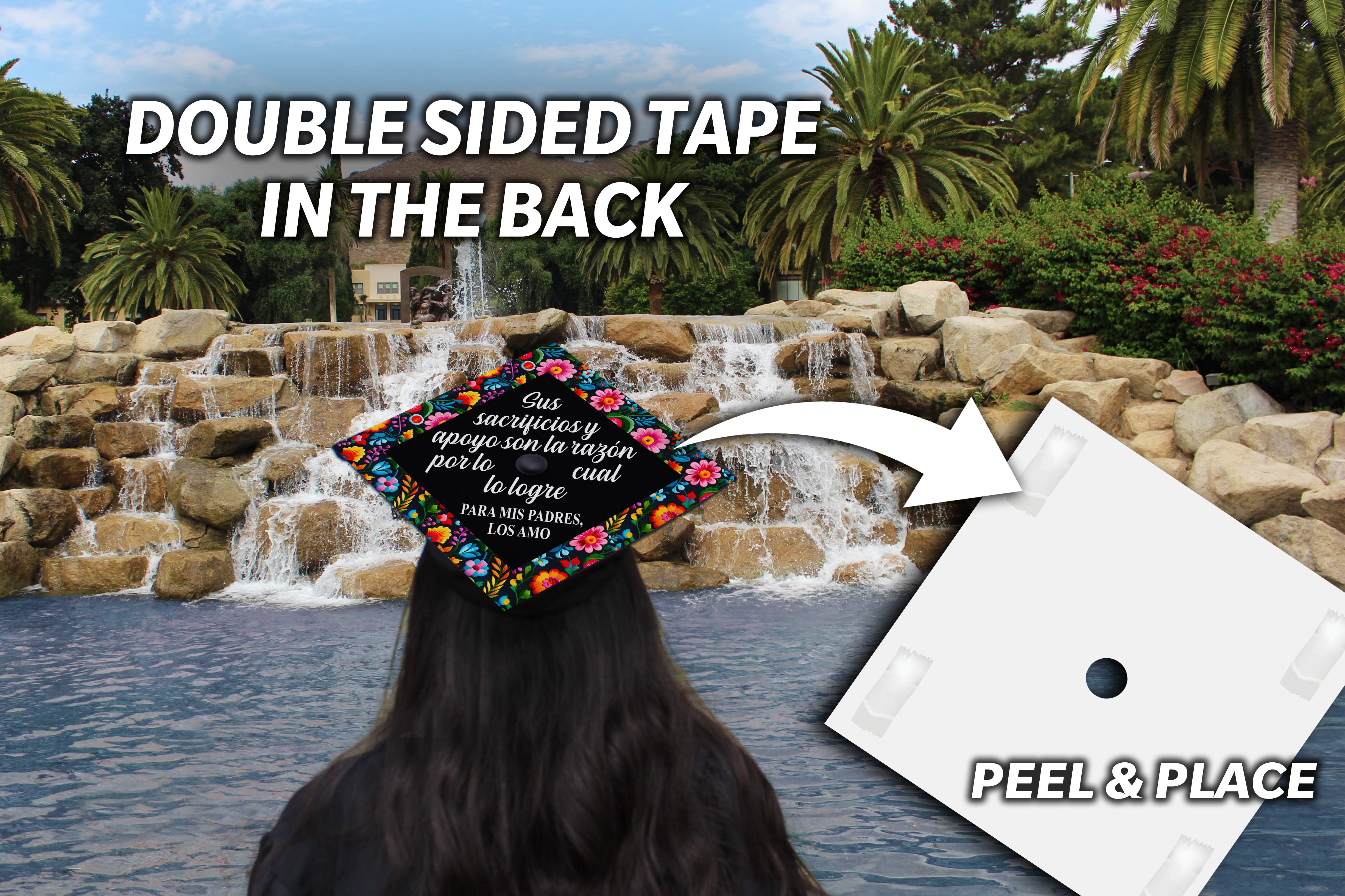 Design is 9.5 x 9.5 inches with an approximate 1 inch hole in the center and double sided adhesive in the back. Design is printed on cardstock, not hand painted. The topper will fit the standard 9 x 9 inches graduation cap / mortar board. Cap/Mortar board is not included. Center circle is not included.