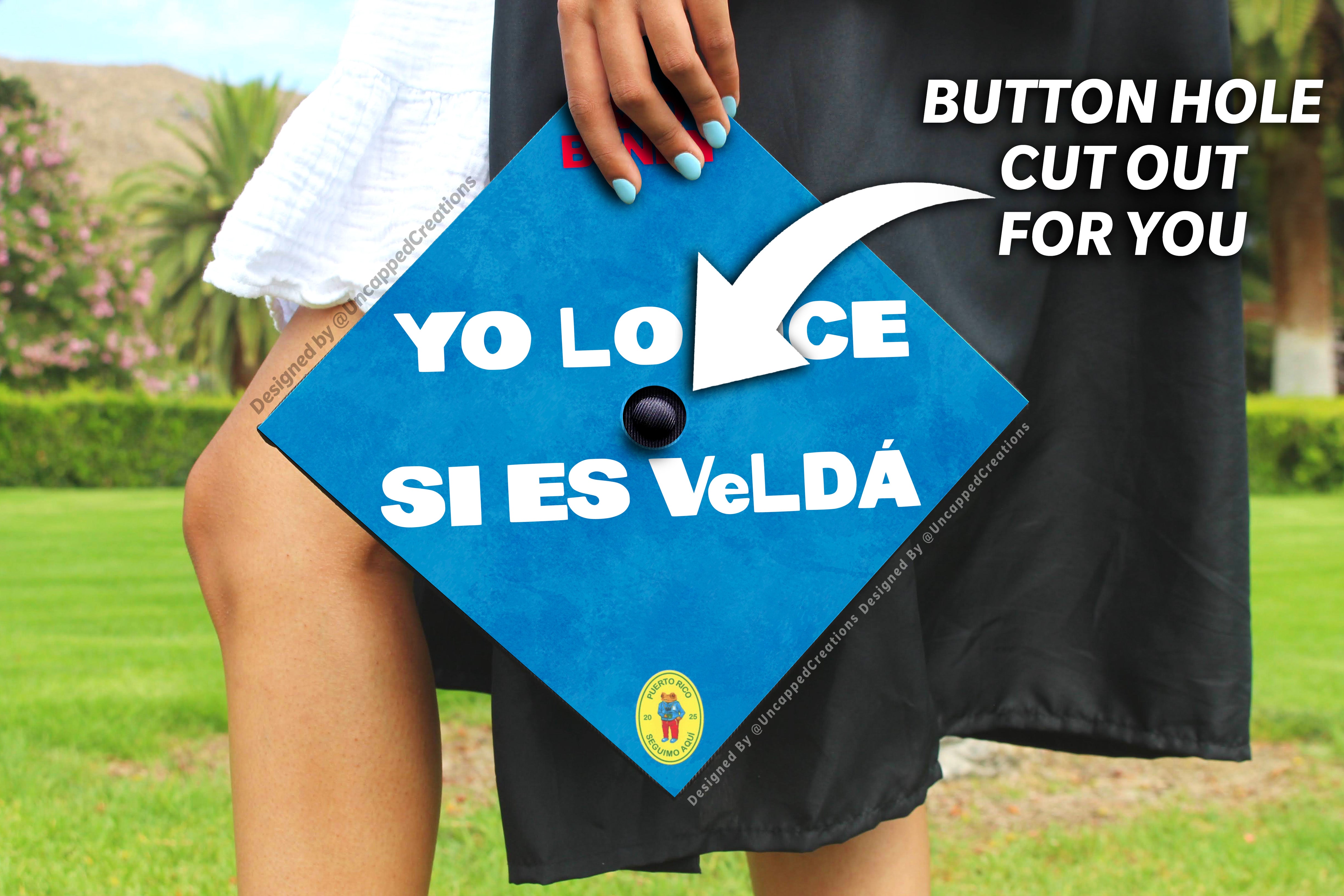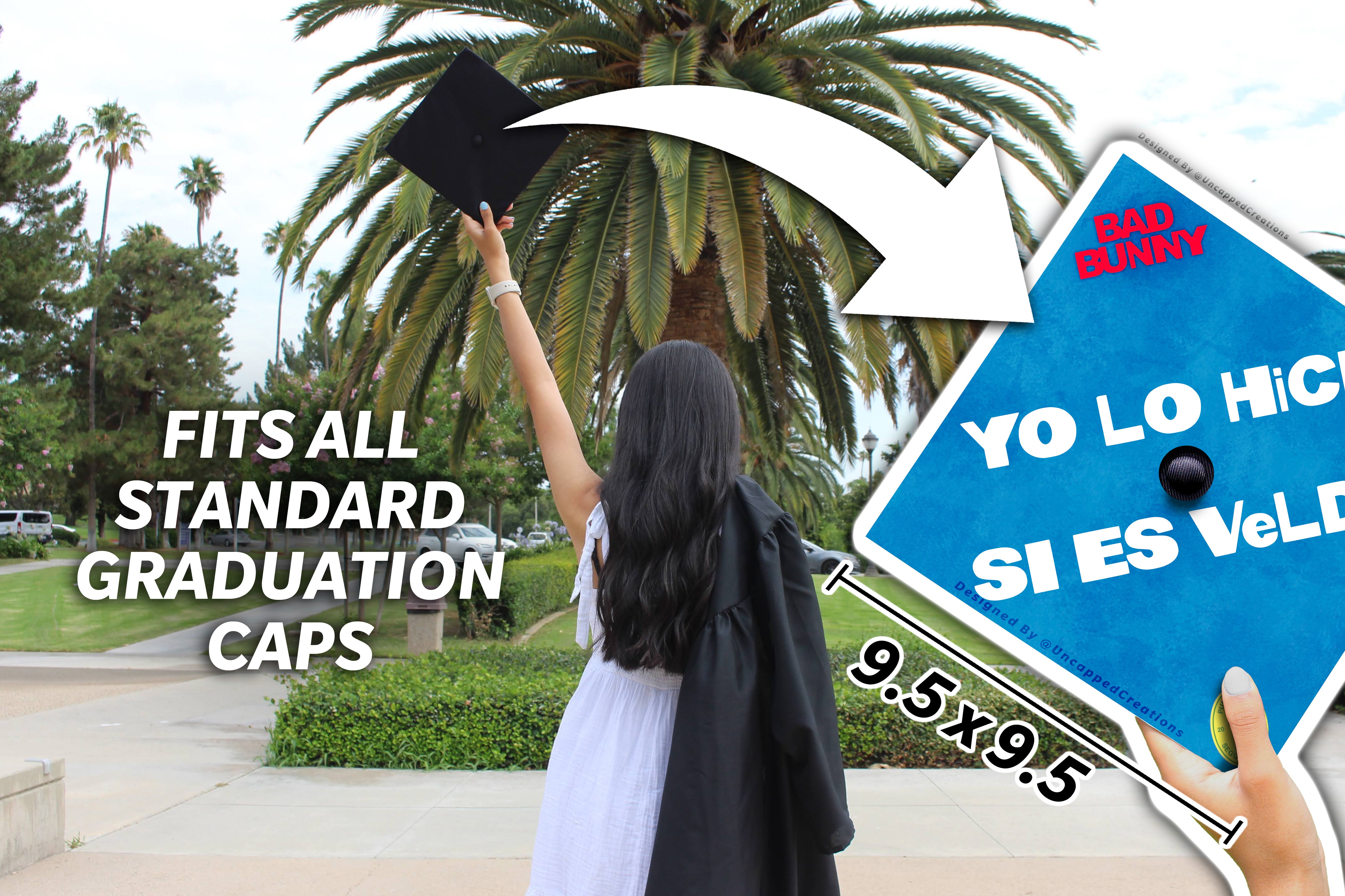 Design is 9.5 x 9.5 inches with an approximate 1 inch hole in the center and double sided adhesive in the back. Design is printed on cardstock, not hand painted. The topper will fit the standard 9 x 9 inches graduation cap / mortar board. Cap/Mortar board is not included. Center circle is not included.