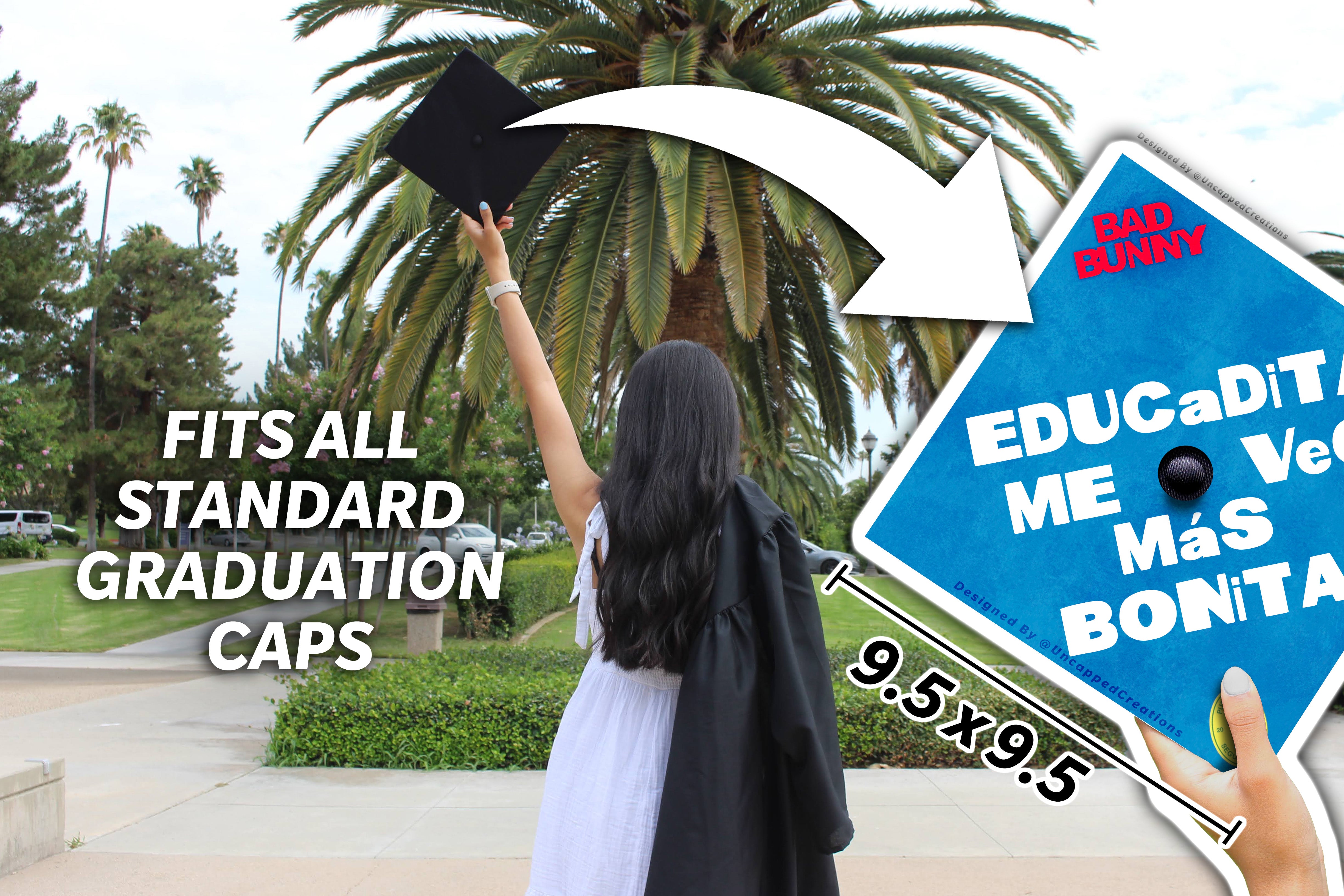 Design is 9.5 x 9.5 inches with an approximate 1 inch hole in the center and double sided adhesive in the back. Design is printed on cardstock, not hand painted. The topper will fit the standard 9 x 9 inches graduation cap / mortar board. Cap/Mortar board is not included. Center circle is not included.