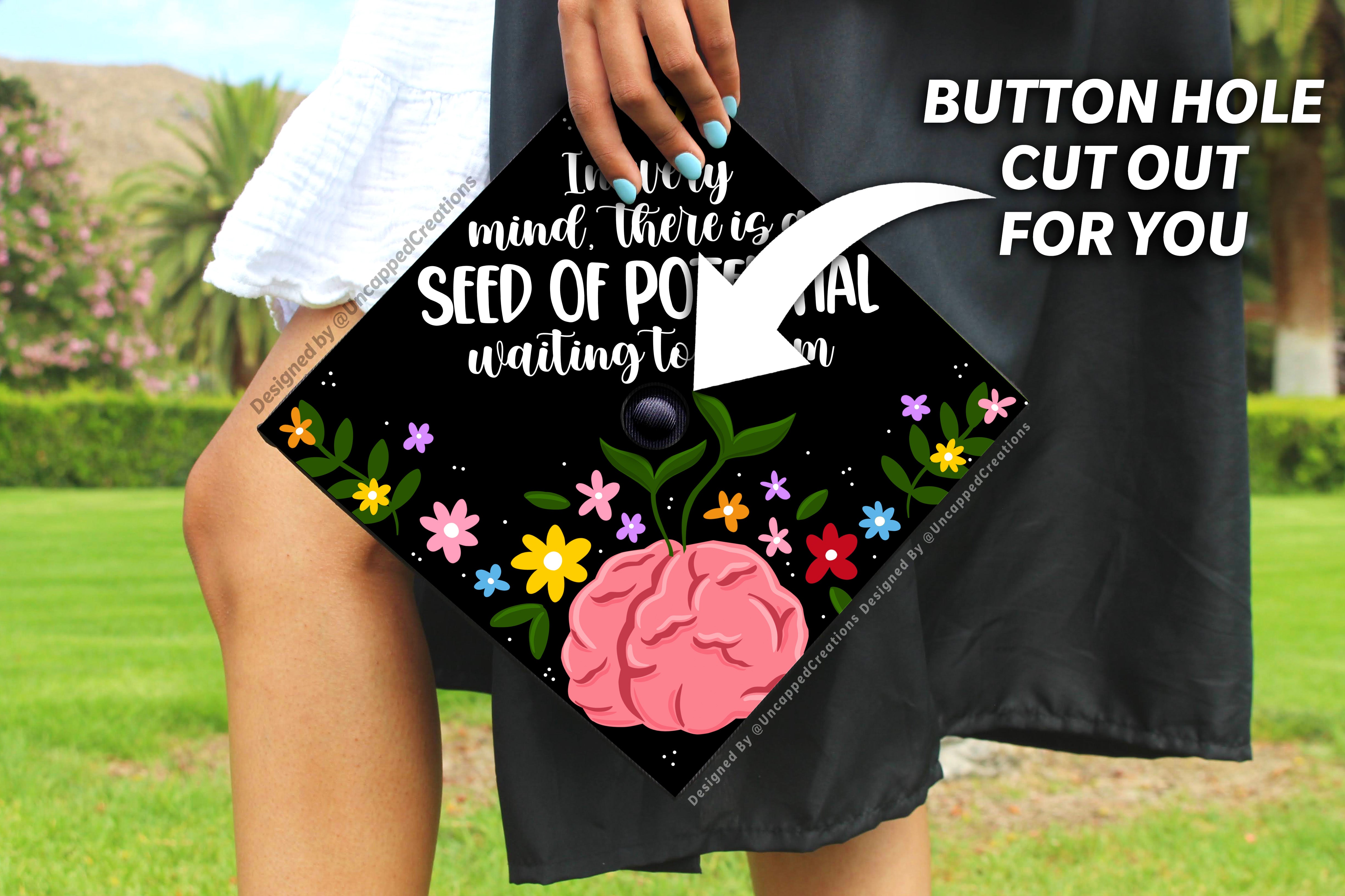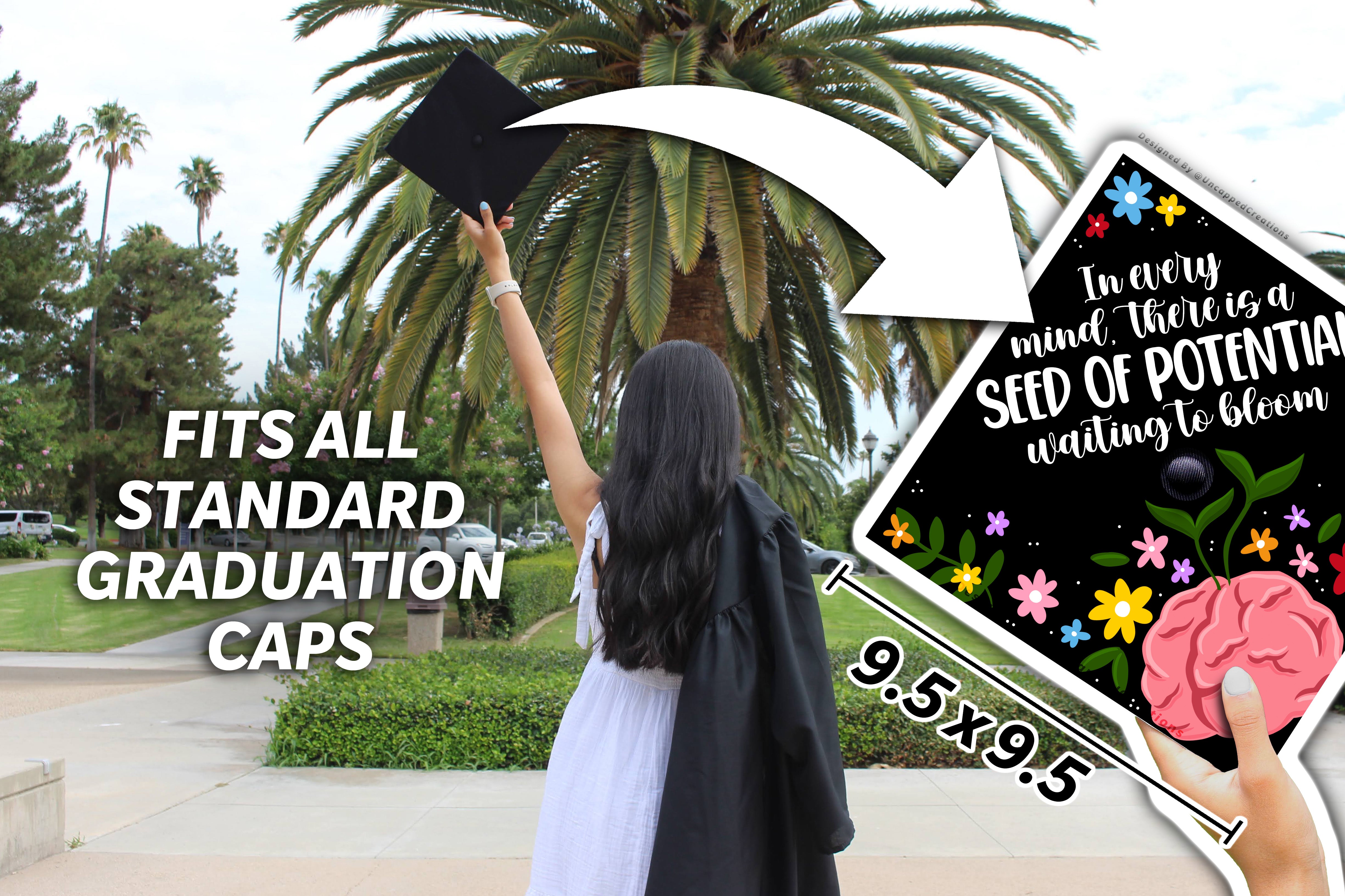 Premade grad cap design is sold AS IS. Design CANNOT be altered, edited, or changed and will be shipped exactly how you see it. Printed design may differ in color slightly in person. Watermarks are only on product photos, actual product will not have a watermark.