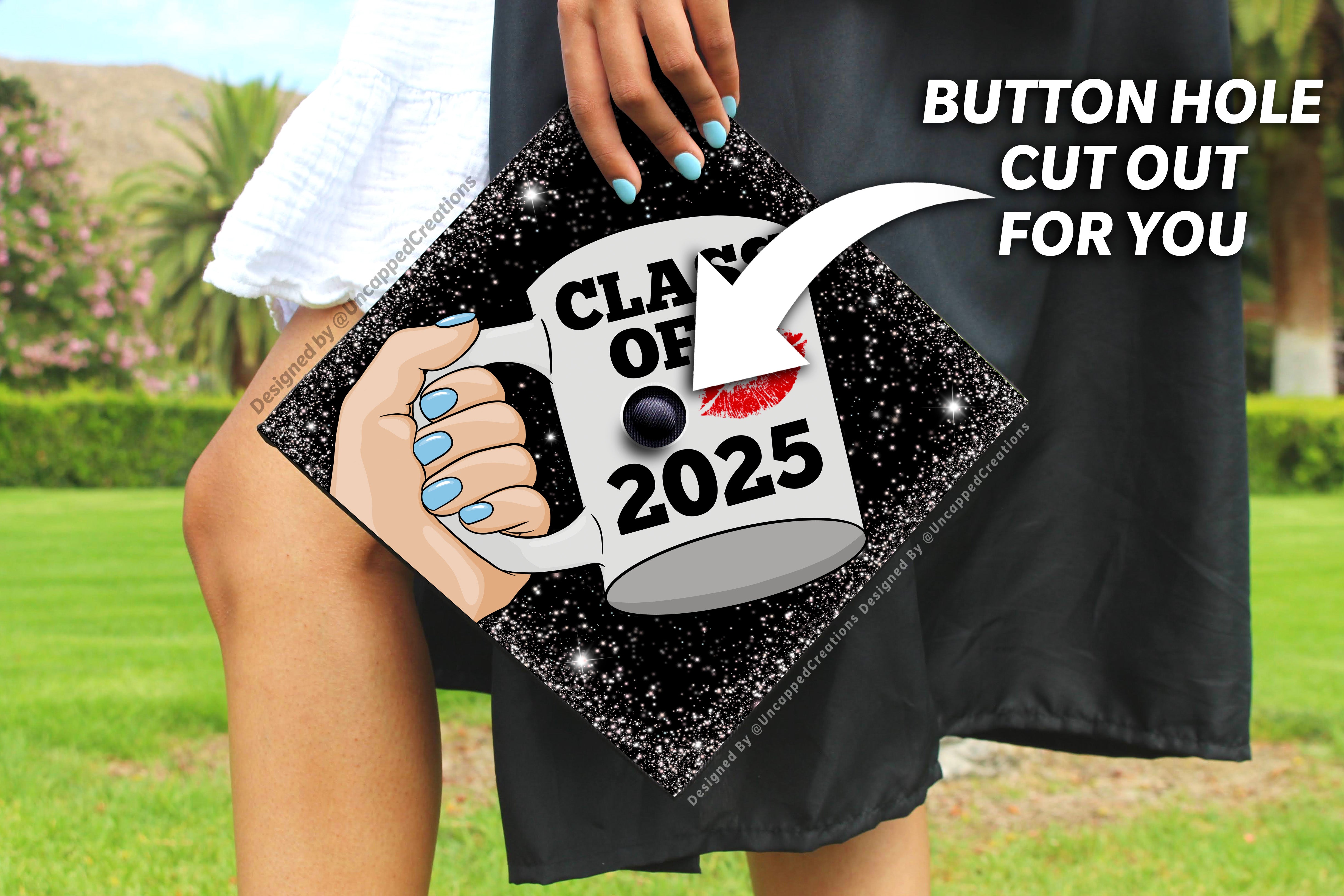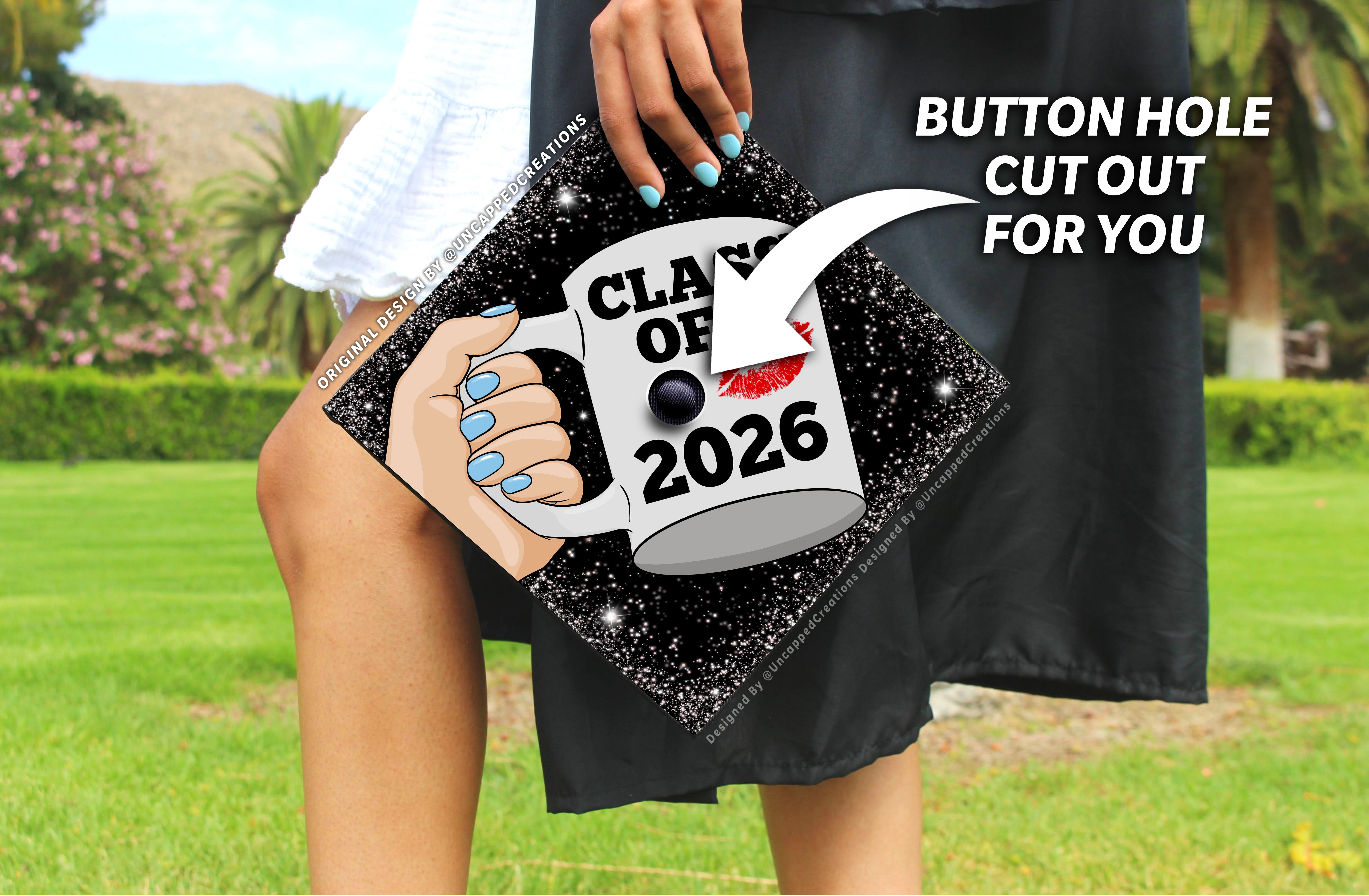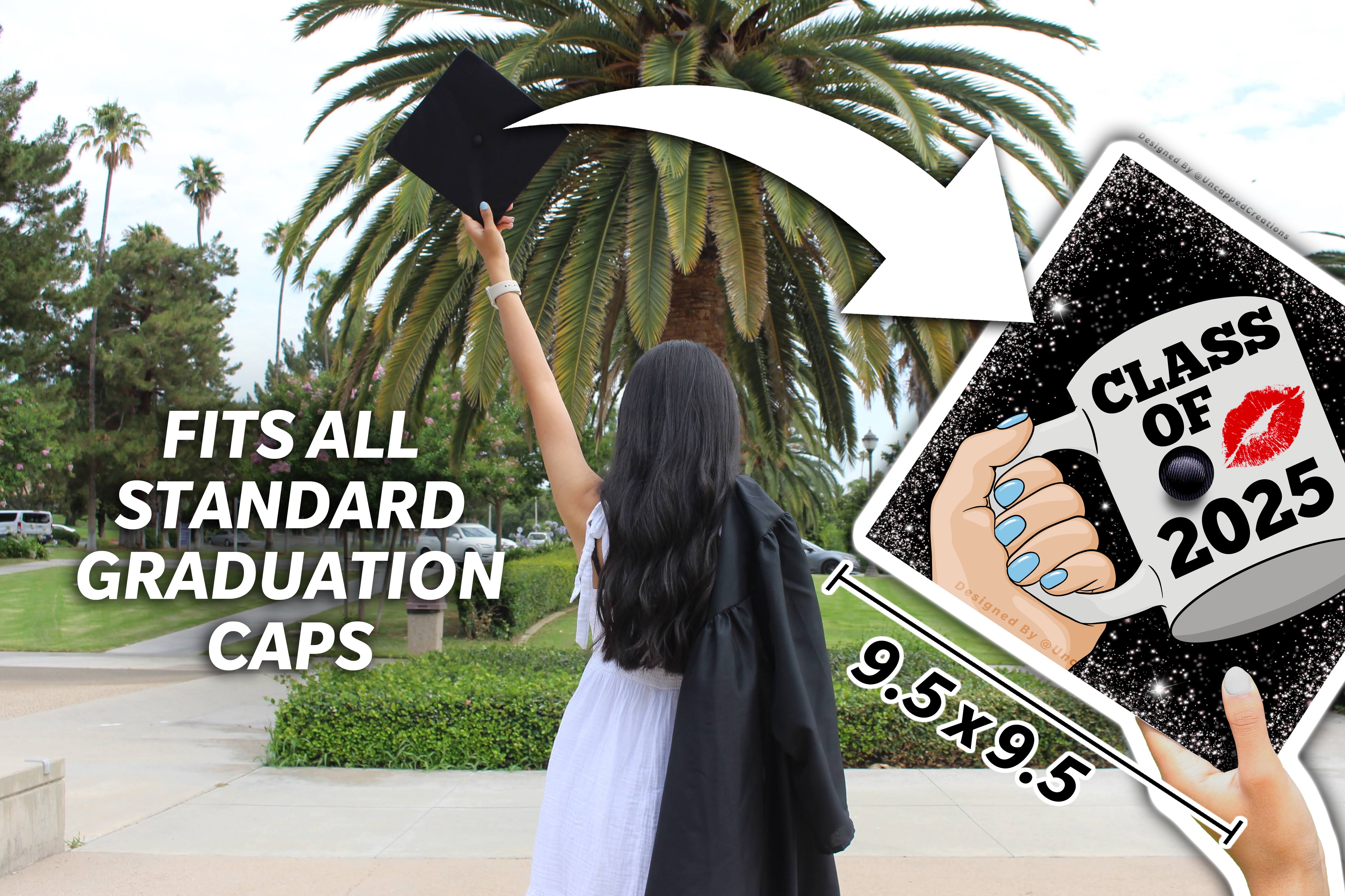 Design is 9.5 x 9.5 inches with an approximate 1 inch hole in the center and double sided adhesive in the back. Design is printed on cardstock, not hand painted. The topper will fit the standard 9 x 9 inches graduation cap / mortar board. Cap/Mortar board is not included. Center circle is not included.