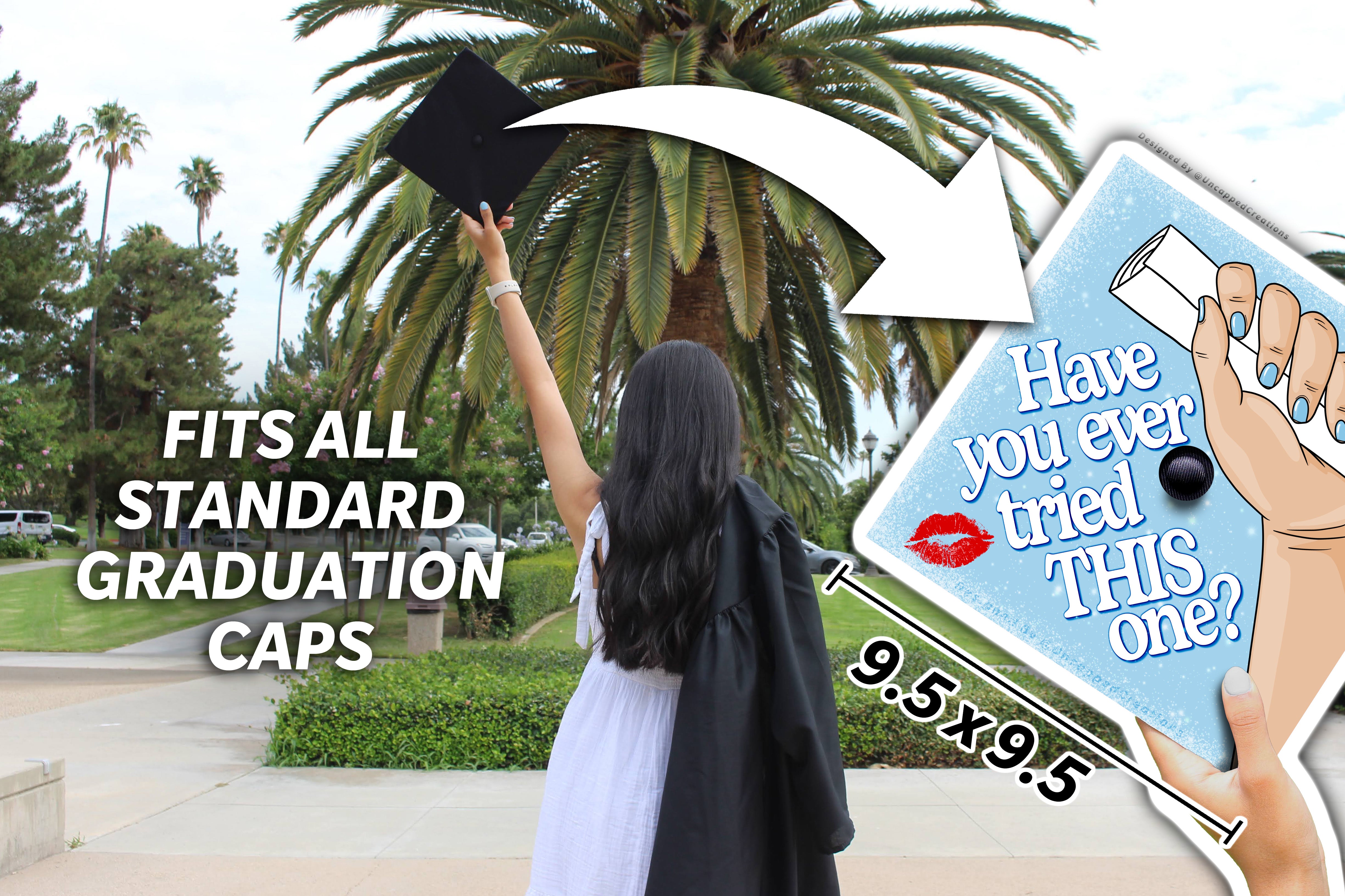 Design is 9.5 x 9.5 inches with an approximate 1 inch hole in the center and double sided adhesive in the back. Design is printed on cardstock, not hand painted. The topper will fit the standard 9 x 9 inches graduation cap / mortar board. Cap/Mortar board is not included. Center circle is not included.