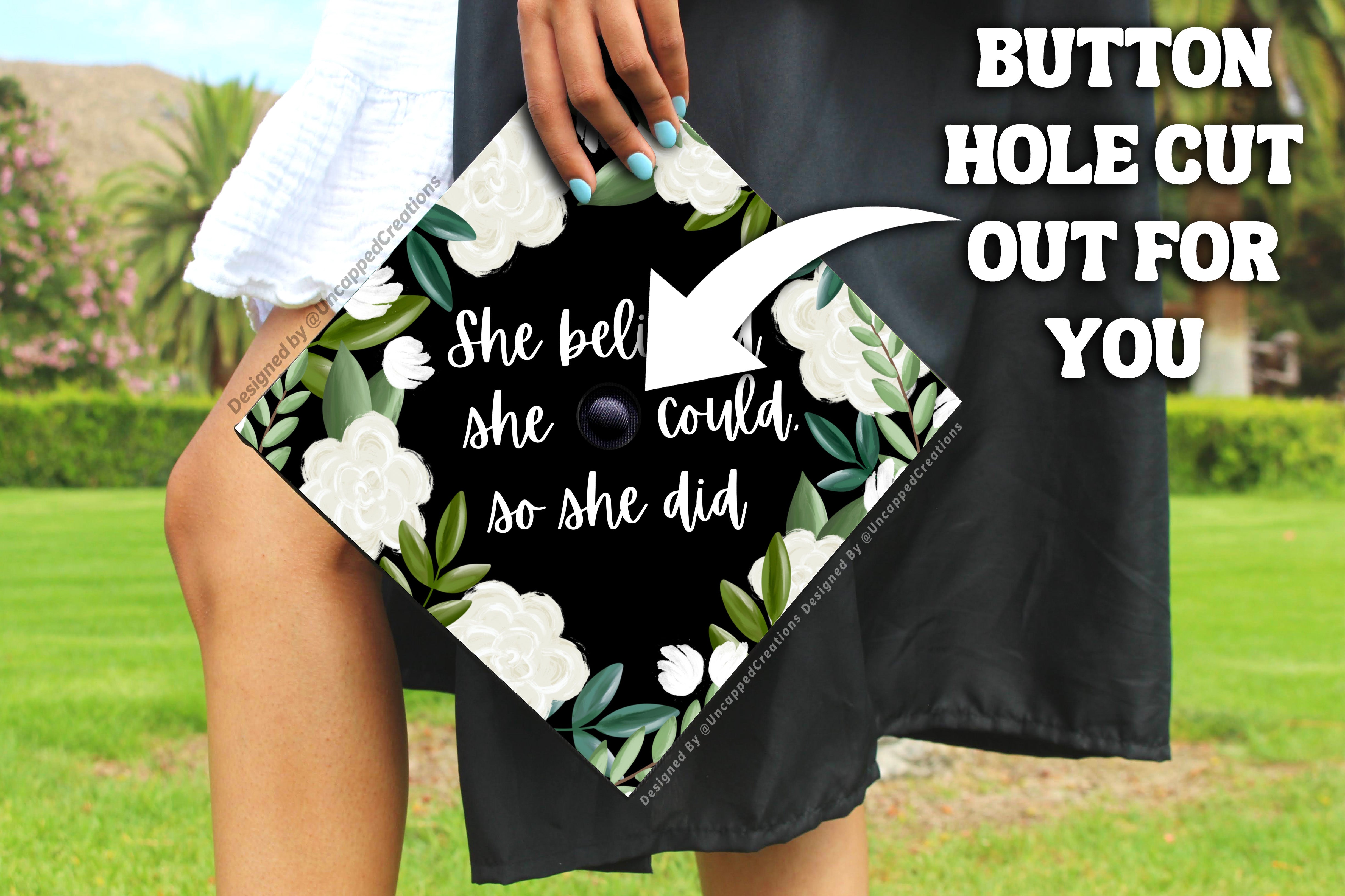 Design is 9.5 x 9.5 inches with an approximate 1 inch hole in the center and double sided adhesive in the back. Design is printed on cardstock, not hand painted. The topper will fit the standard 9 x 9 inches graduation cap / mortar board. Cap/Mortar board is not included. Center circle is not included.