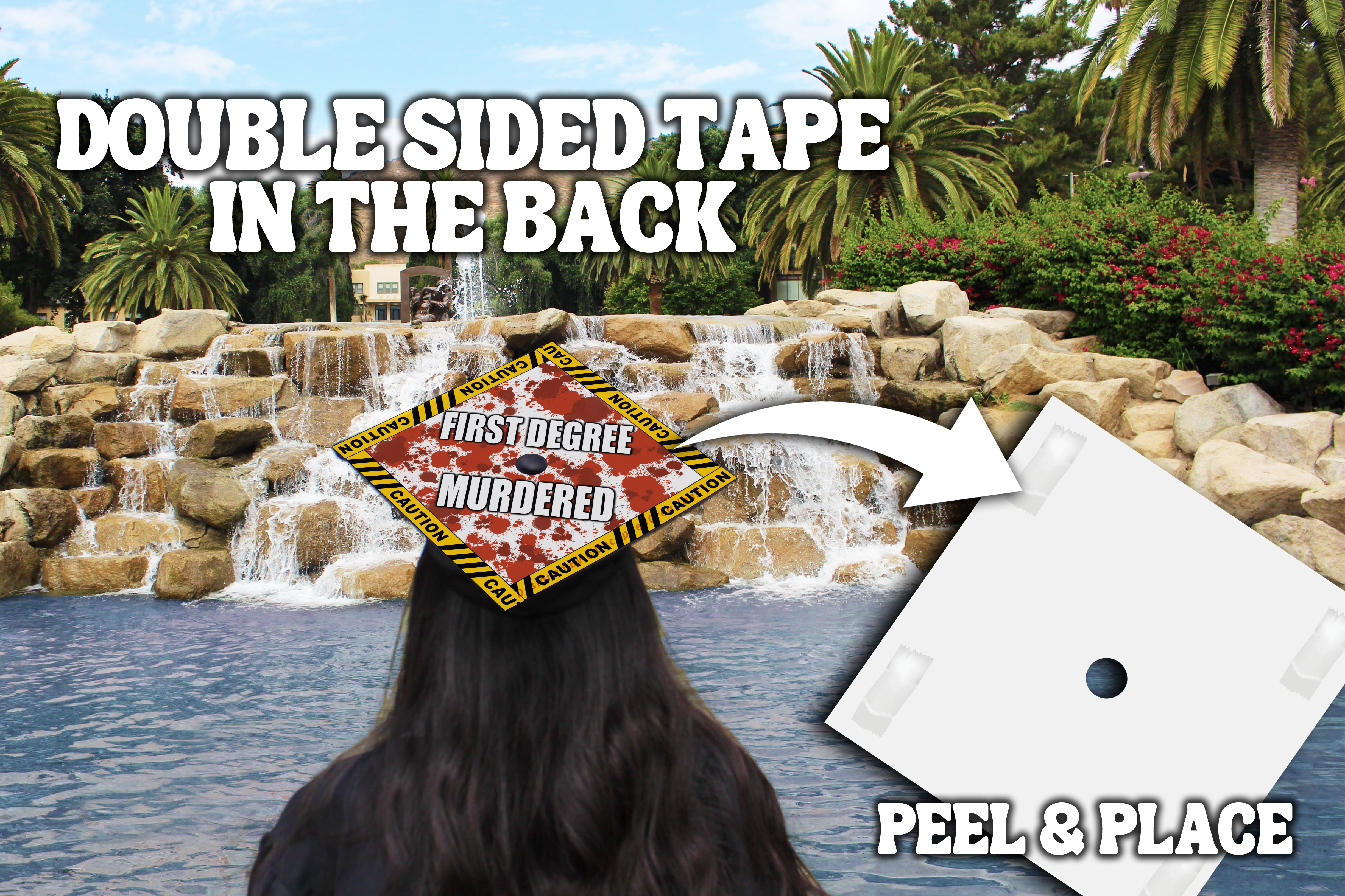 Design is 9.5 x 9.5 inches with an approximate 1 inch hole in the center and double sided adhesive in the back. Design is printed on cardstock, not hand painted. The topper will fit the standard 9 x 9 inches graduation cap / mortar board. Cap is not included.