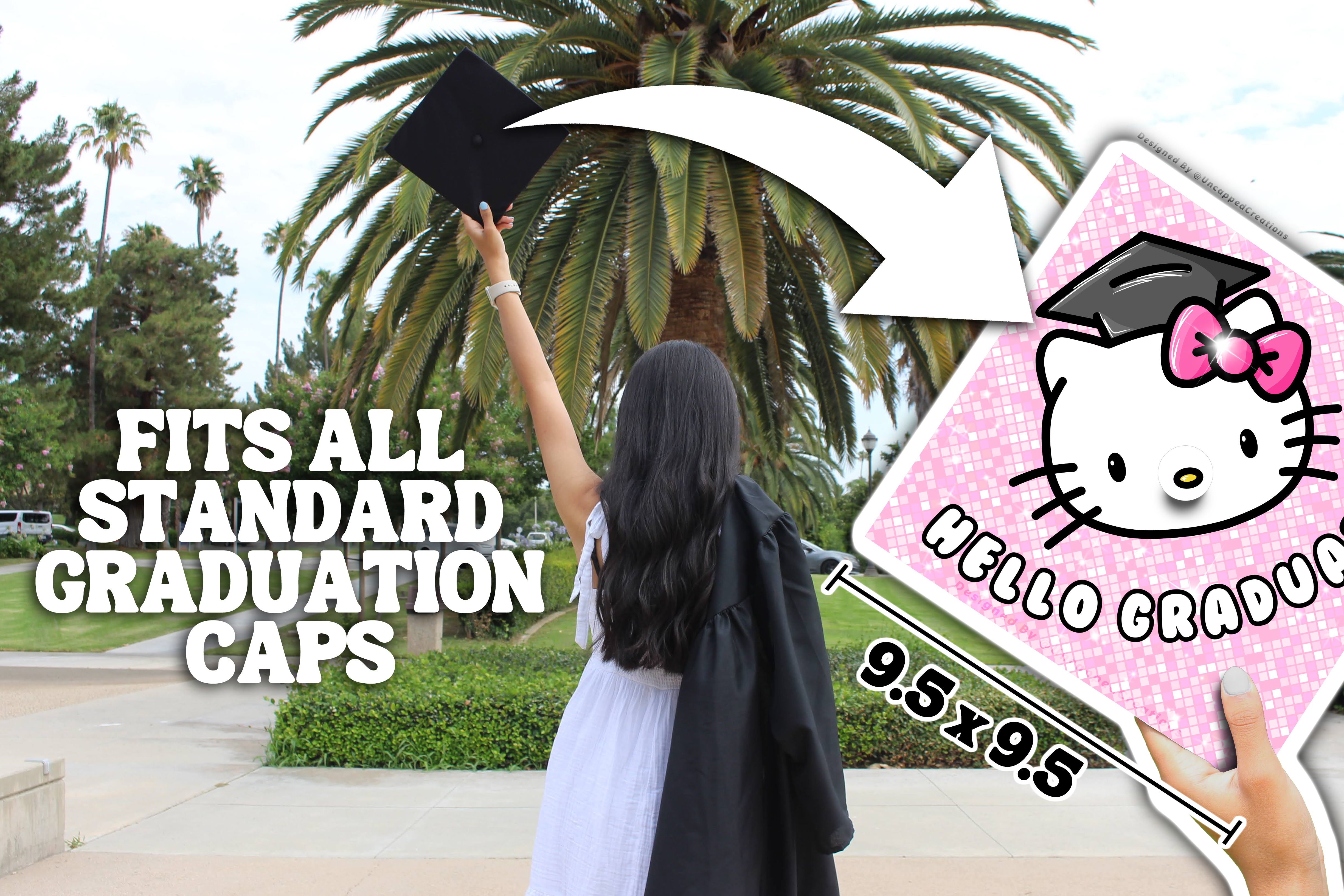 Design is 9.5 x 9.5 inches with an approximate 1 inch hole in the center and double sided adhesive in the back. Design is printed on cardstock, not hand painted. The topper will fit the standard 9 x 9 inches graduation cap / mortar board. Cap/Mortar board is not included. Center circle is not included.