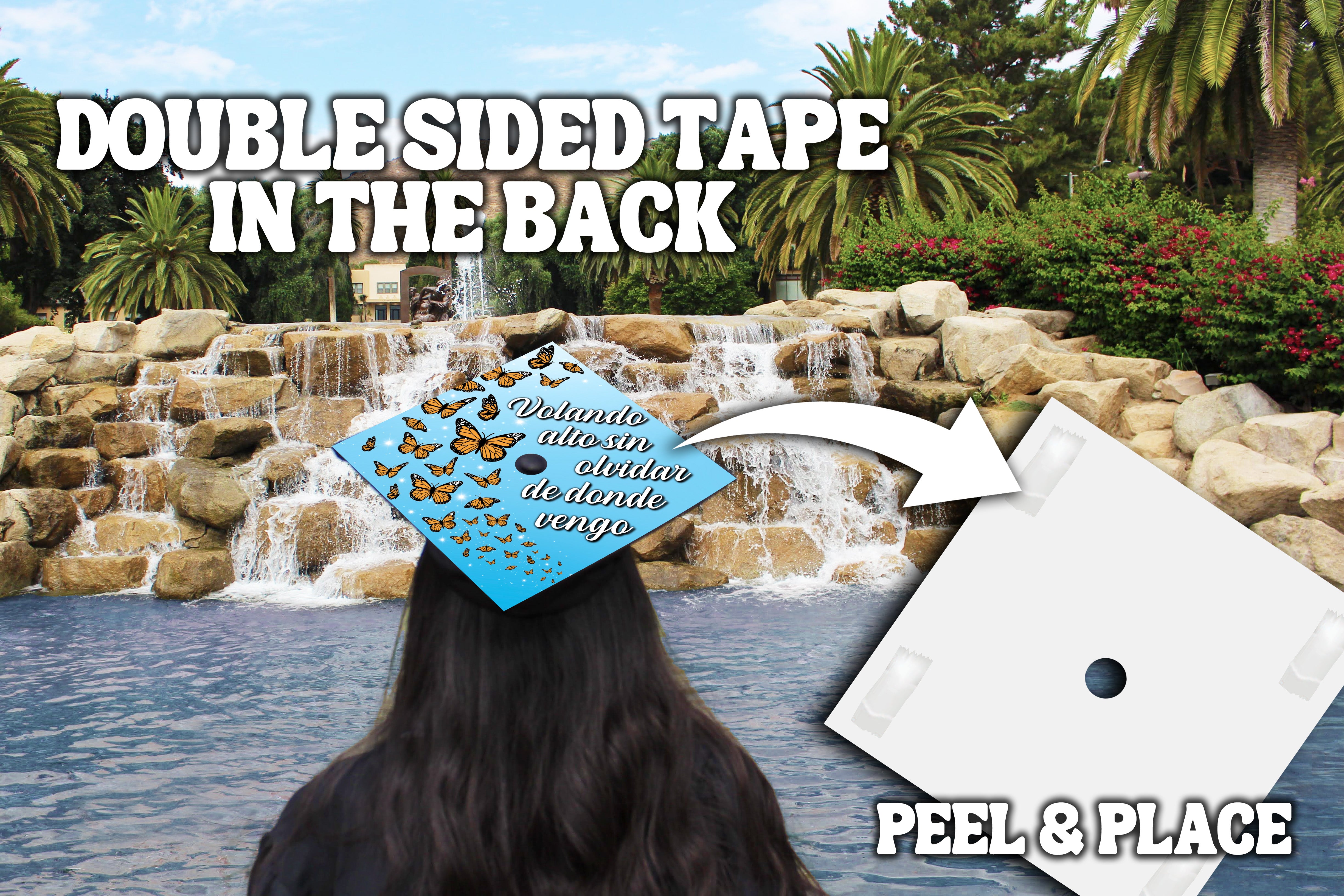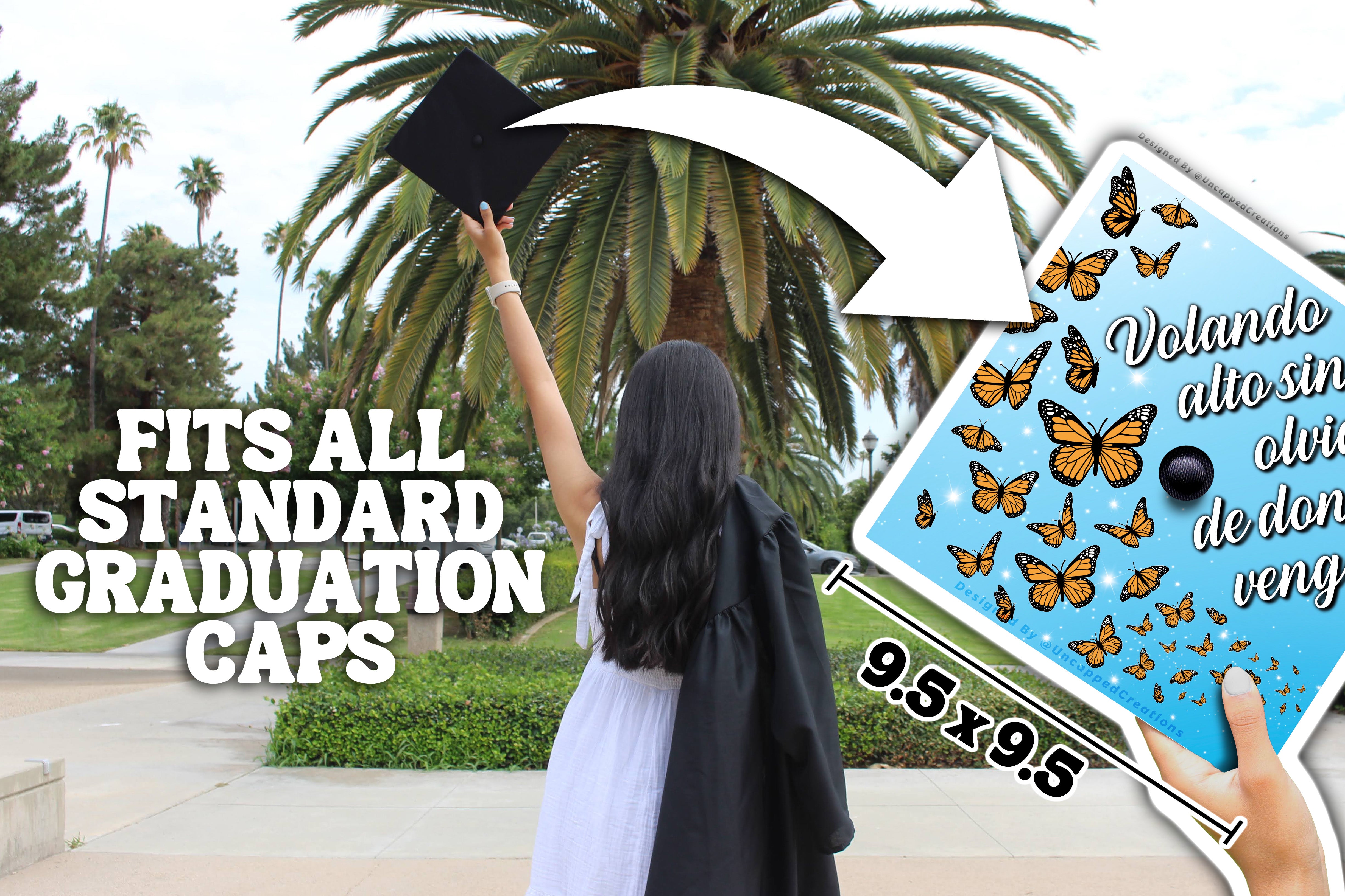 Design is 9.5 x 9.5 inches with an approximate 1 inch hole in the center and double sided adhesive in the back. Design is printed on cardstock, not hand painted. The topper will fit the standard 9 x 9 inches graduation cap / mortar board. Cap/Mortar board is not included. Center circle is not included.