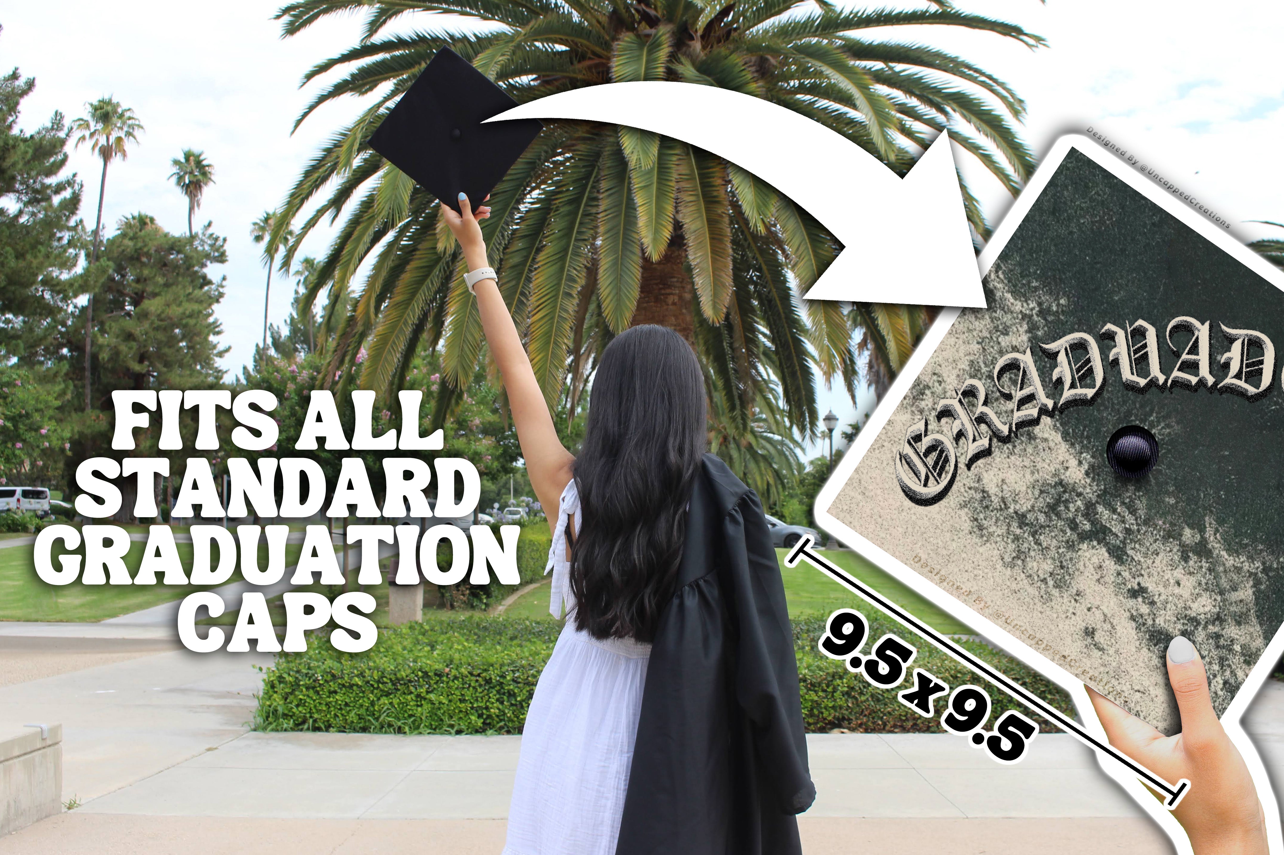 Design is 9.5 x 9.5 inches with an approximate 1 inch hole in the center and double sided adhesive in the back. Design is printed on cardstock, not hand painted. The topper will fit the standard 9 x 9 inches graduation cap / mortar board. Cap/Mortar board is not included. Center circle is not included.