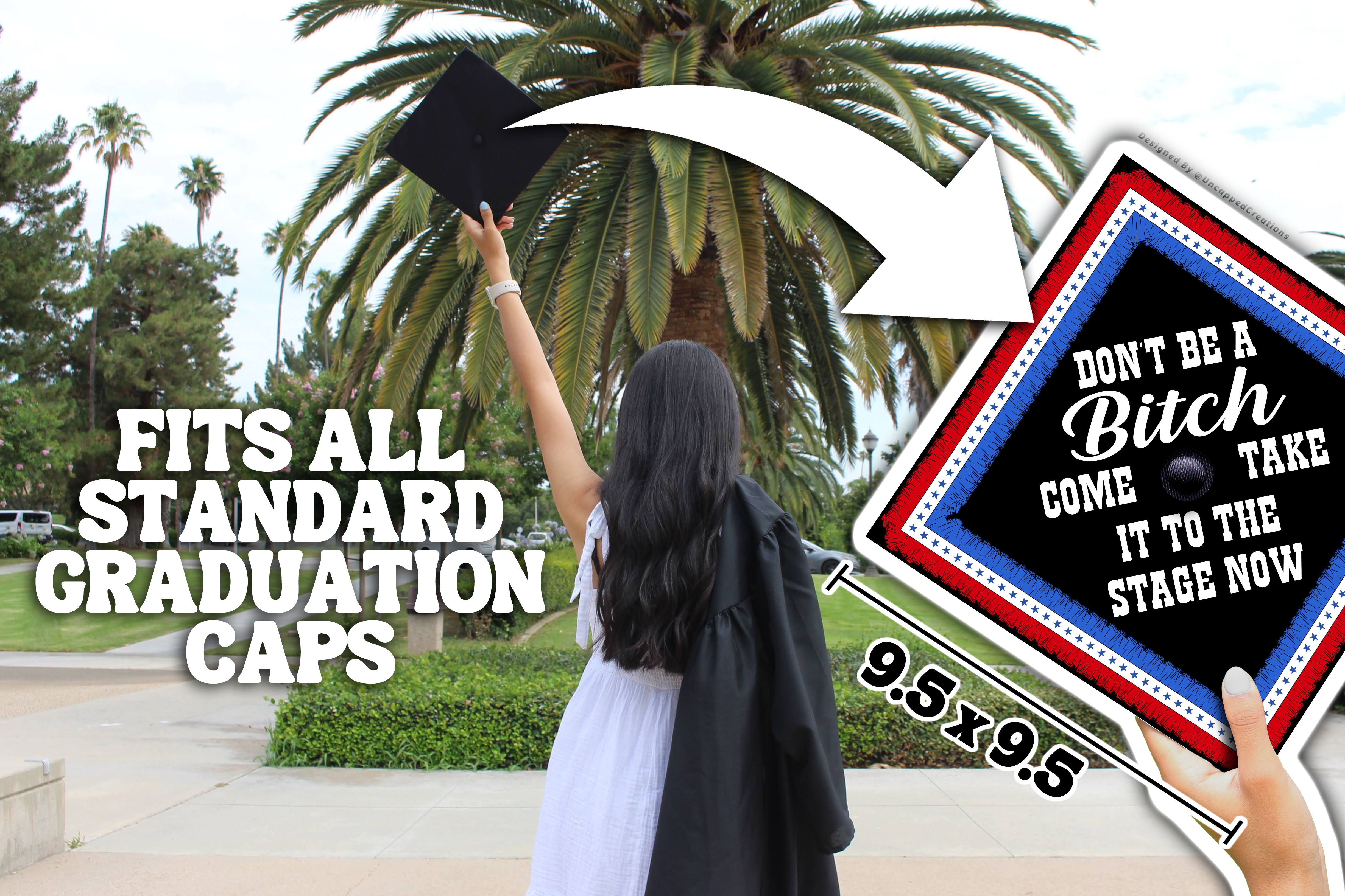 Design is 9.5 x 9.5 inches with an approximate 1 inch hole in the center and double sided adhesive in the back. Design is printed on cardstock, not hand painted. The topper will fit the standard 9 x 9 inches graduation cap / mortar board. Cap/Mortar board is not included. Center circle is not included.