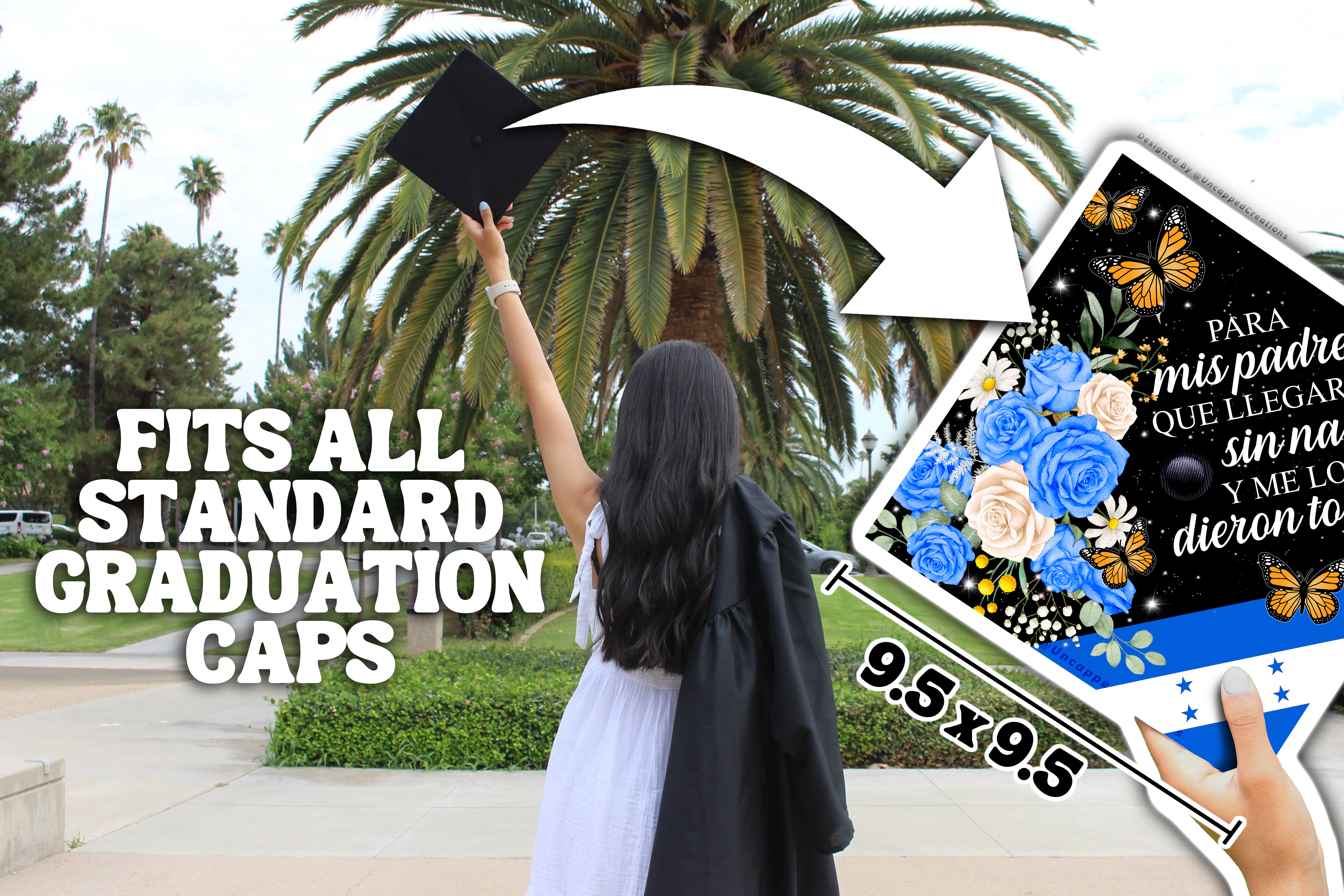 Design is 9.5 x 9.5 inches with an approximate 1 inch hole in the center and double sided adhesive in the back. Design is printed on cardstock, not hand painted. The topper will fit the standard 9 x 9 inches graduation cap / mortar board. Cap is not included.