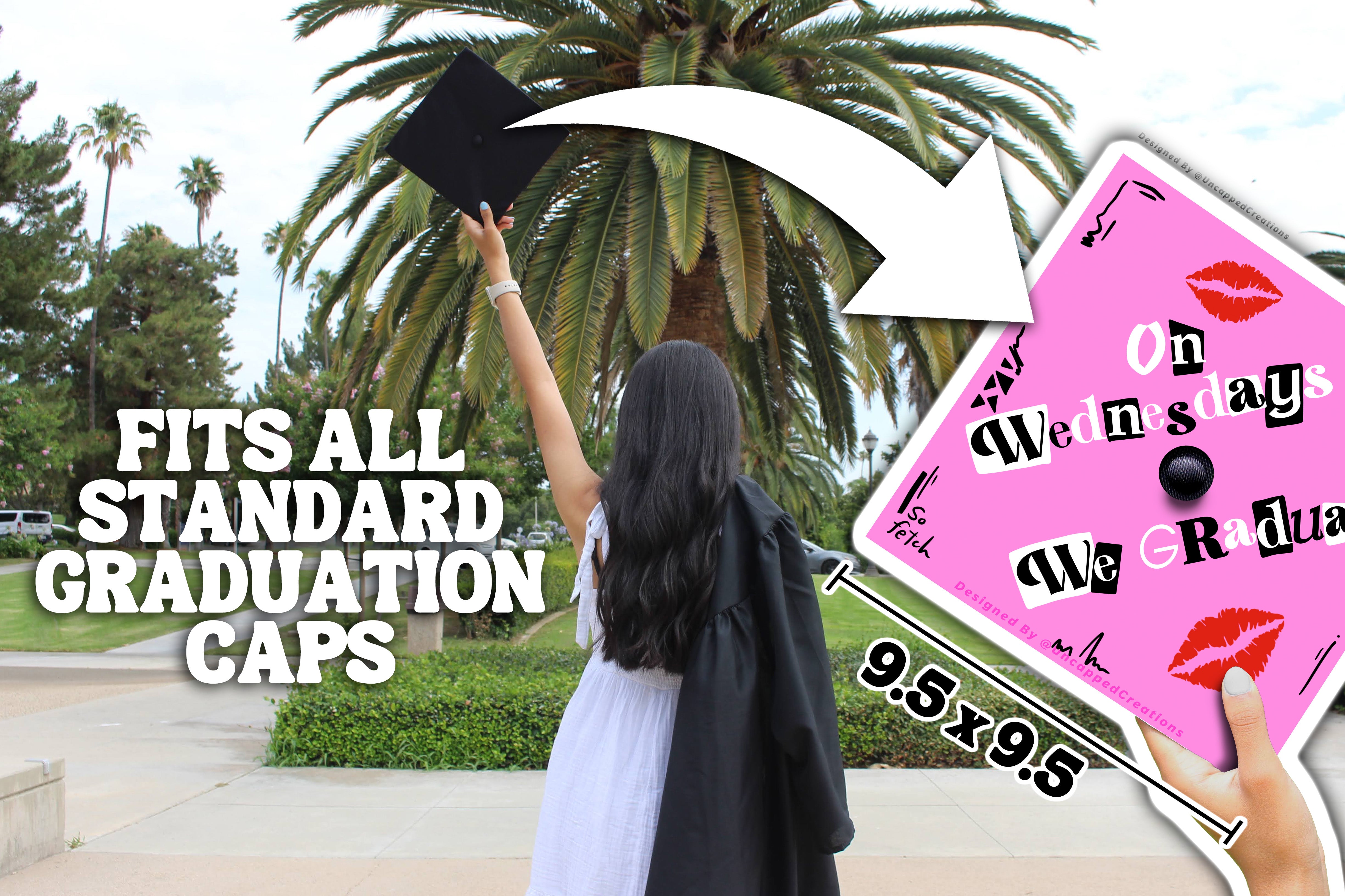Design is 9.5 x 9.5 inches with an approximate 1 inch hole in the center and double sided adhesive in the back. Design is printed on cardstock, not hand painted. The topper will fit the standard 9 x 9 inches graduation cap / mortar board. Cap is not included.