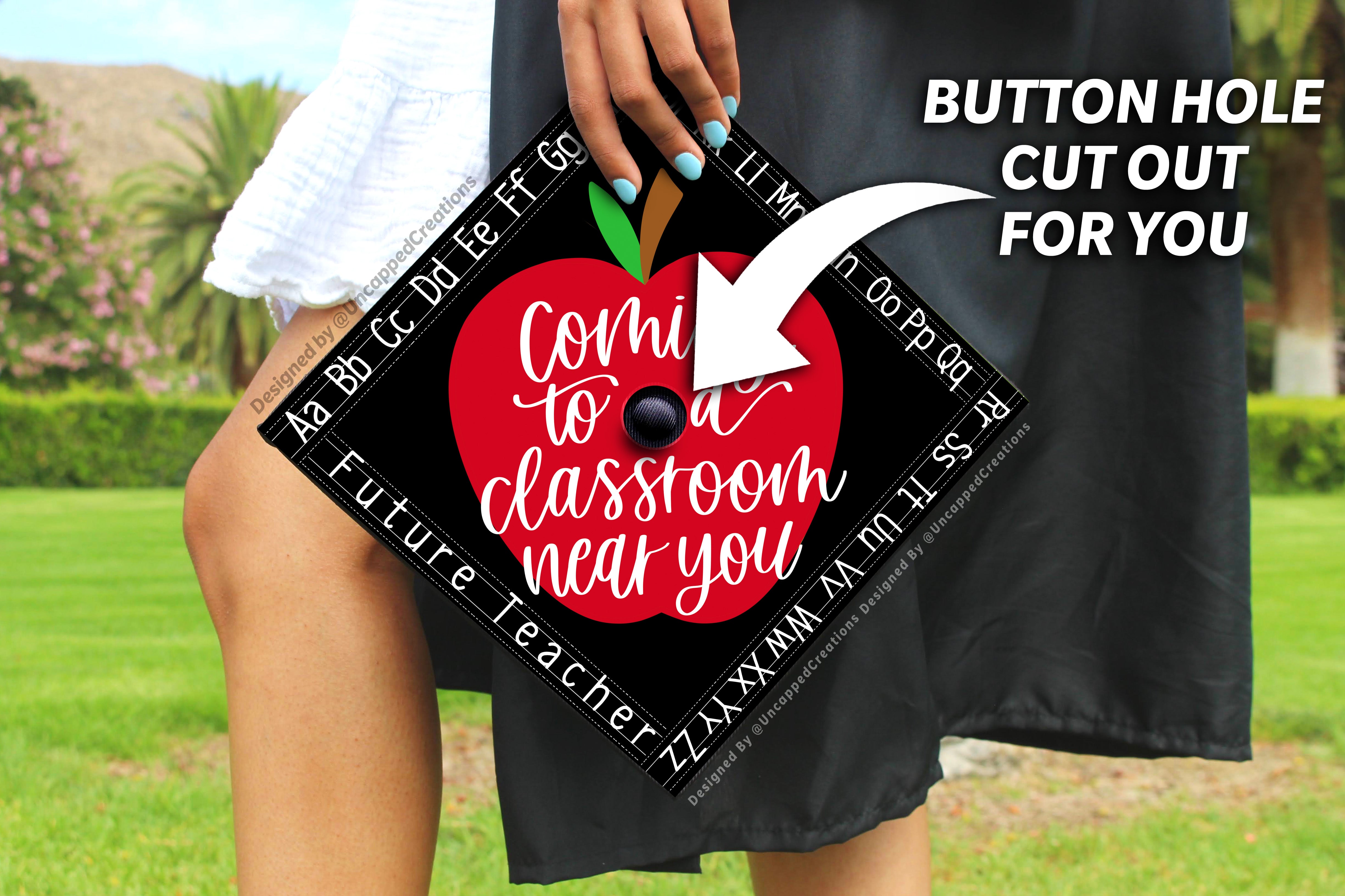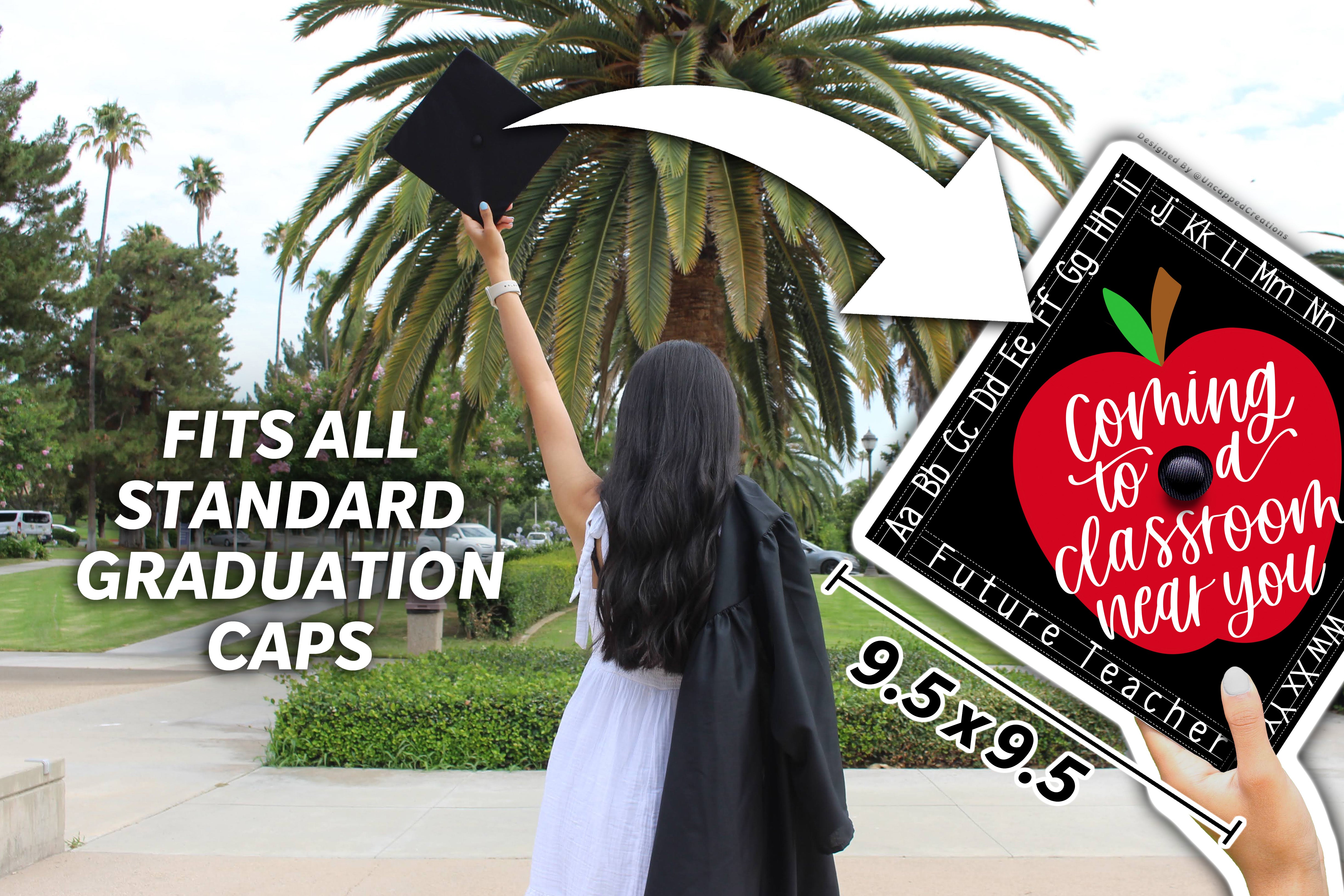 Design is 9.5 x 9.5 inches with an approximate 1 inch hole in the center and double sided adhesive in the back. Design is printed on cardstock, not hand painted. The topper will fit the standard 9 x 9 inches graduation cap / mortar board. Cap/Mortar board is not included. Center circle is not included.