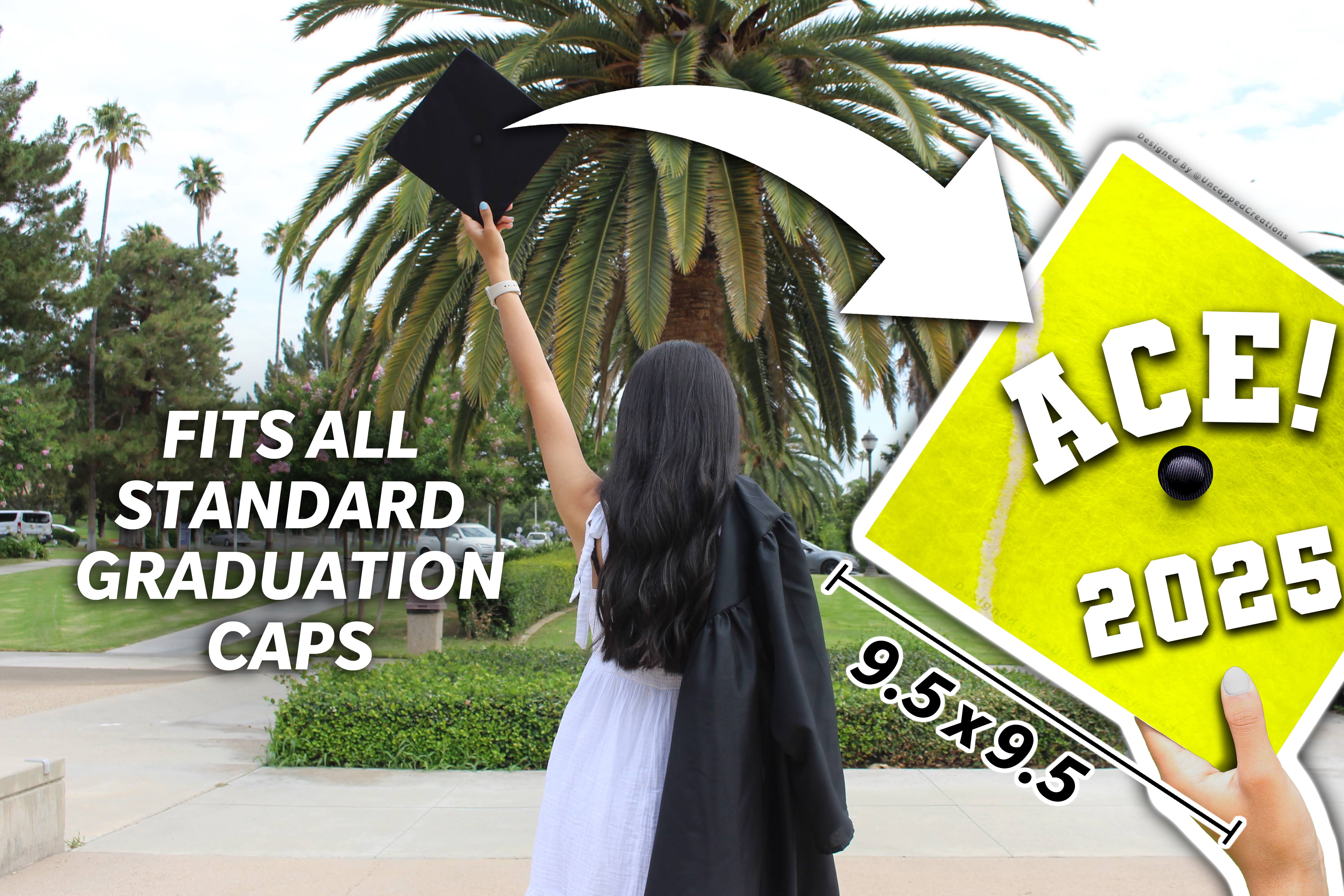 Design is 9.5 x 9.5 inches with an approximate 1 inch hole in the center and double sided adhesive in the back. Design is printed on cardstock, not hand painted. The topper will fit the standard 9 x 9 inches graduation cap / mortar board. Cap/Mortar board is not included. Center circle is not included.