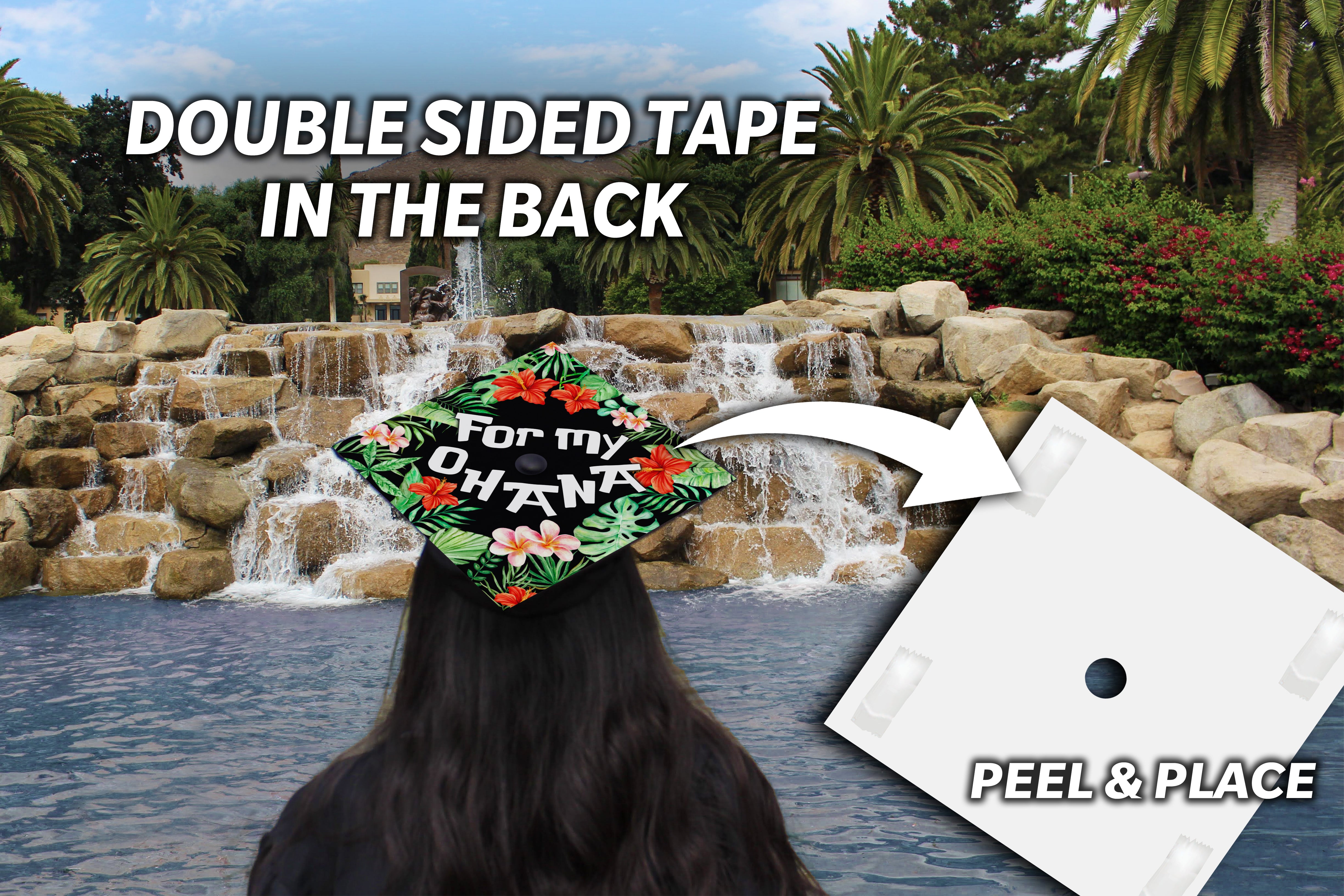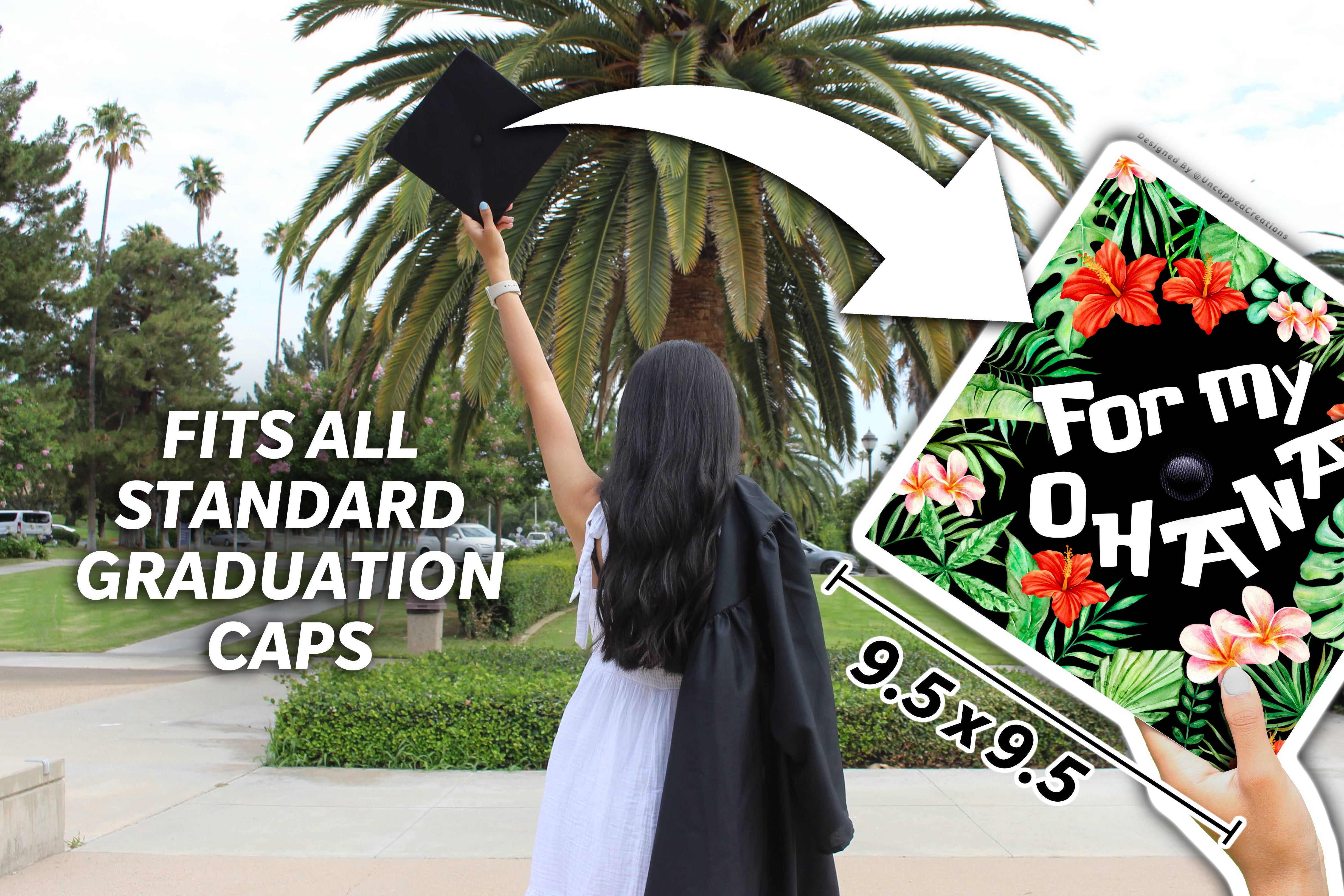 Design is 9.5 x 9.5 inches with an approximate 1 inch hole in the center and double sided adhesive in the back. Design is printed on cardstock, not hand painted. The topper will fit the standard 9 x 9 inches graduation cap / mortar board. Cap/Mortar board is not included. Center circle is not included.