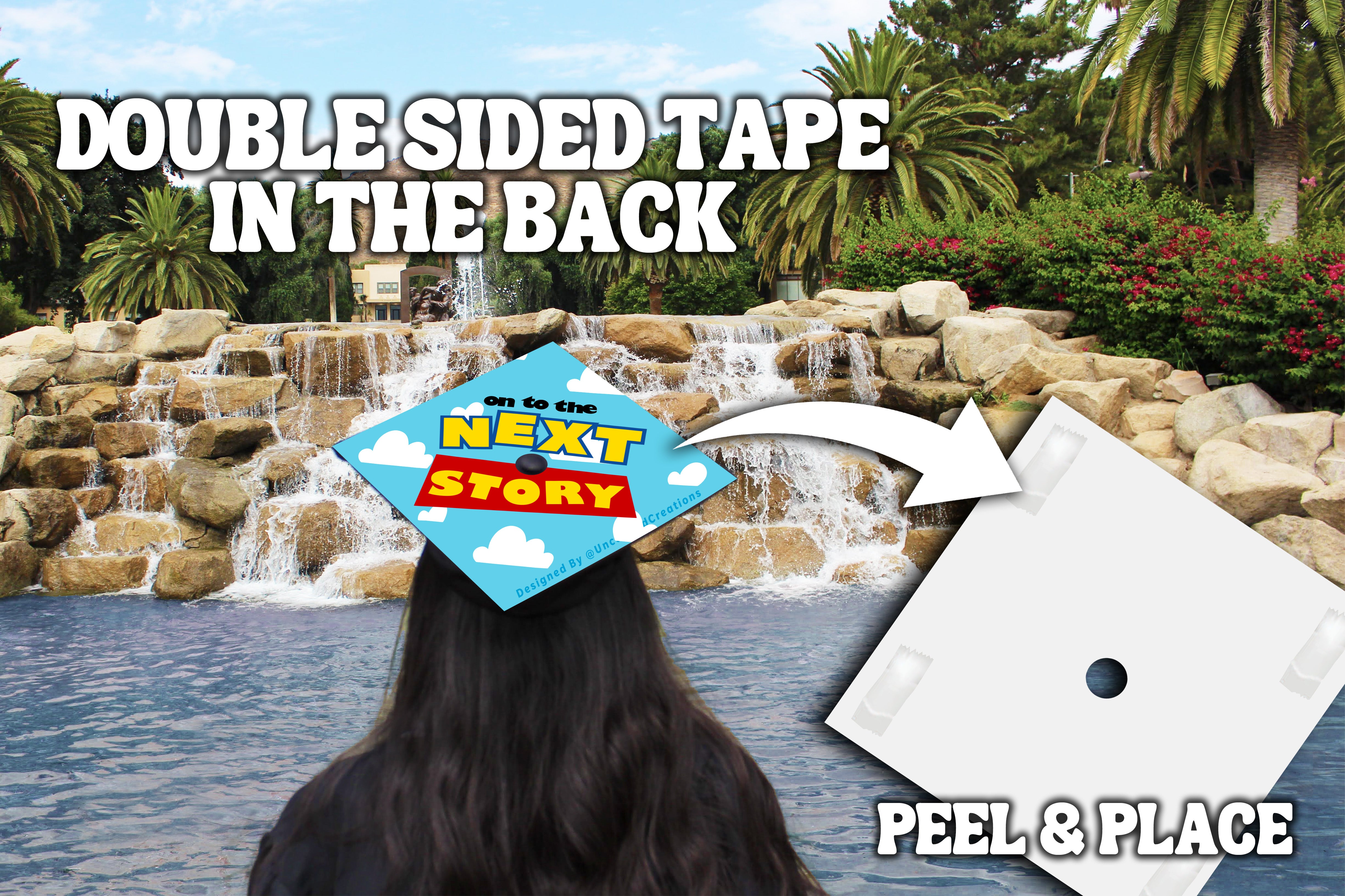 Design is 9.5 x 9.5 inches with an approximate 1 inch hole in the center and double sided adhesive in the back. Design is printed on cardstock, not hand painted. The topper will fit the standard 9 x 9 inches graduation cap / mortar board. Cap is not included.