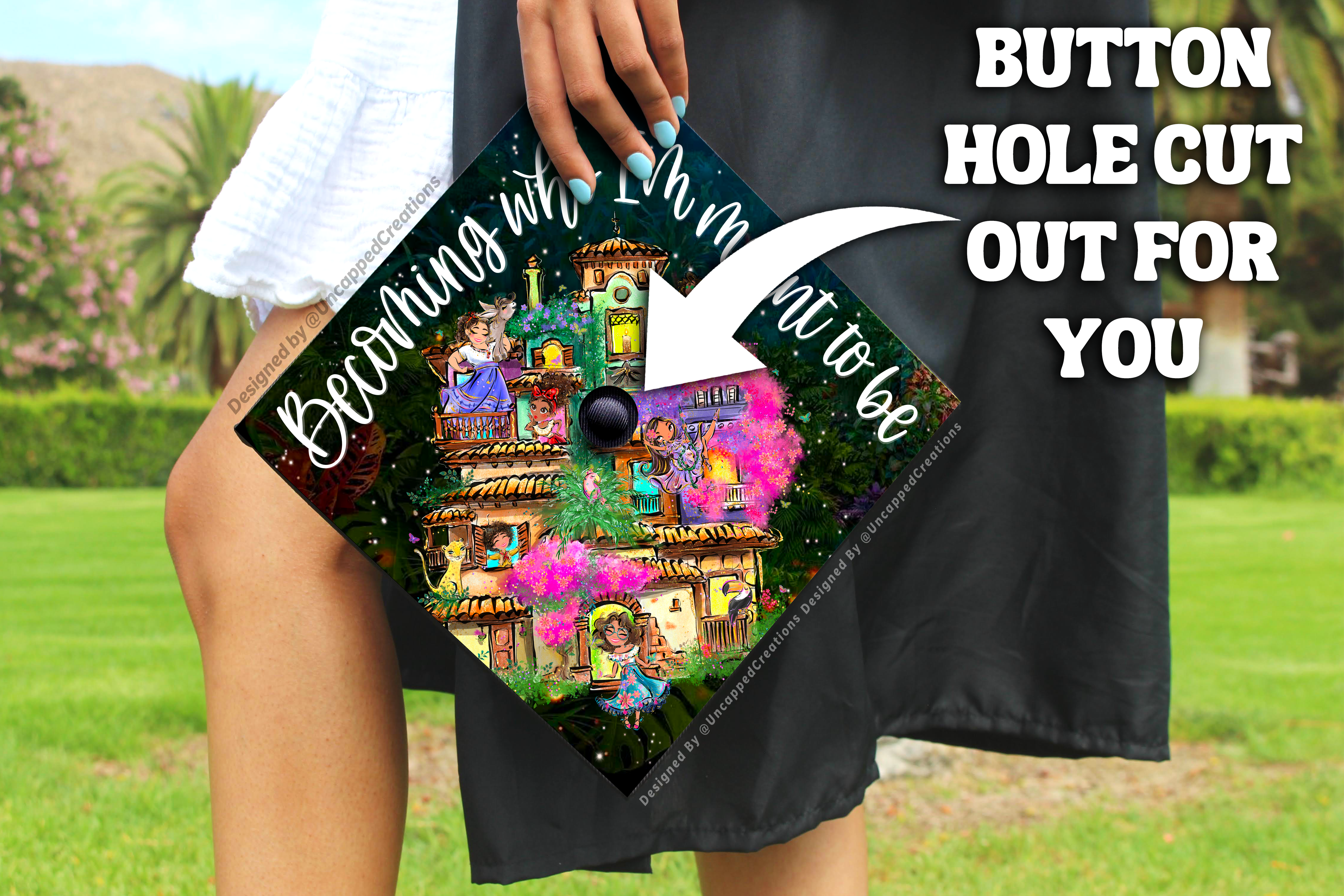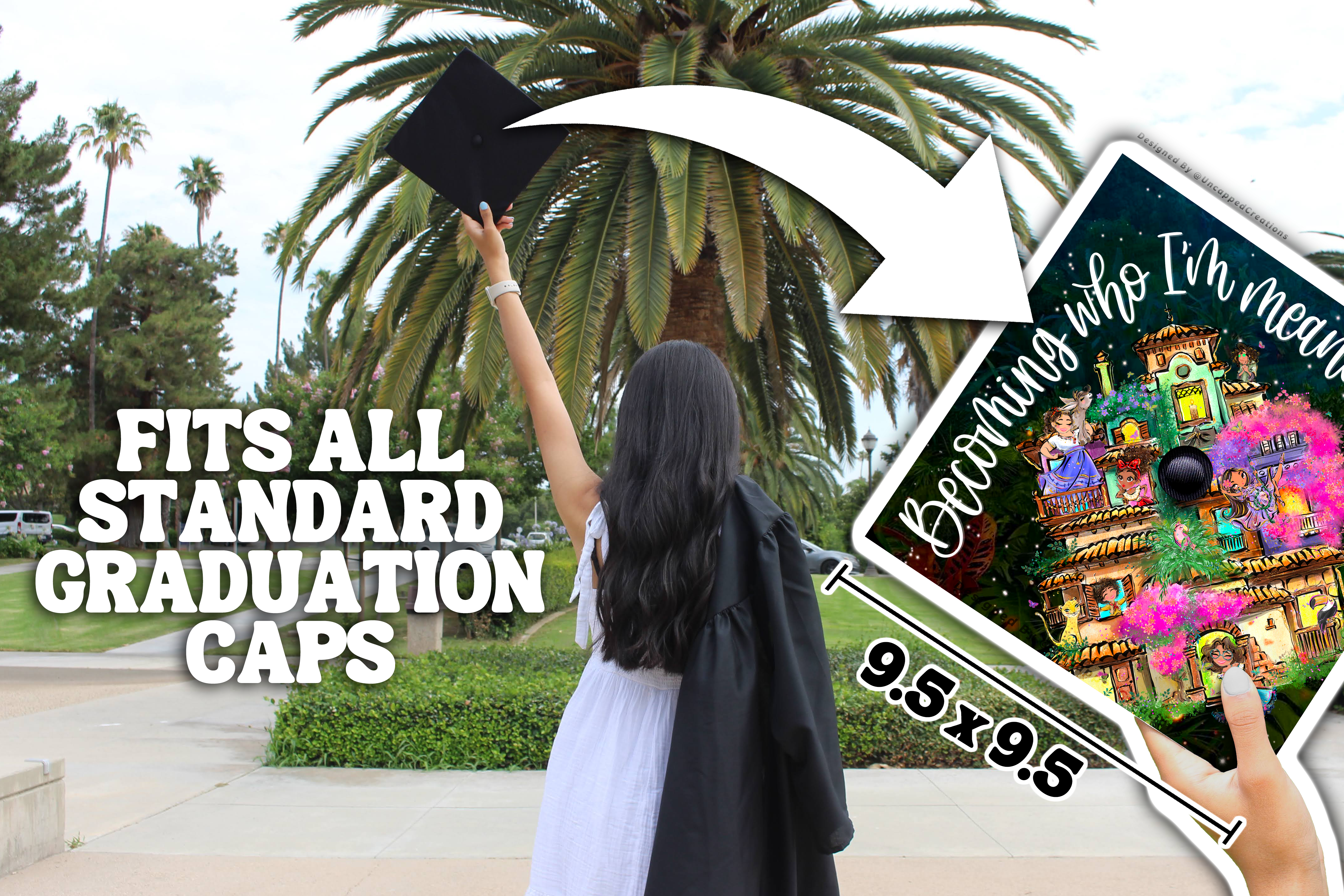 Design is 9.5 x 9.5 inches with an approximate 1 inch hole in the center and double sided adhesive in the back. Design is printed on cardstock, not hand painted. The topper will fit the standard 9 x 9 inches graduation cap / mortar board. Cap/Mortar board is not included. Center circle is not included.