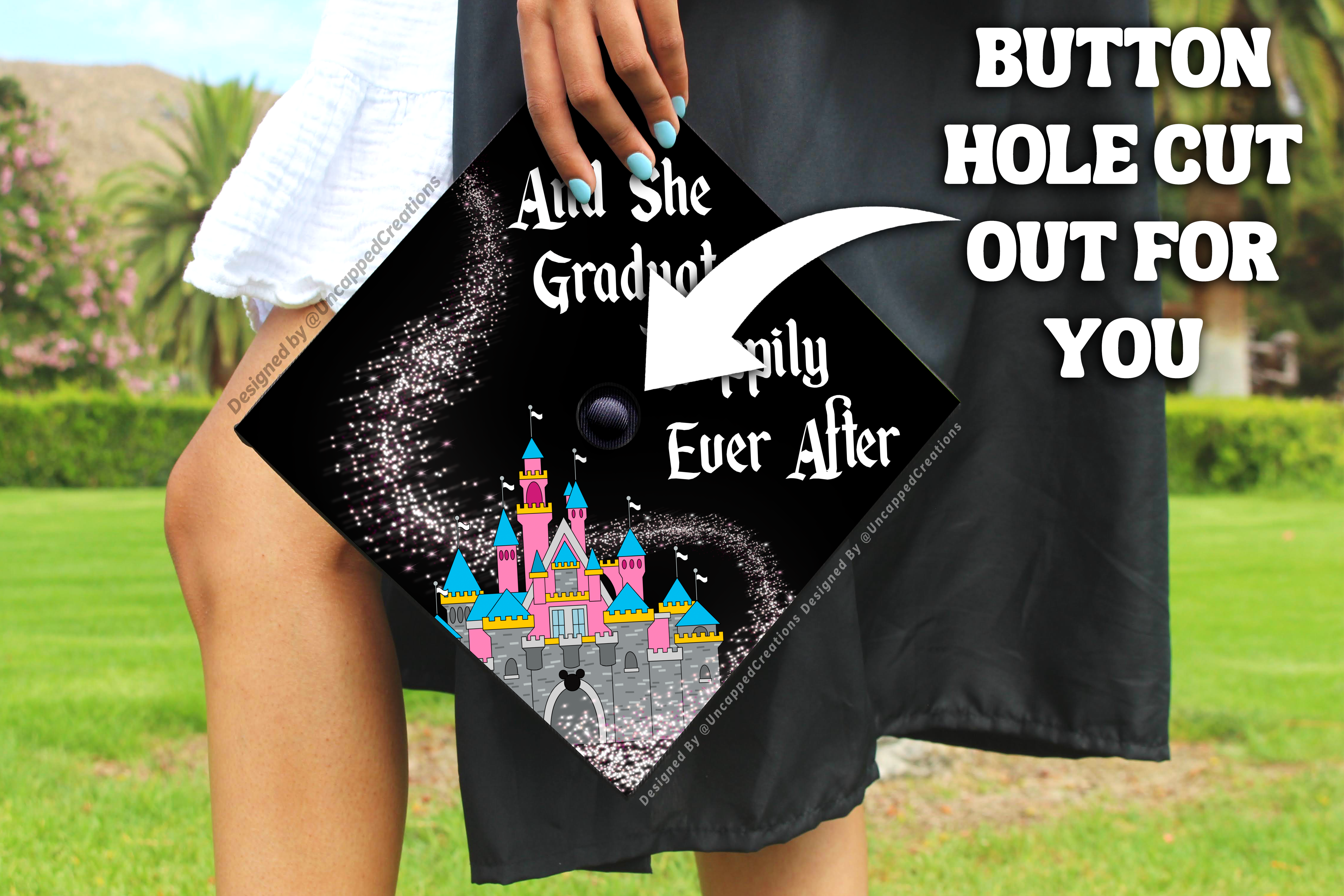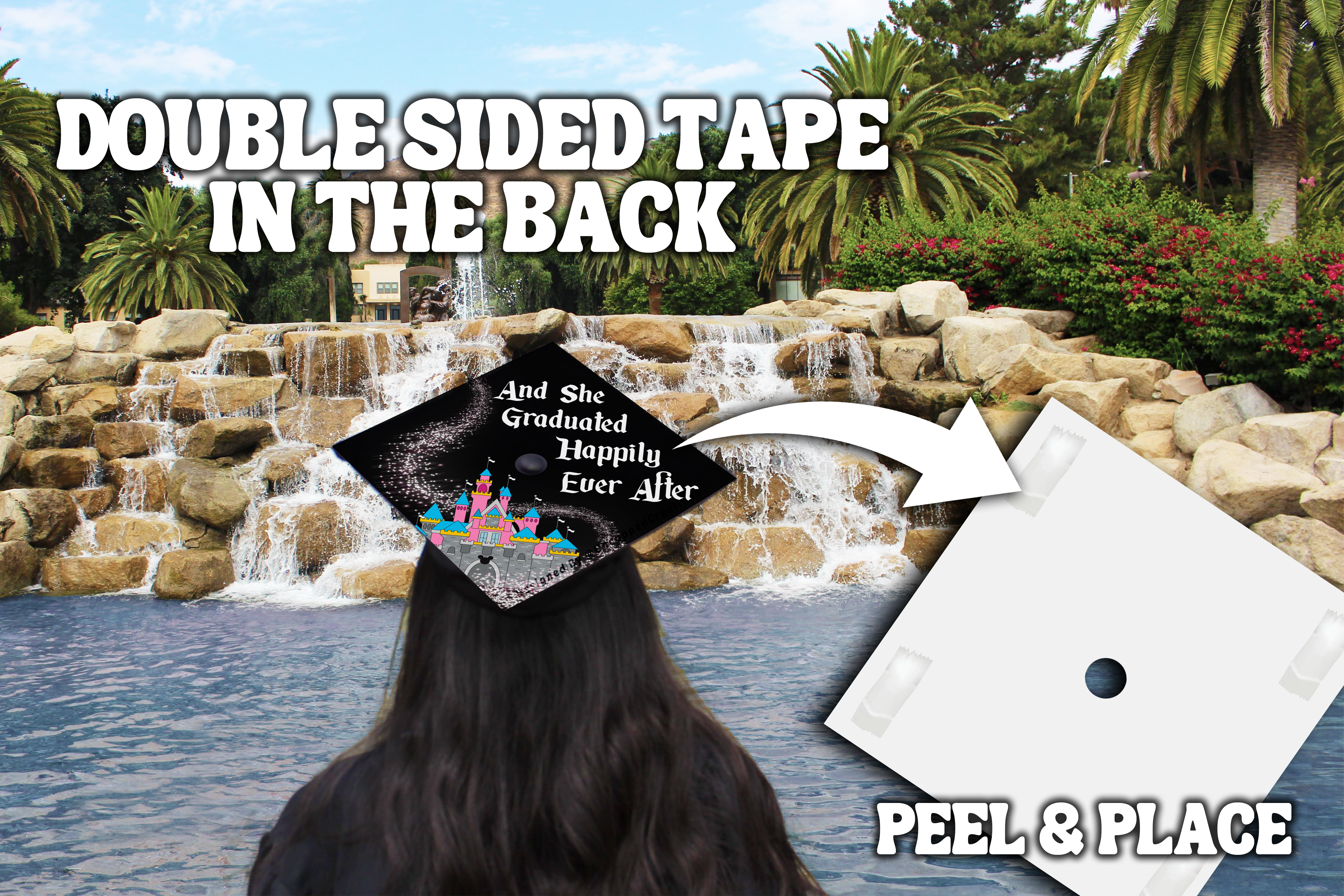 Design is 9.5 x 9.5 inches with an approximate 1 inch hole in the center and double sided adhesive in the back. Design is printed on cardstock, not hand painted. The topper will fit the standard 9 x 9 inches graduation cap / mortar board. Cap/Mortar board is not included. Center circle is not included.