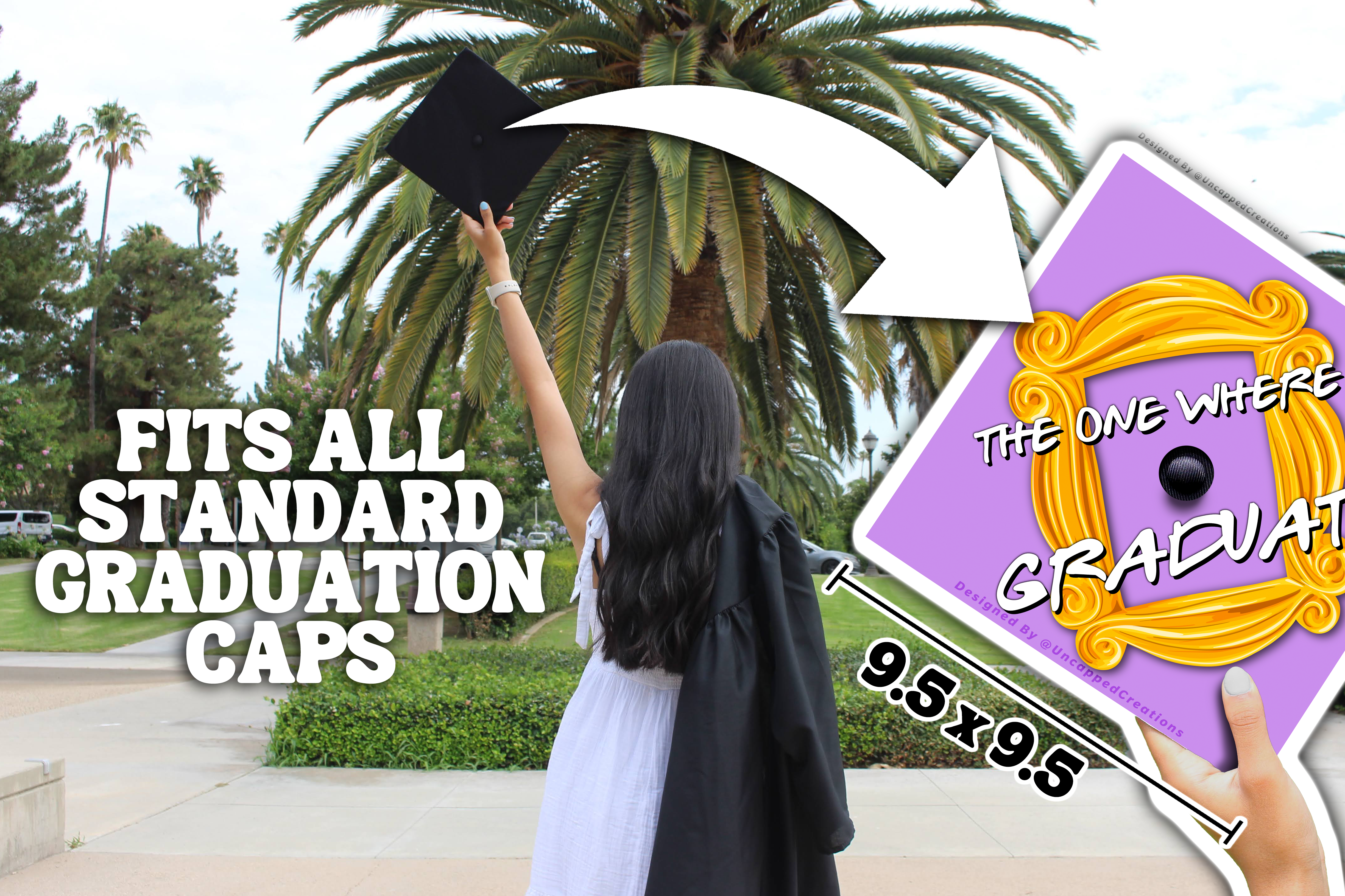 Design is 9.5 x 9.5 inches with an approximate 1 inch hole in the center and double sided adhesive in the back. Design is printed on cardstock, not hand painted. The topper will fit the standard 9 x 9 inches graduation cap / mortar board. Cap/Mortar board is not included. Center circle is not included.