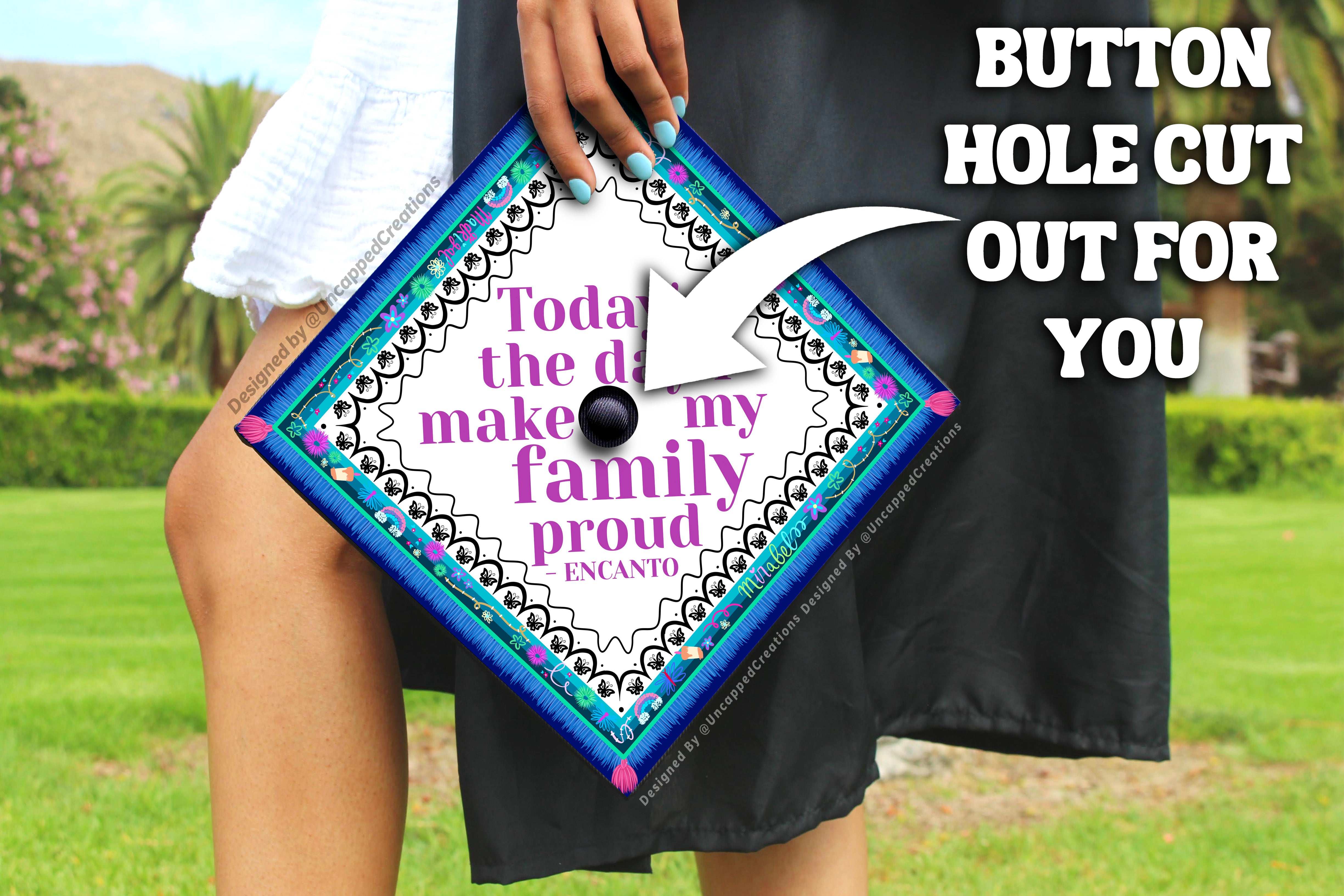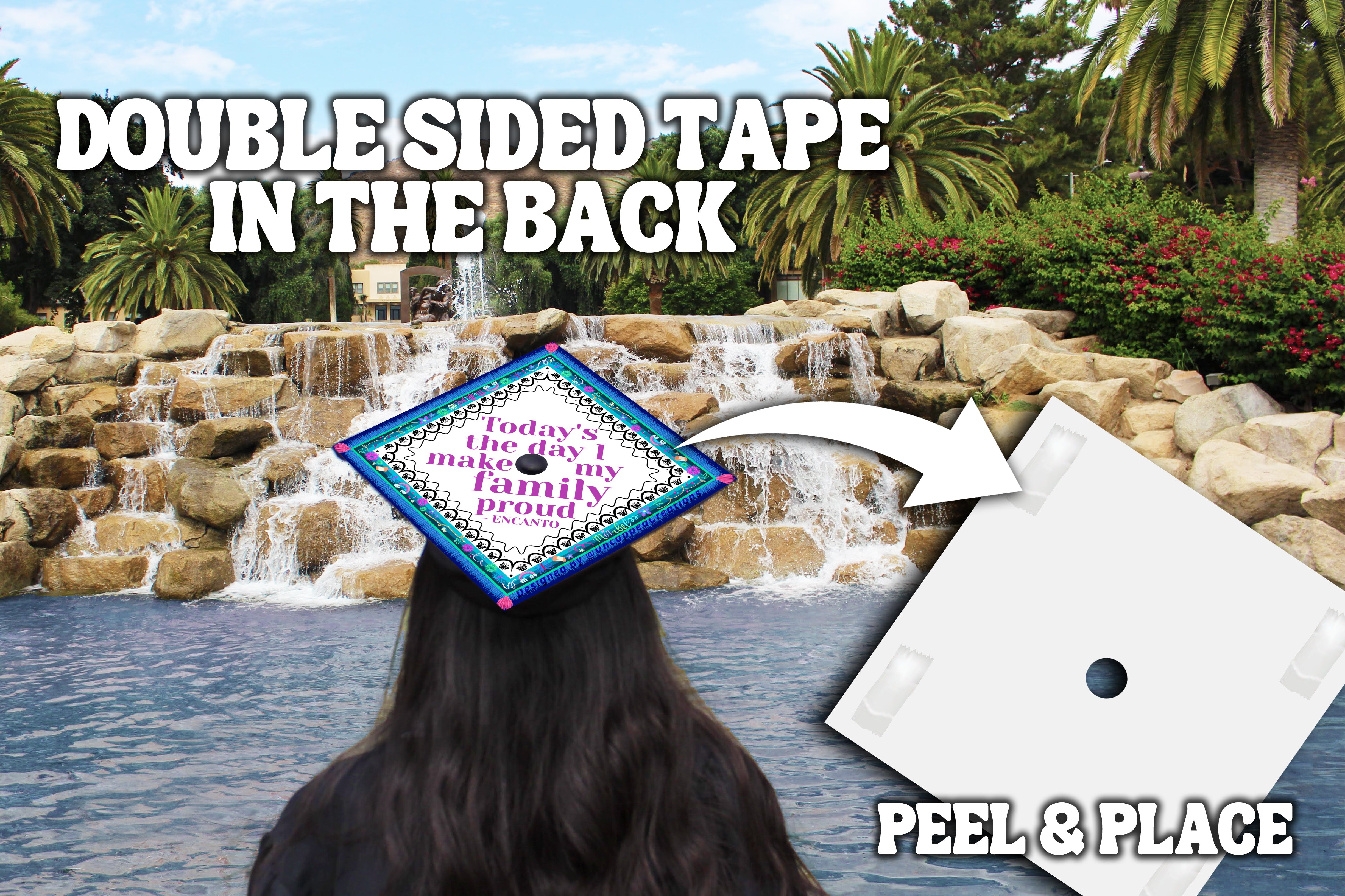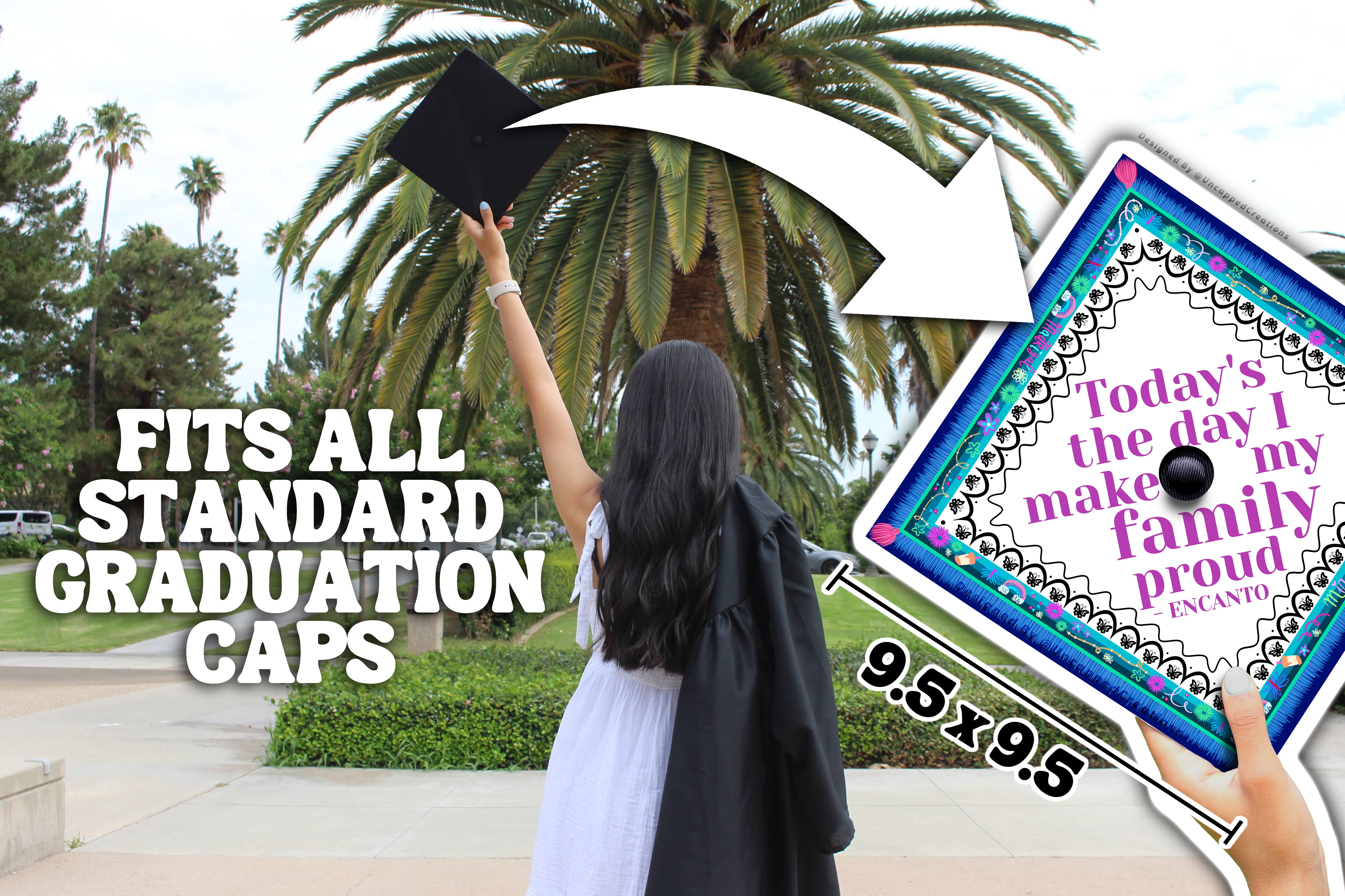 Design is 9.5 x 9.5 inches with an approximate 1 inch hole in the center and double sided adhesive in the back. Design is printed on cardstock, not hand painted. The topper will fit the standard 9 x 9 inches graduation cap / mortar board. Cap/Mortar board is not included. Center circle is not included.