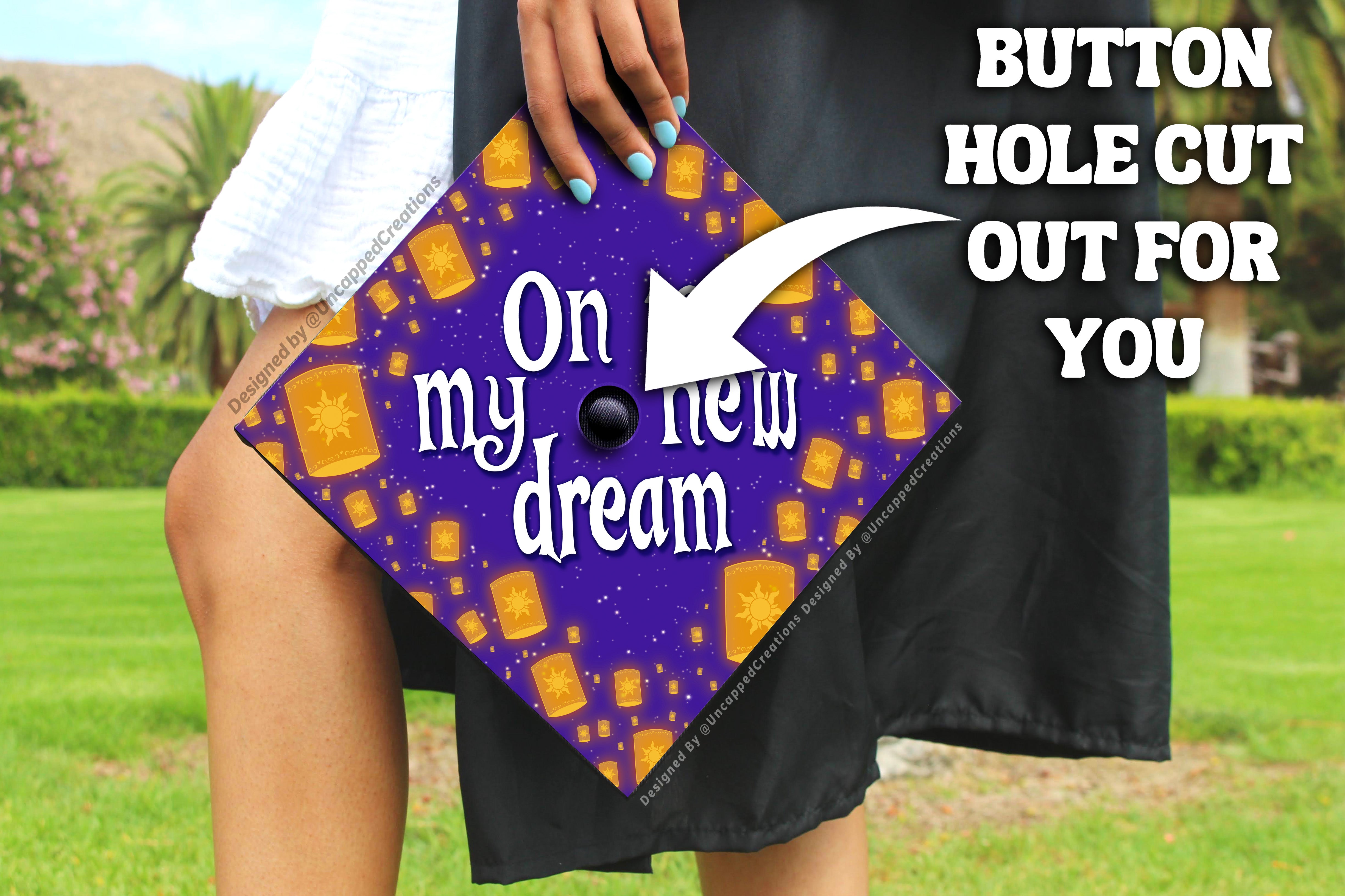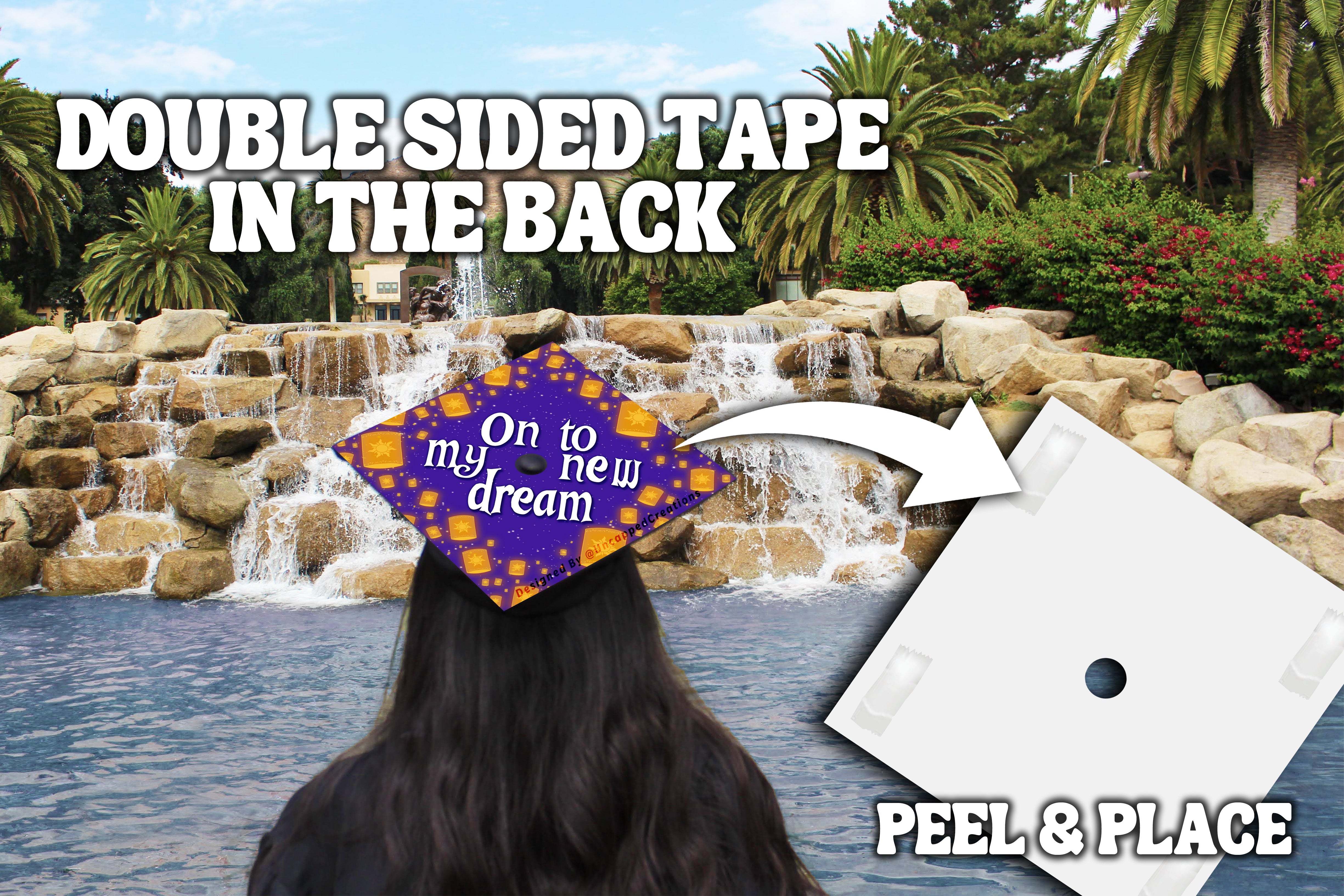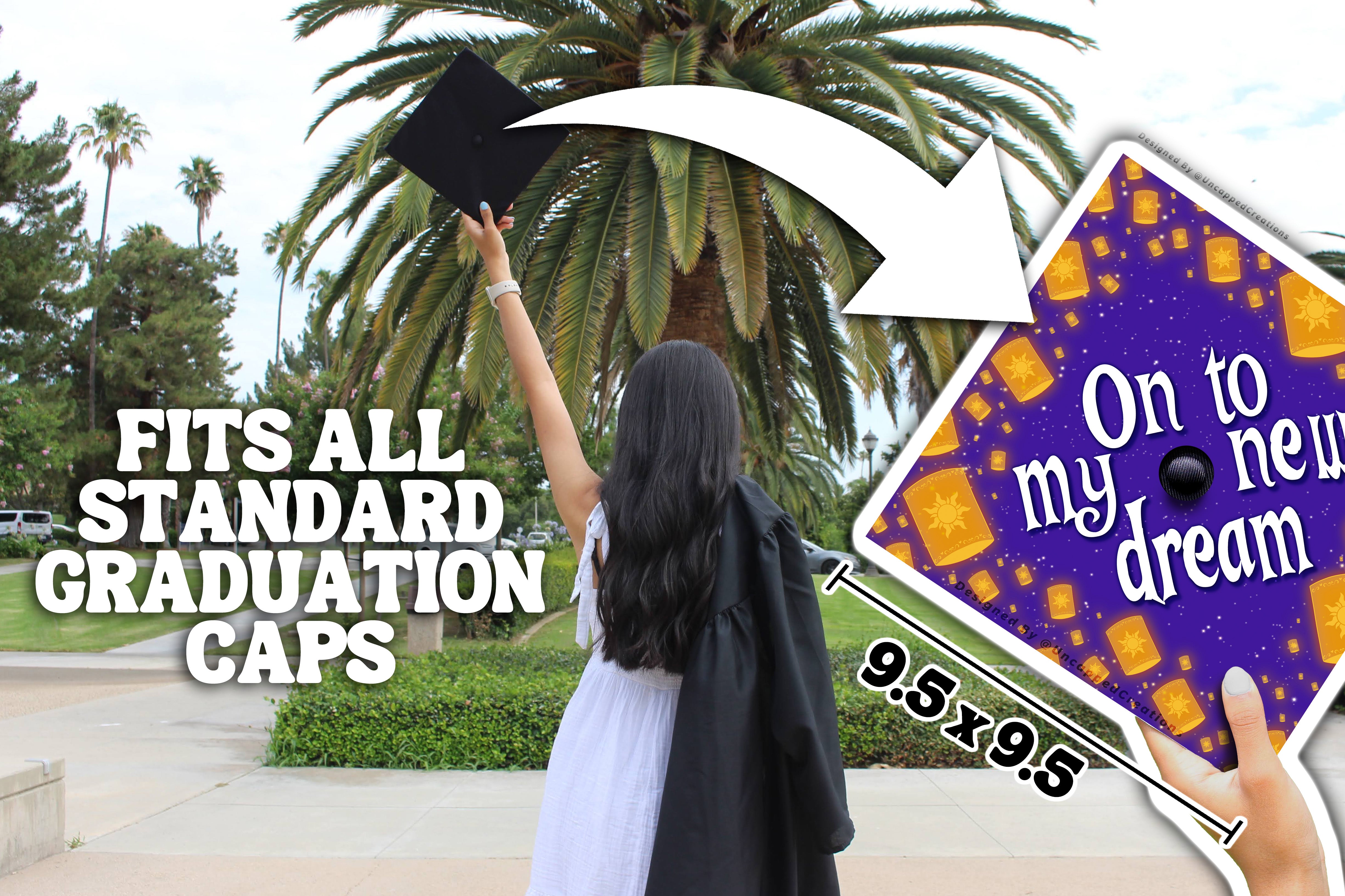 Design is 9.5 x 9.5 inches with an approximate 1 inch hole in the center and double sided adhesive in the back. Design is printed on cardstock, not hand painted. The topper will fit the standard 9 x 9 inches graduation cap / mortar board. Cap/Mortar board is not included. Center circle is not included.
