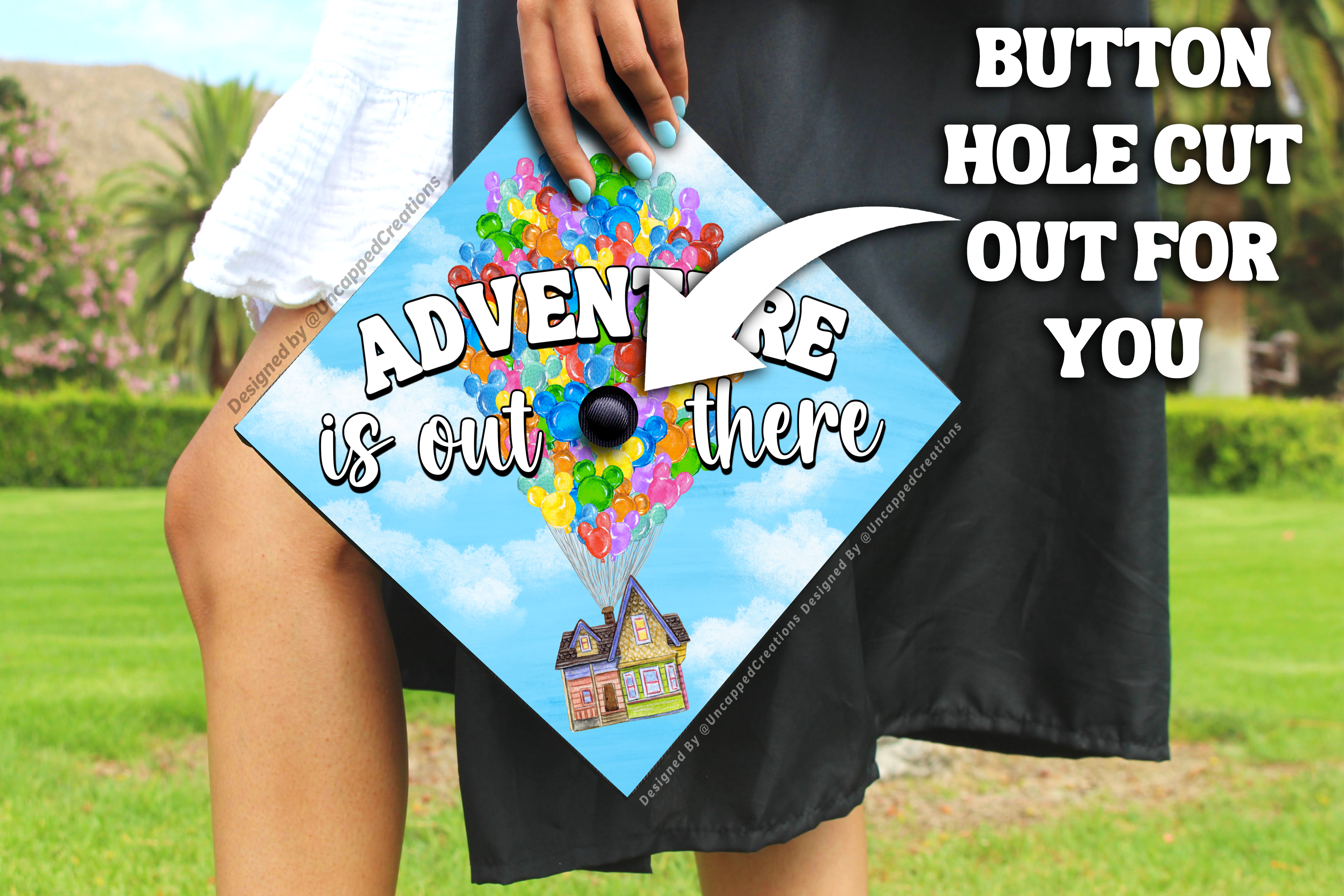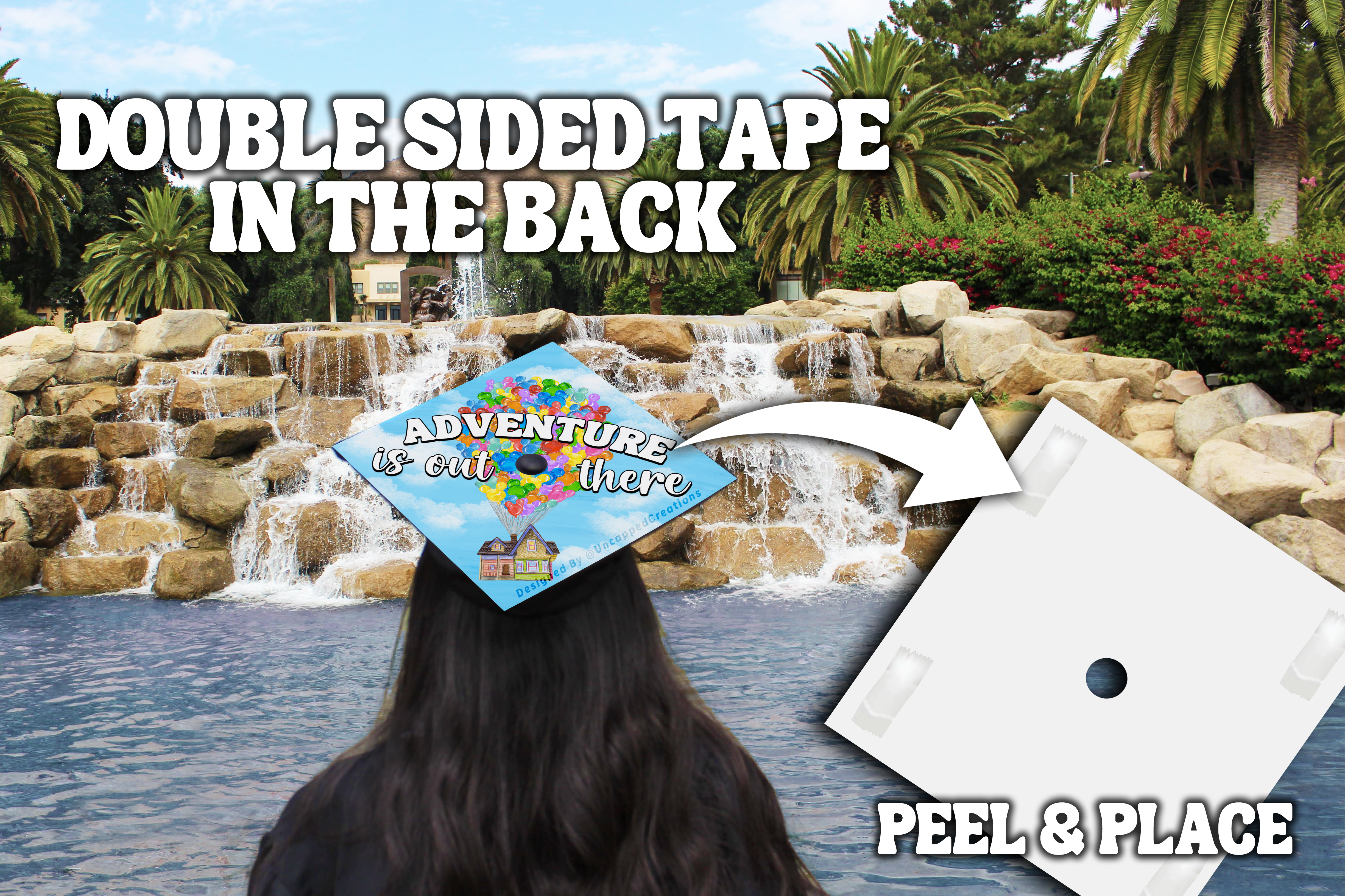 Design is 9.5 x 9.5 inches with an approximate 1 inch hole in the center and double sided adhesive in the back. Design is printed on cardstock, not hand painted. The topper will fit the standard 9 x 9 inches graduation cap / mortar board. Cap/Mortar board is not included. Center circle is not included.