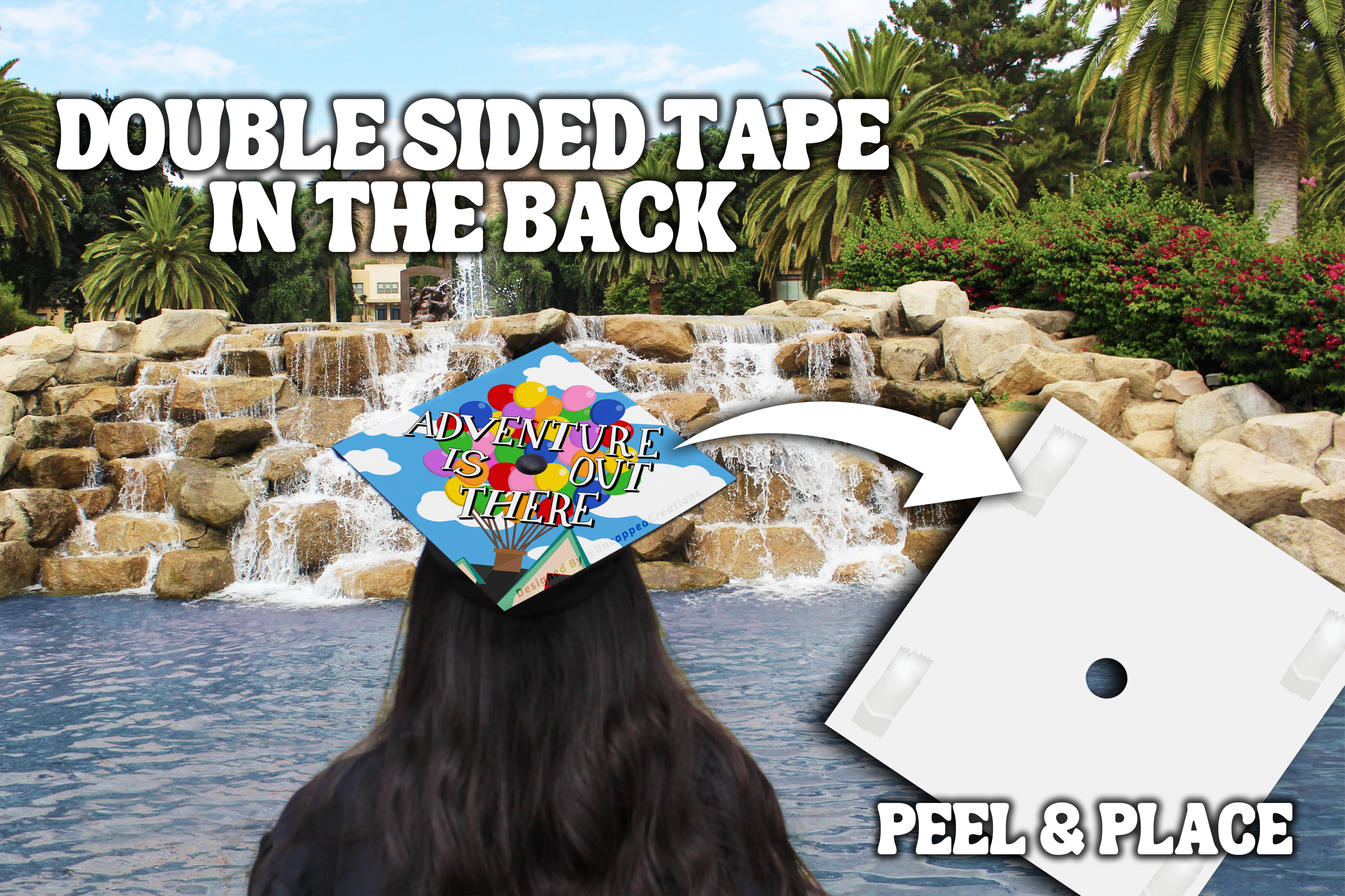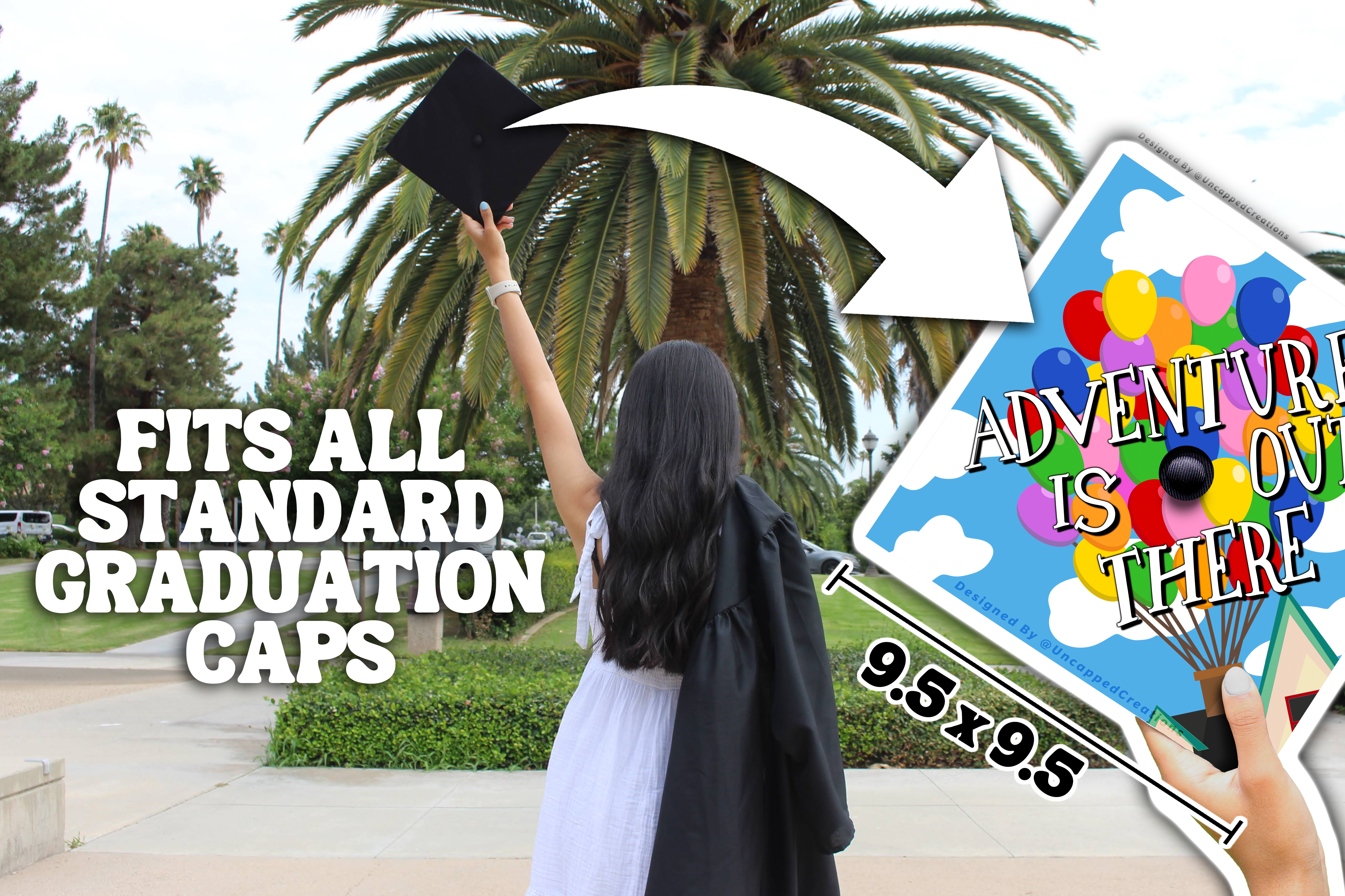 Design is 9.5 x 9.5 inches with an approximate 1 inch hole in the center and double sided adhesive in the back. Design is printed on cardstock, not hand painted. The topper will fit the standard 9 x 9 inches graduation cap / mortar board. Cap/Mortar board is not included. Center circle is not included.