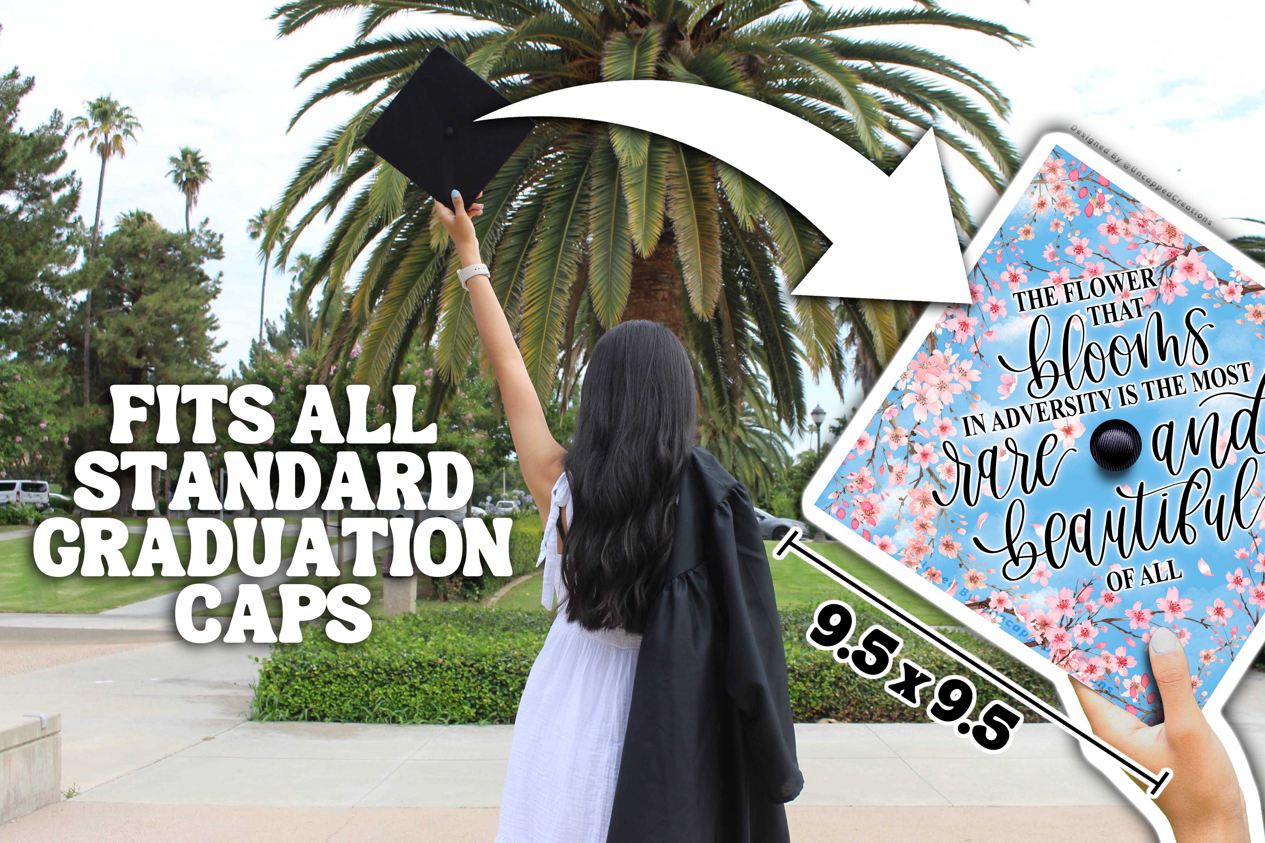 Premade grad cap design is sold AS IS. Design CANNOT be altered, edited, or changed and will be shipped exactly how you see it. Printed design may differ in color slightly in person. Watermarks are only on product photos, actual product will not have a watermark.