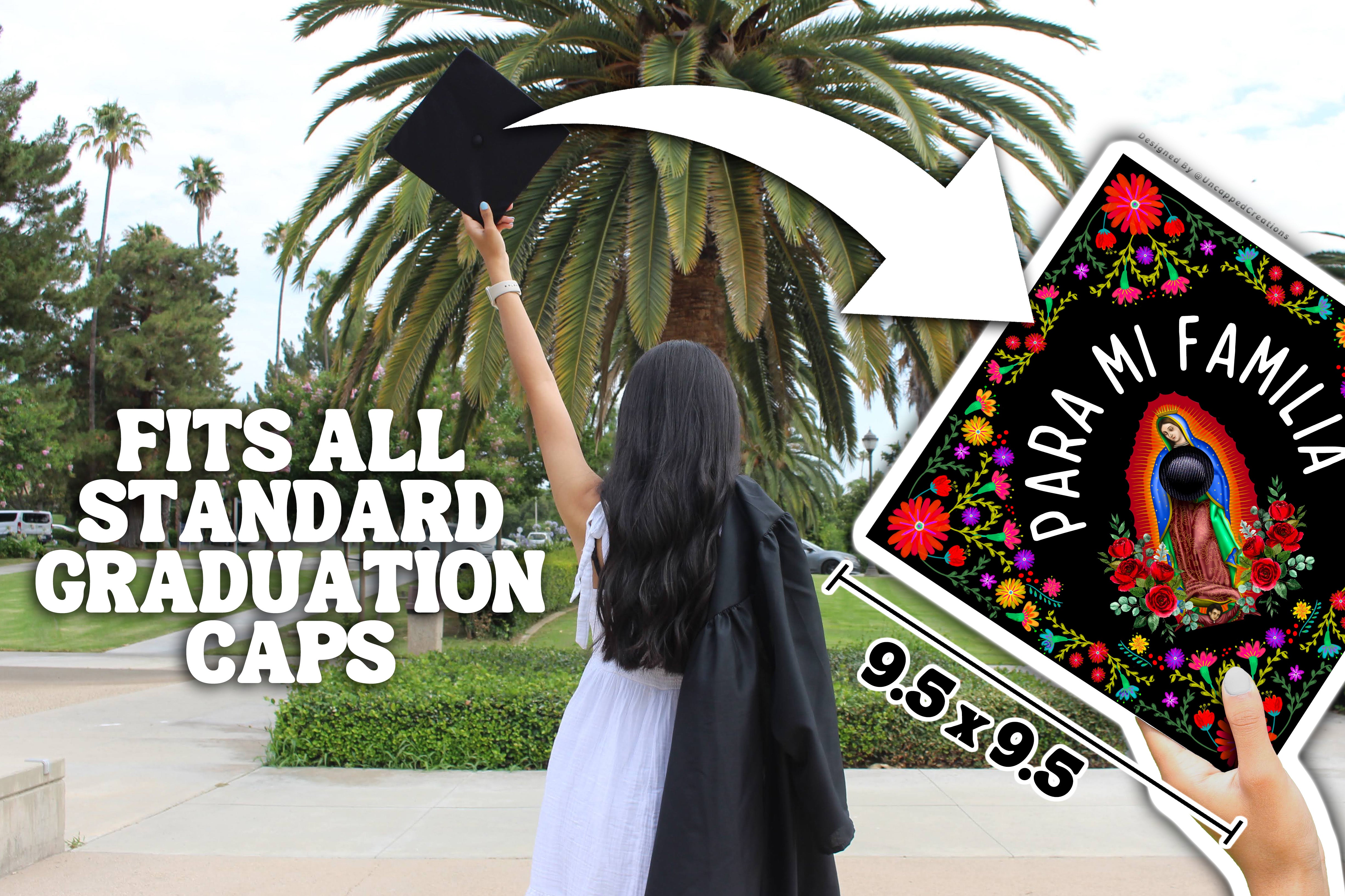 Design is 9.5 x 9.5 inches with an approximate 1 inch hole in the center and double sided adhesive in the back. Design is printed on cardstock, not hand painted. The topper will fit the standard 9 x 9 inches graduation cap / mortar board. Cap/Mortar board is not included. Center circle is not included.