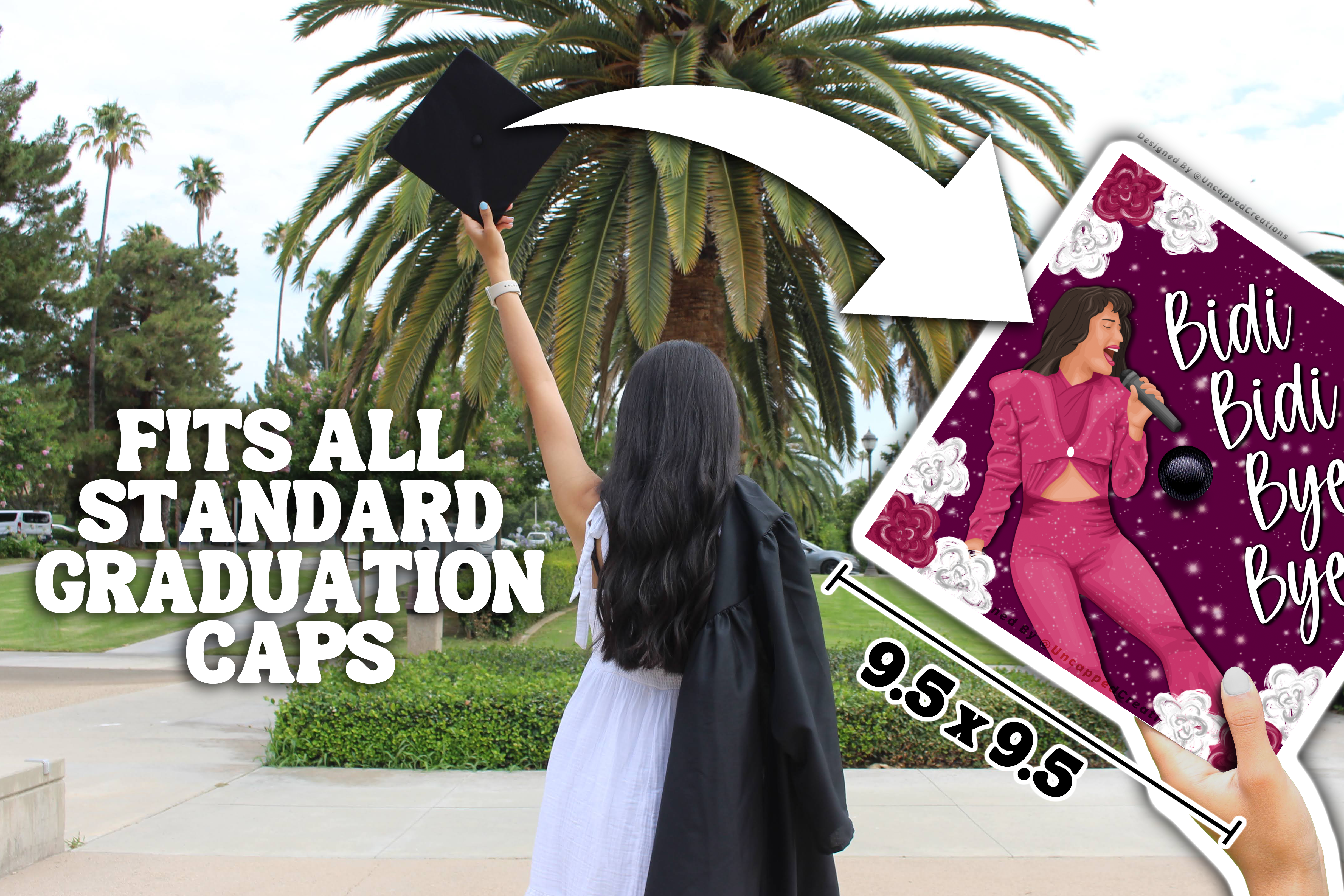 Design is 9.5 x 9.5 inches with an approximate 1 inch hole in the center and double sided adhesive in the back. Design is printed on cardstock, not hand painted. The topper will fit the standard 9 x 9 inches graduation cap / mortar board. Cap is not included.