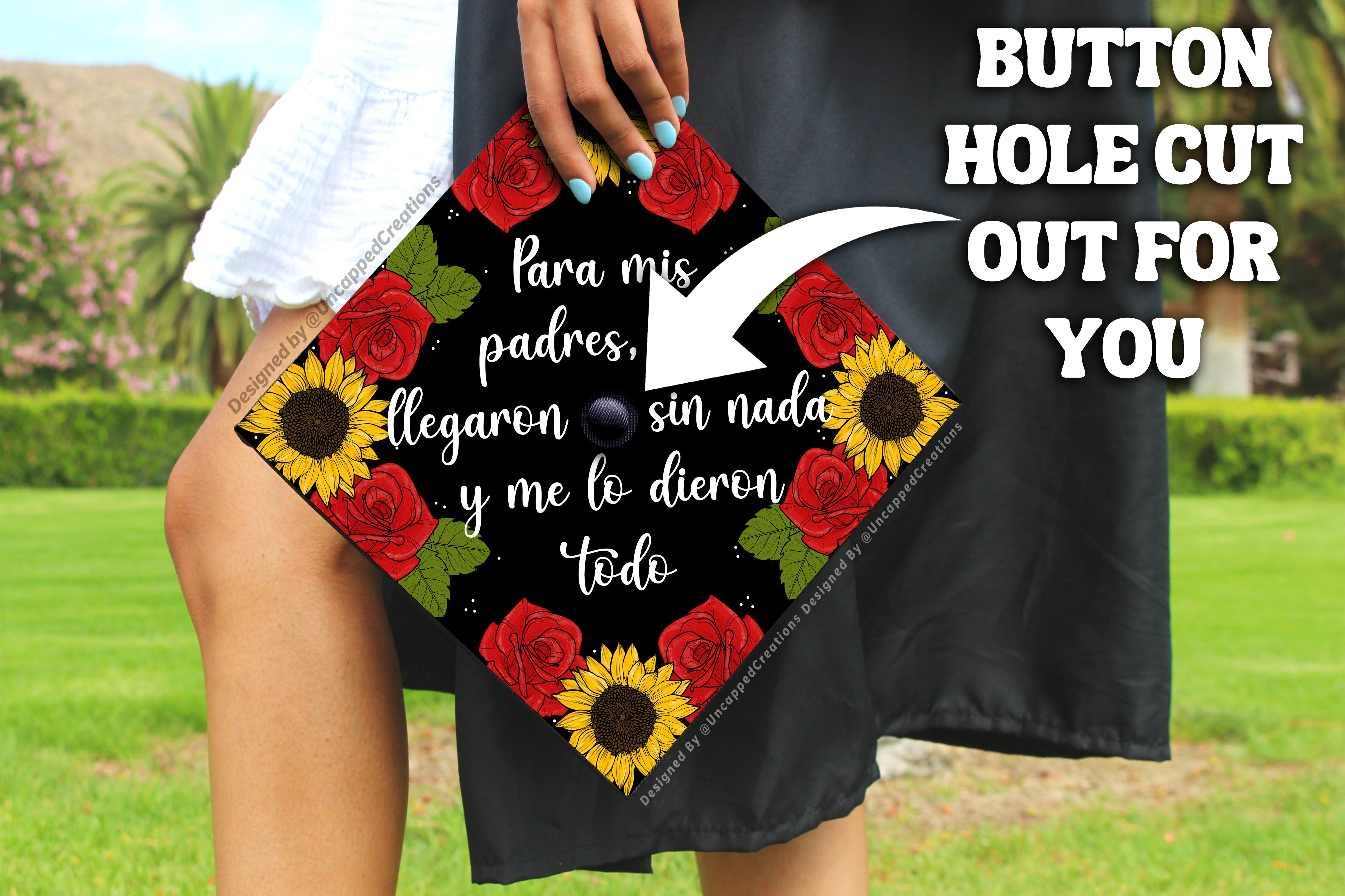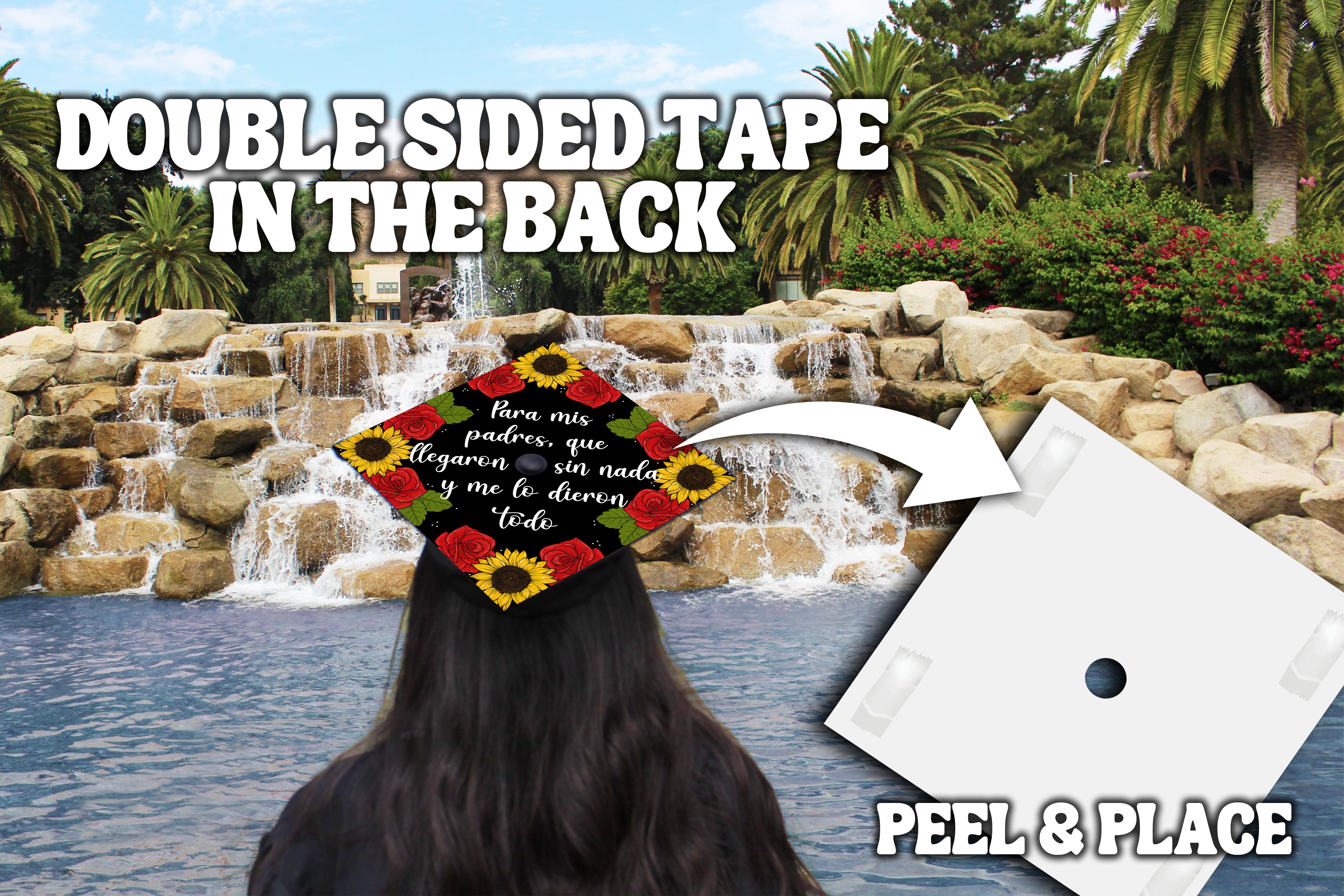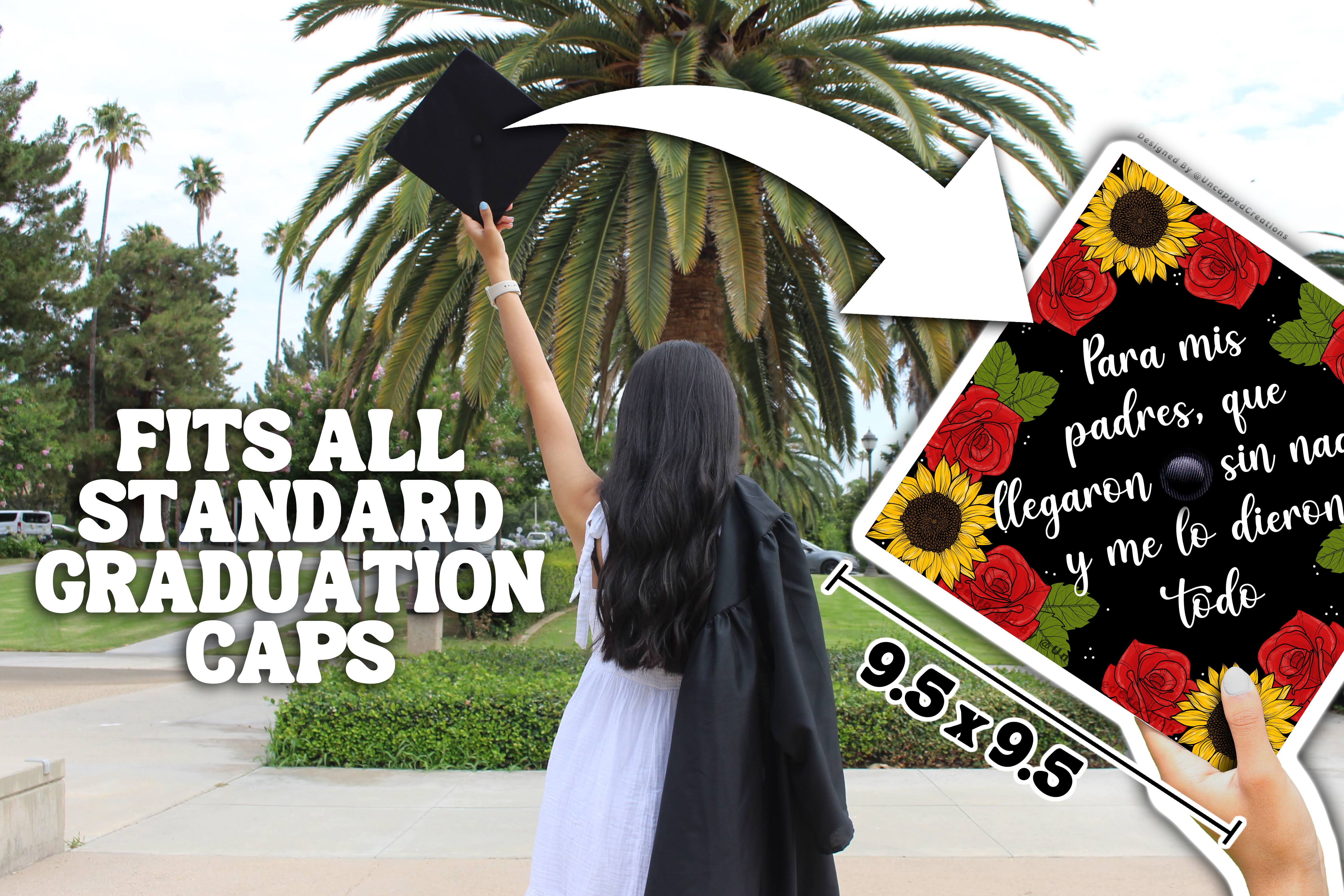 Design is 9.5 x 9.5 inches with an approximate 1 inch hole in the center and double sided adhesive in the back. Design is printed on cardstock, not hand painted. The topper will fit the standard 9 x 9 inches graduation cap / mortar board. Cap/Mortar board is not included. Center circle is not included.