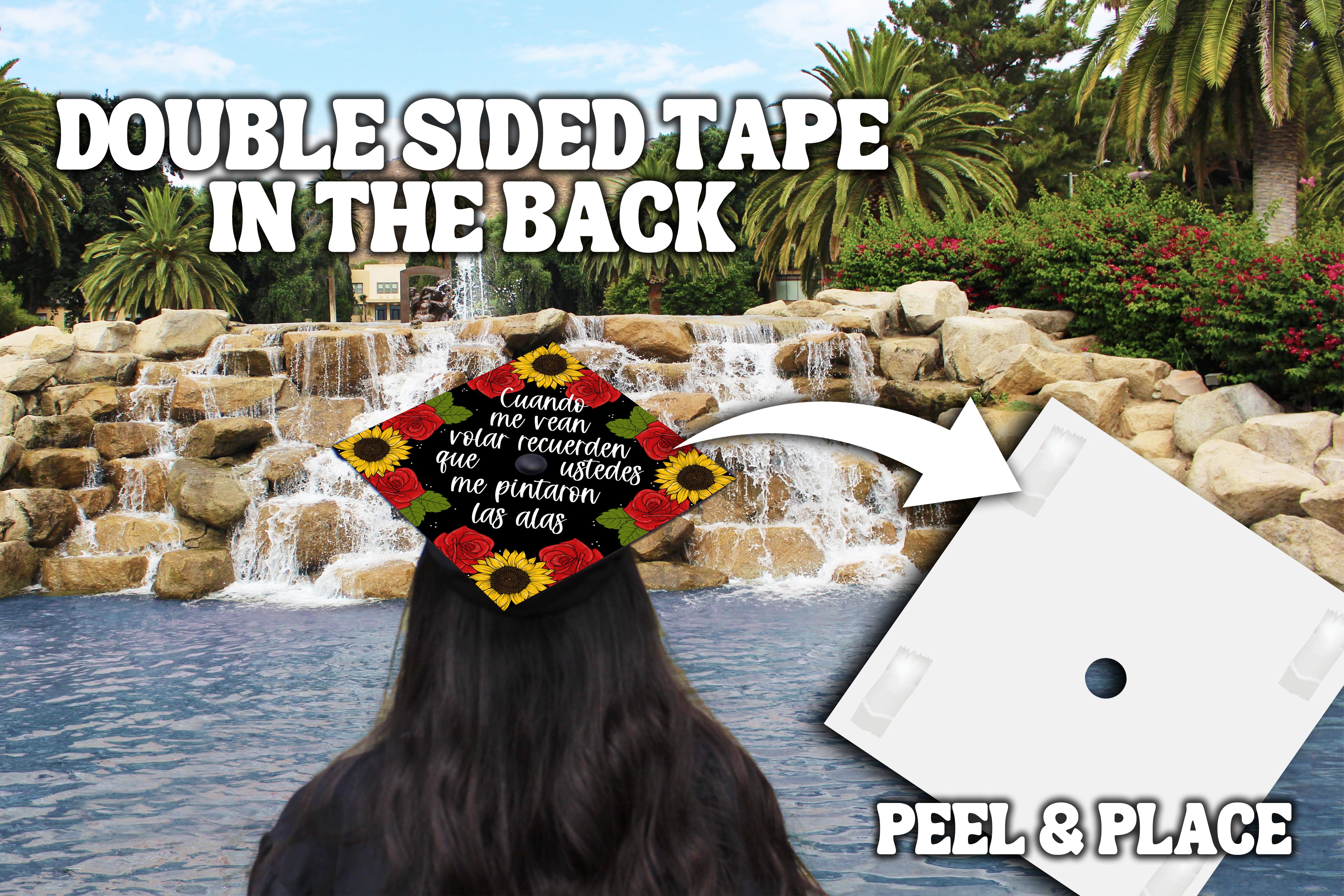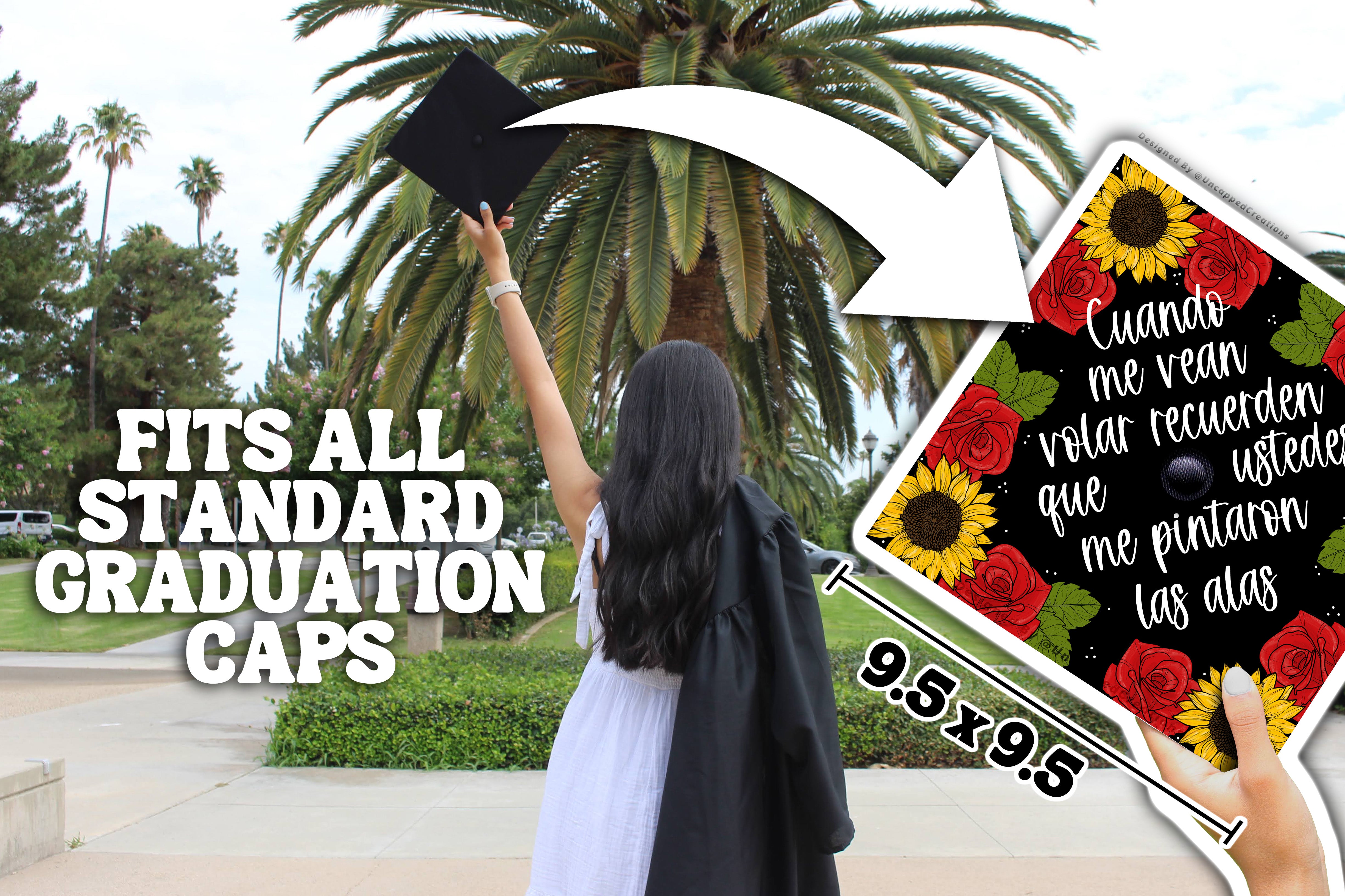 Design is 9.5 x 9.5 inches with an approximate 1 inch hole in the center and double sided adhesive in the back. Design is printed on cardstock, not hand painted. The topper will fit the standard 9 x 9 inches graduation cap / mortar board. Cap/Mortar board is not included. Center circle is not included.