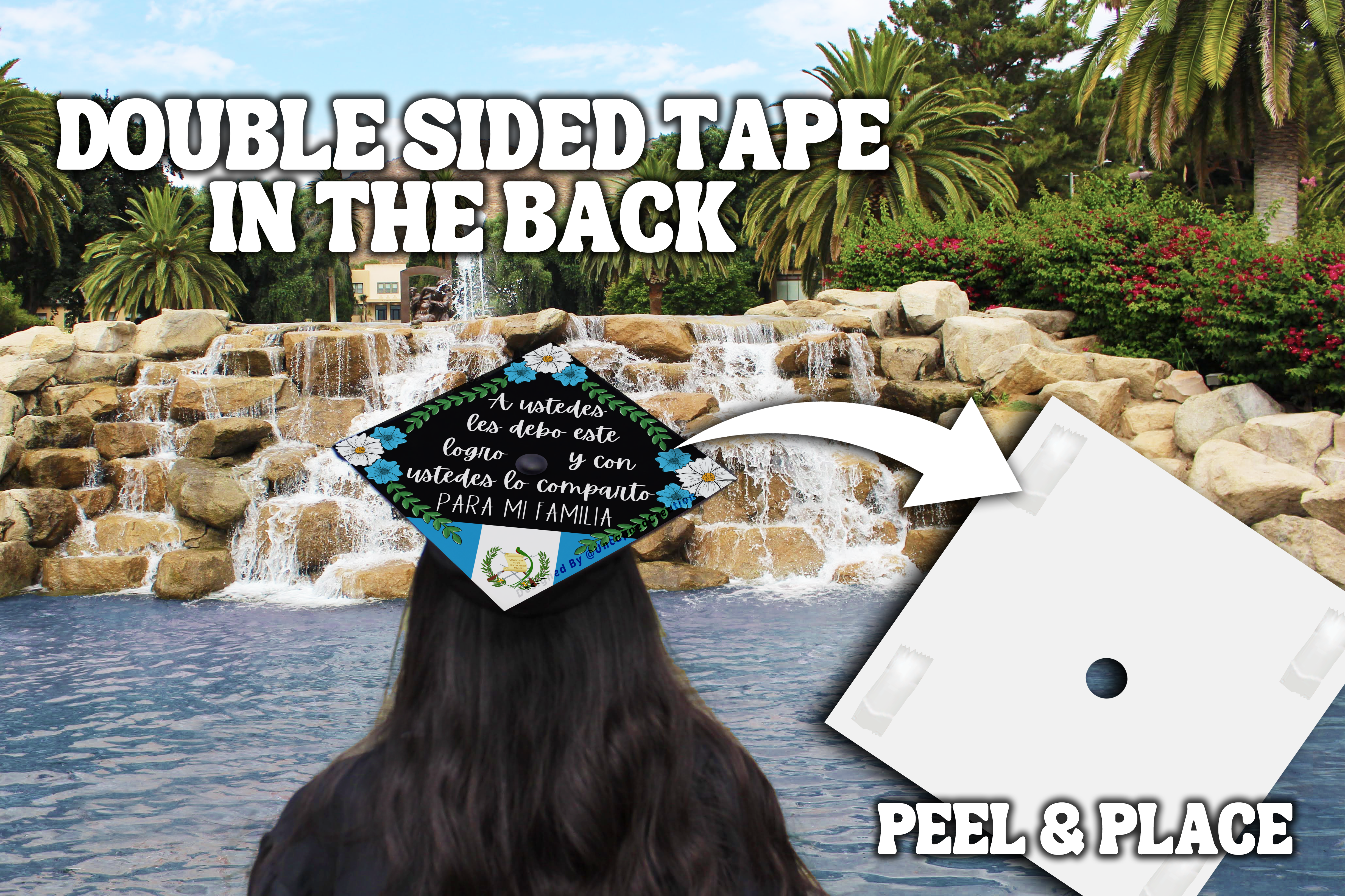 Design is 9.5 x 9.5 inches with an approximate 1 inch hole in the center and double sided adhesive in the back. Design is printed on cardstock, not hand painted. The topper will fit the standard 9 x 9 inches graduation cap / mortar board. Cap / mortar board is not included. Circle cut out for the button hole is not included.