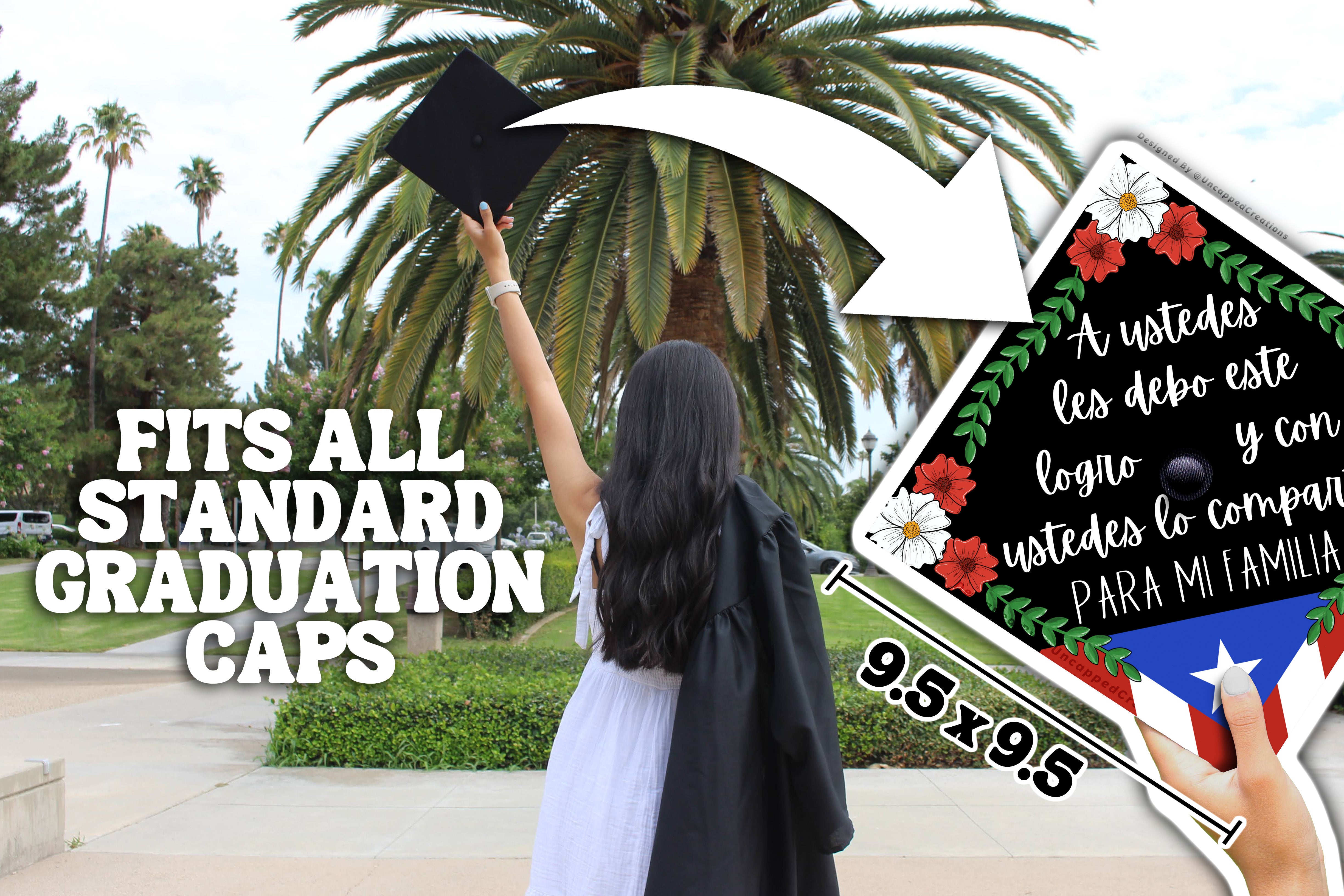 Design is 9.5 x 9.5 inches with an approximate 1 inch hole in the center and double sided adhesive in the back. Design is printed on cardstock, not hand painted. The topper will fit the standard 9 x 9 inches graduation cap / mortar board. Cap is not included.