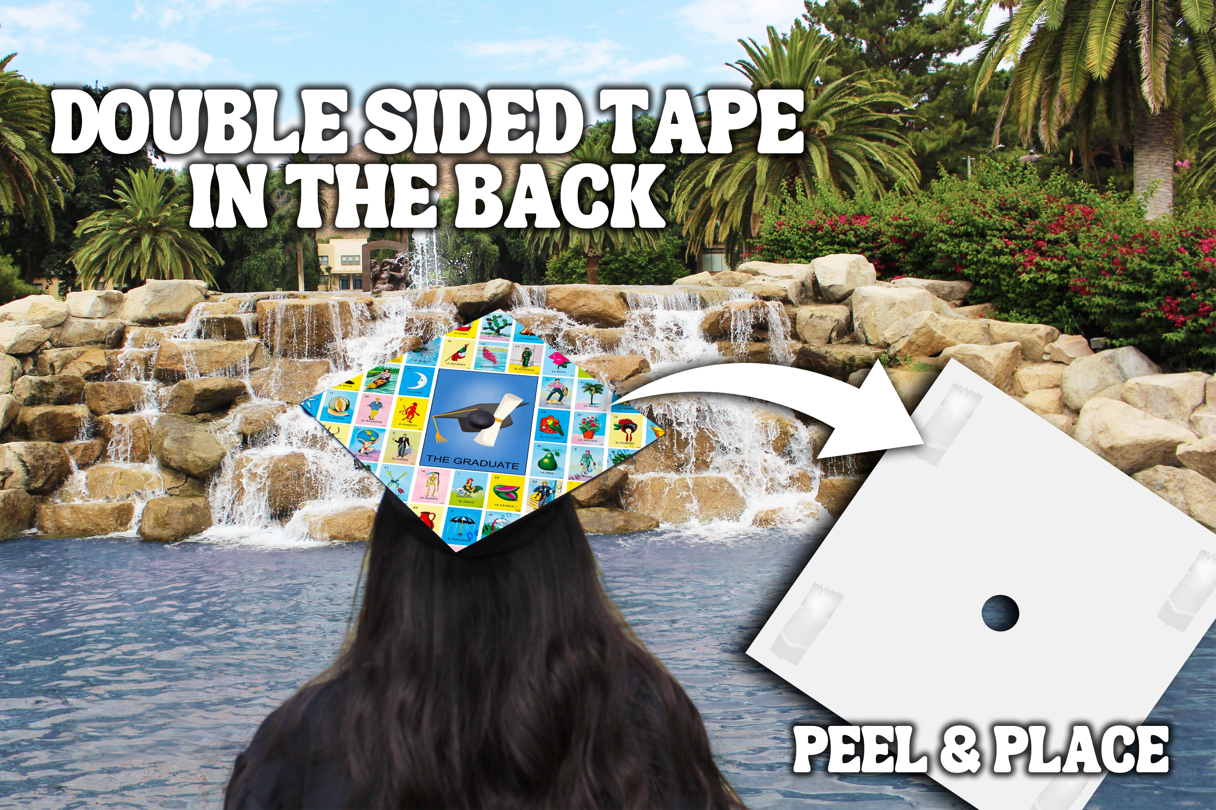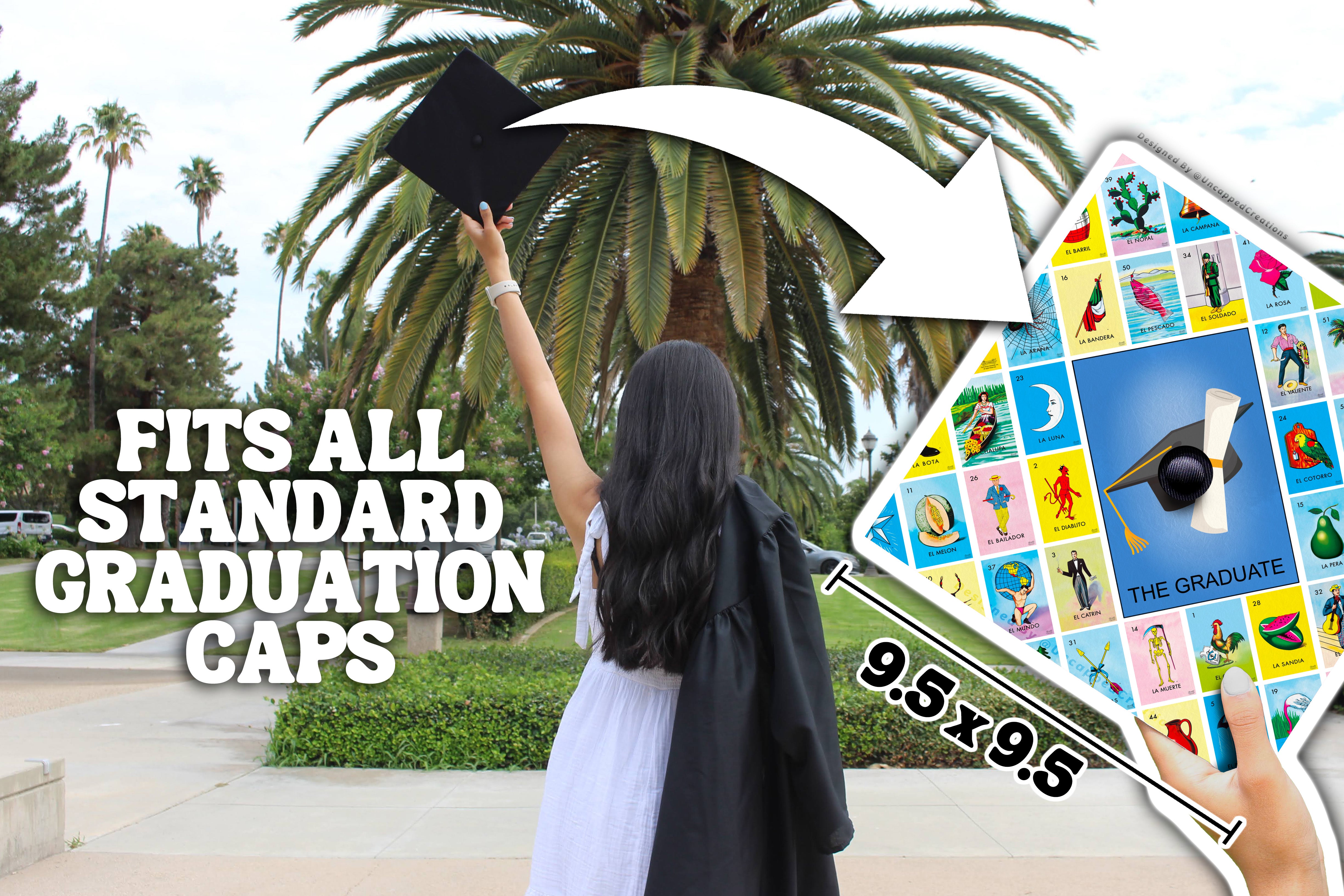 Design is 9.5 x 9.5 inches with an approximate 1 inch hole in the center and double sided adhesive in the back. Design is printed on cardstock, not hand painted. The topper will fit the standard 9 x 9 inches graduation cap / mortar board. Cap is not included.