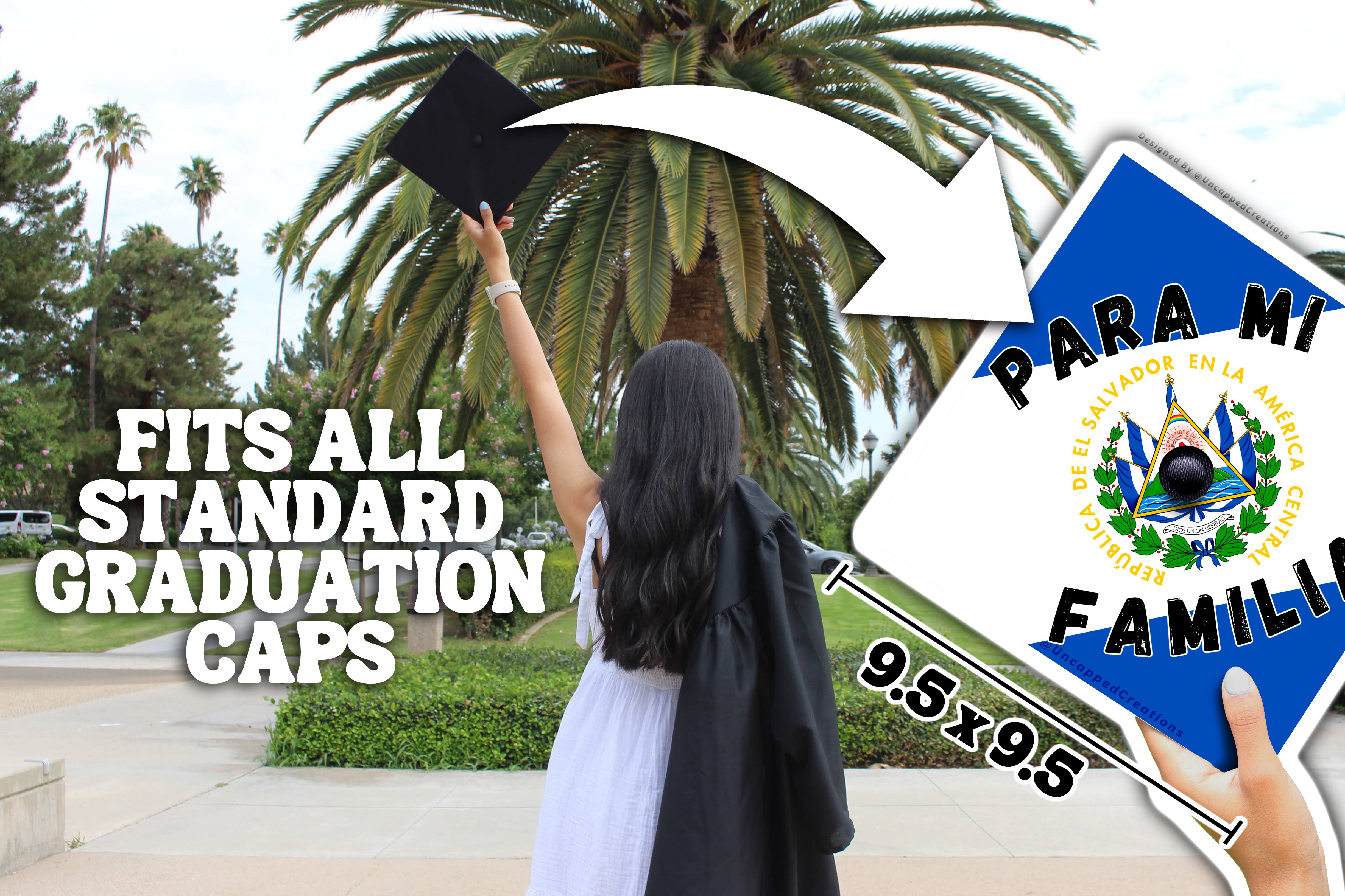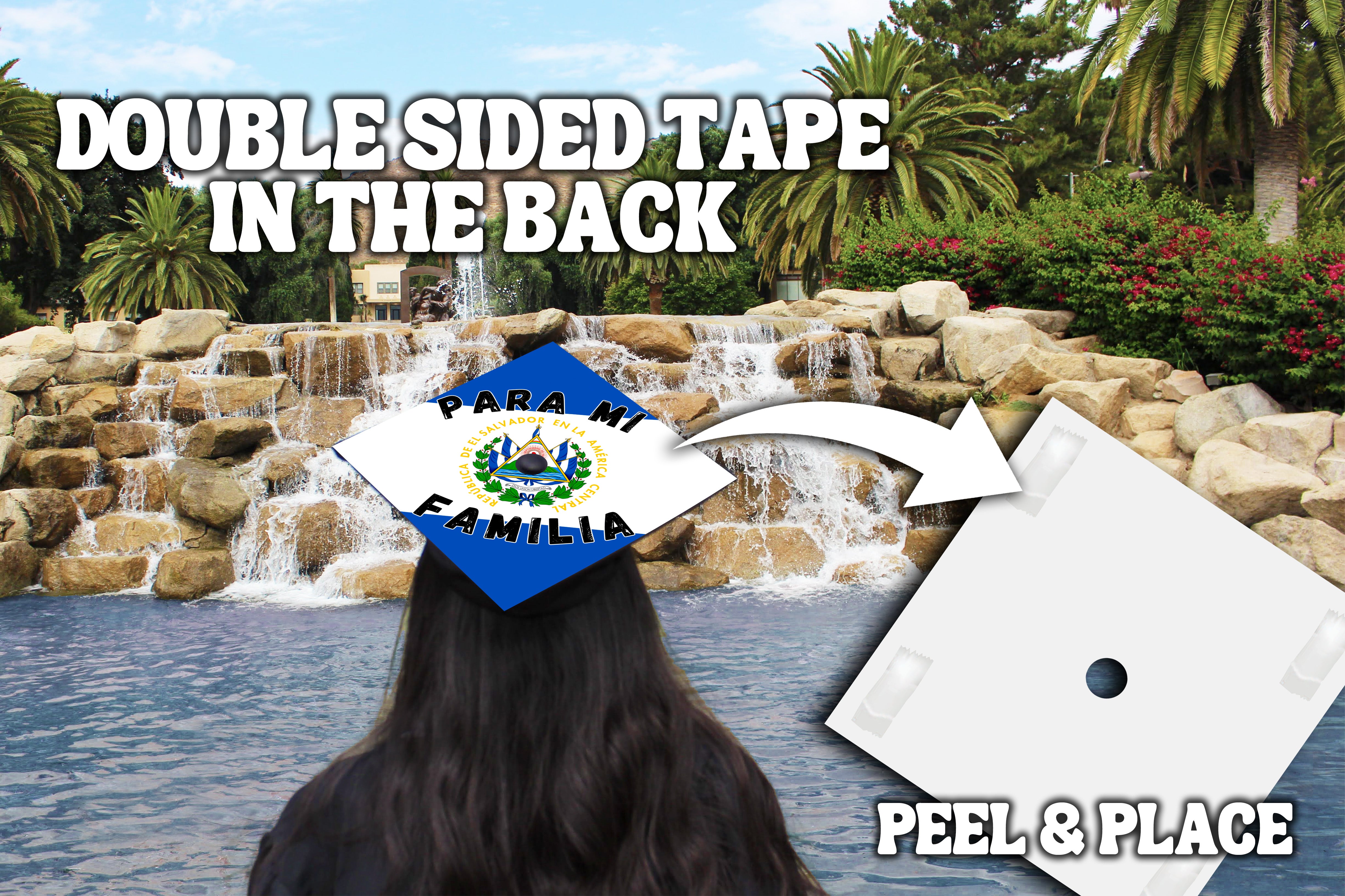 Design is 9.5 x 9.5 inches with an approximate 1 inch hole in the center and double sided adhesive in the back. Design is printed on cardstock, not hand painted. The topper will fit the standard 9 x 9 inches graduation cap / mortar board. Cap is not included.