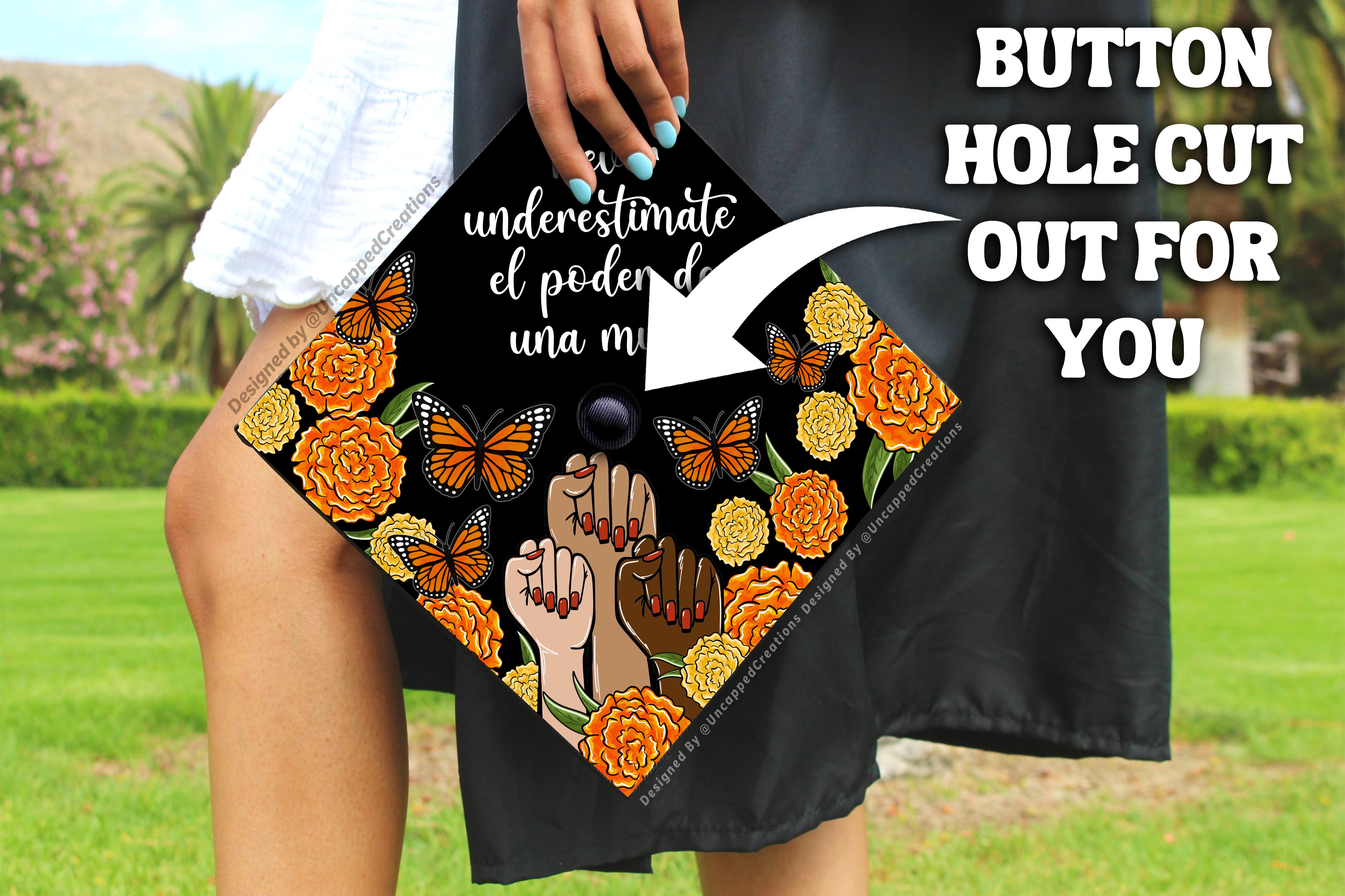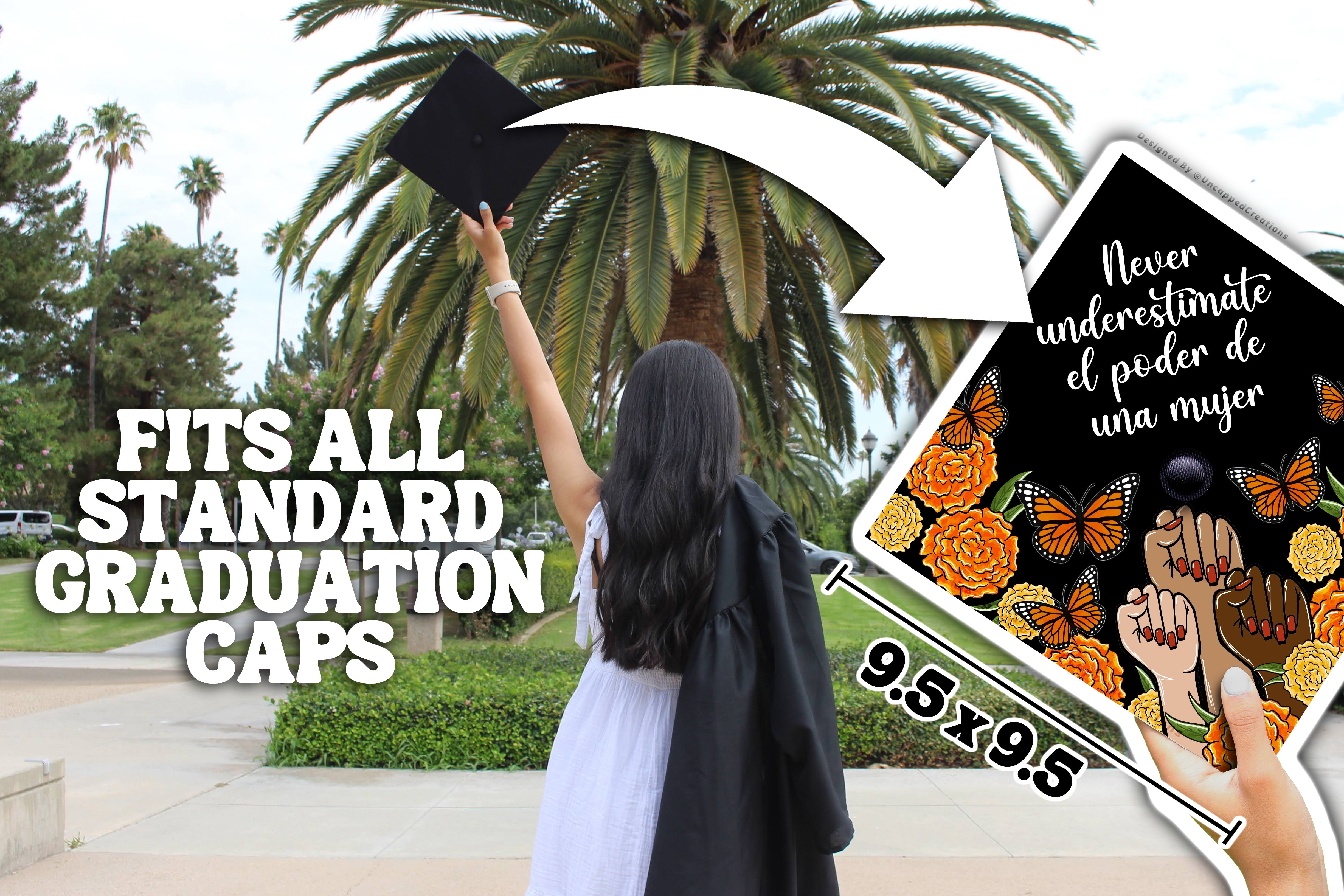Design is 9.5 x 9.5 inches with an approximate 1 inch hole in the center and double sided adhesive in the back. Design is printed on cardstock, not hand painted. The topper will fit the standard 9 x 9 inches graduation cap / mortar board. Cap/Mortar board is not included. Center circle is not included.