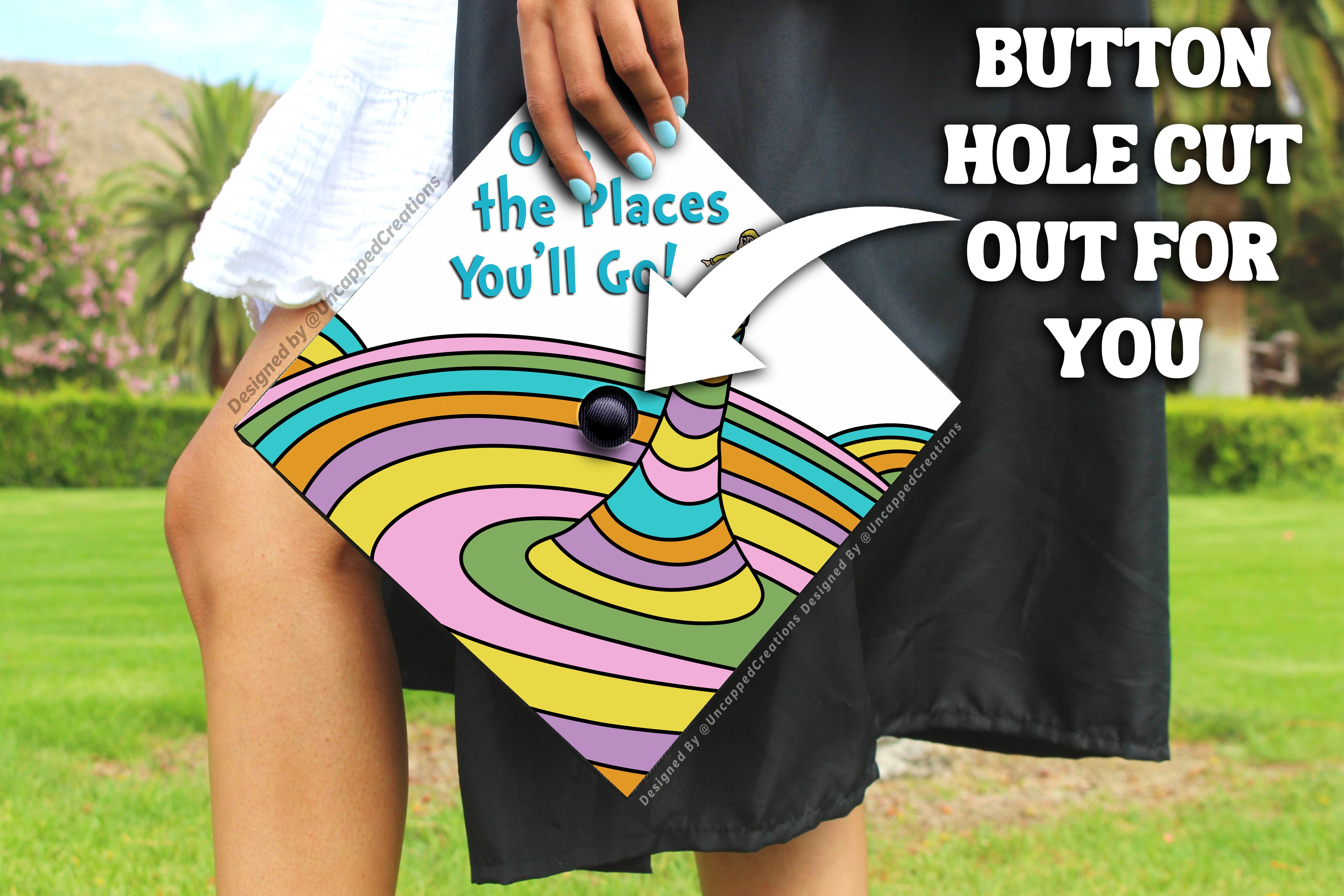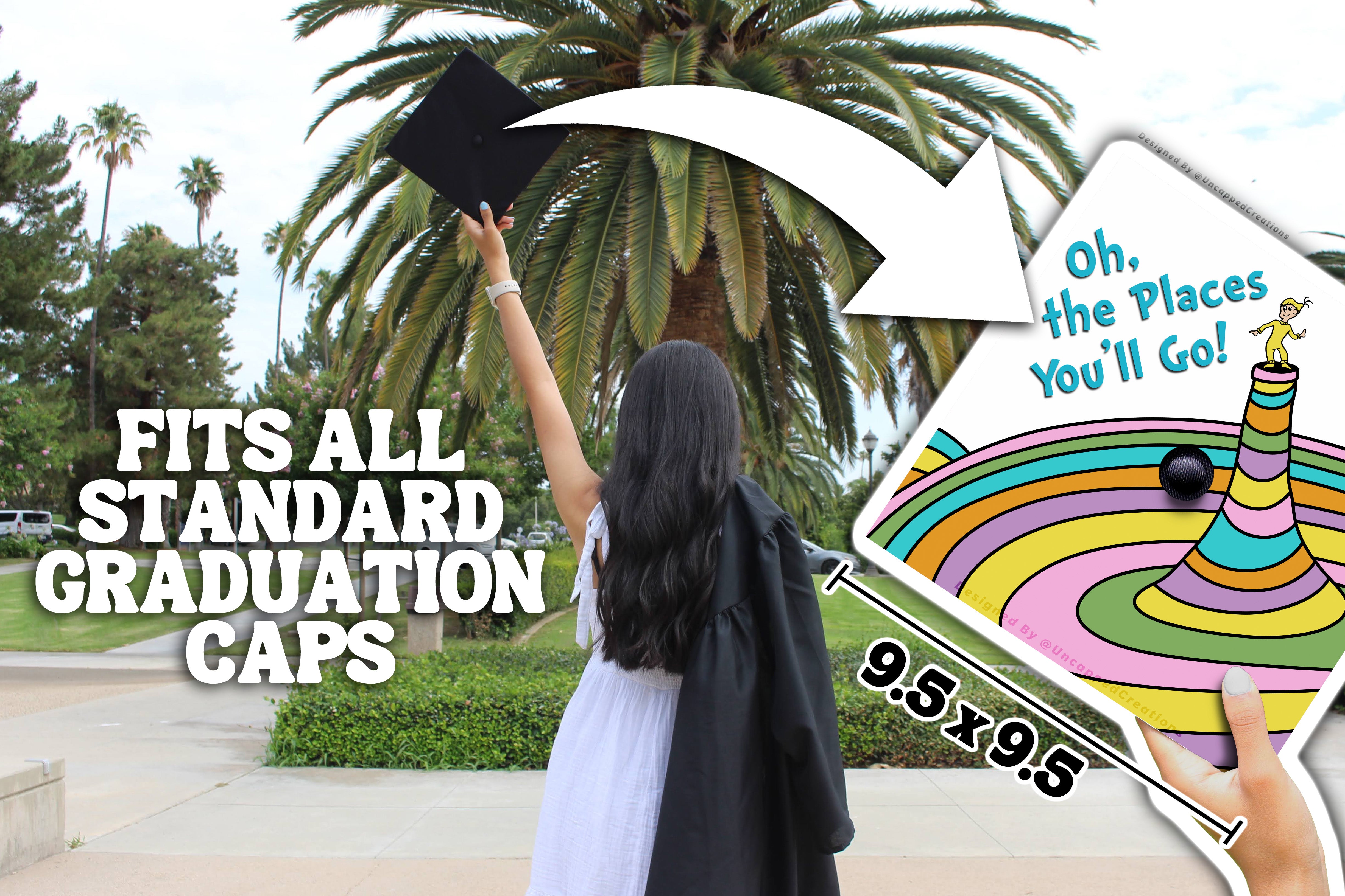 Design is 9.5 x 9.5 inches with an approximate 1 inch hole in the center and double sided adhesive in the back. Design is printed on cardstock, not hand painted. The topper will fit the standard 9 x 9 inches graduation cap / mortar board. Cap/Mortar board is not included. Center circle is not included.
