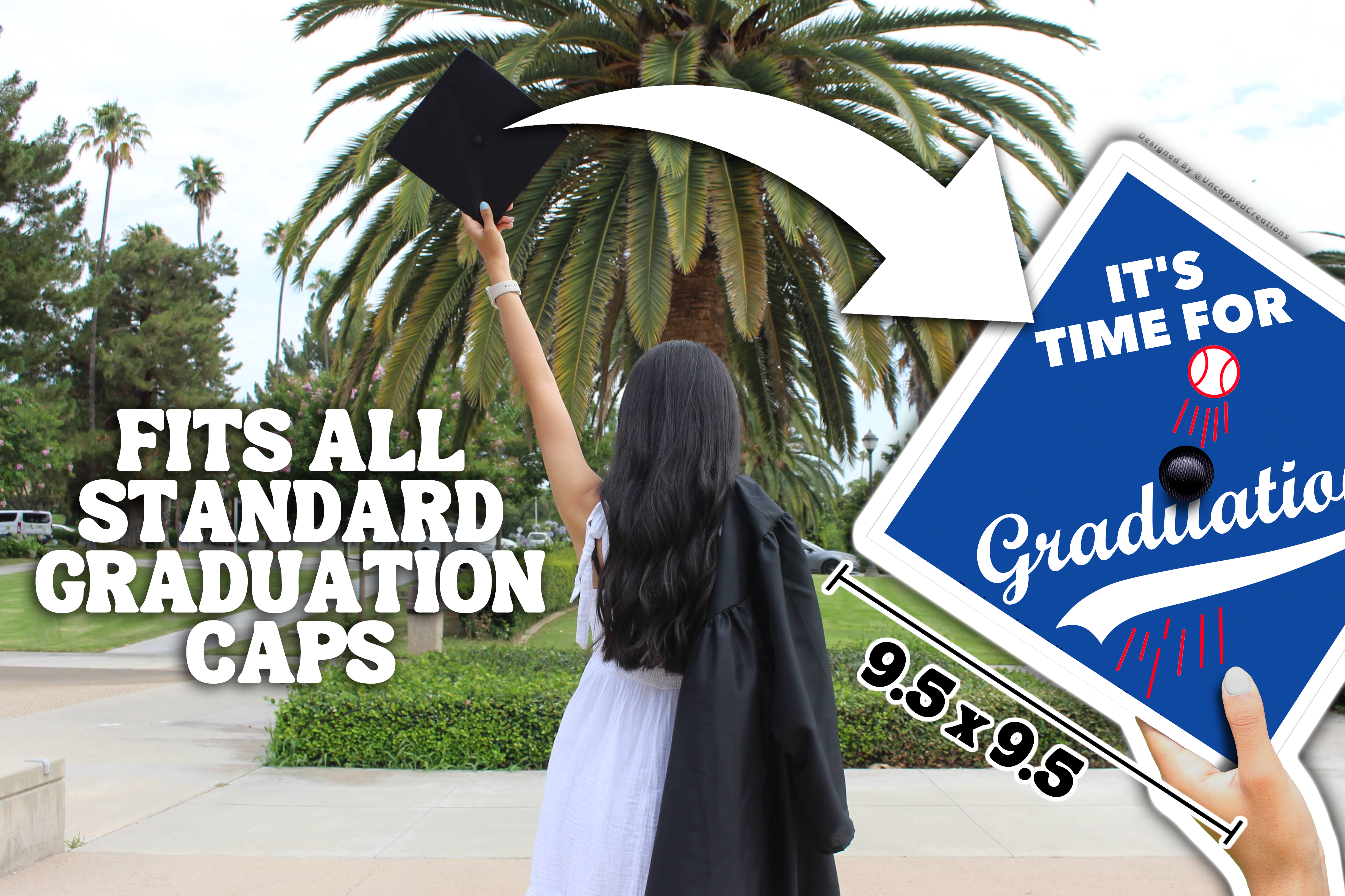 Design is 9.5 x 9.5 inches with an approximate 1 inch hole in the center and double sided adhesive in the back. Design is printed on cardstock, not hand painted. The topper will fit the standard 9 x 9 inches graduation cap / mortar board. Cap/Mortar board is not included. Center circle is not included.
