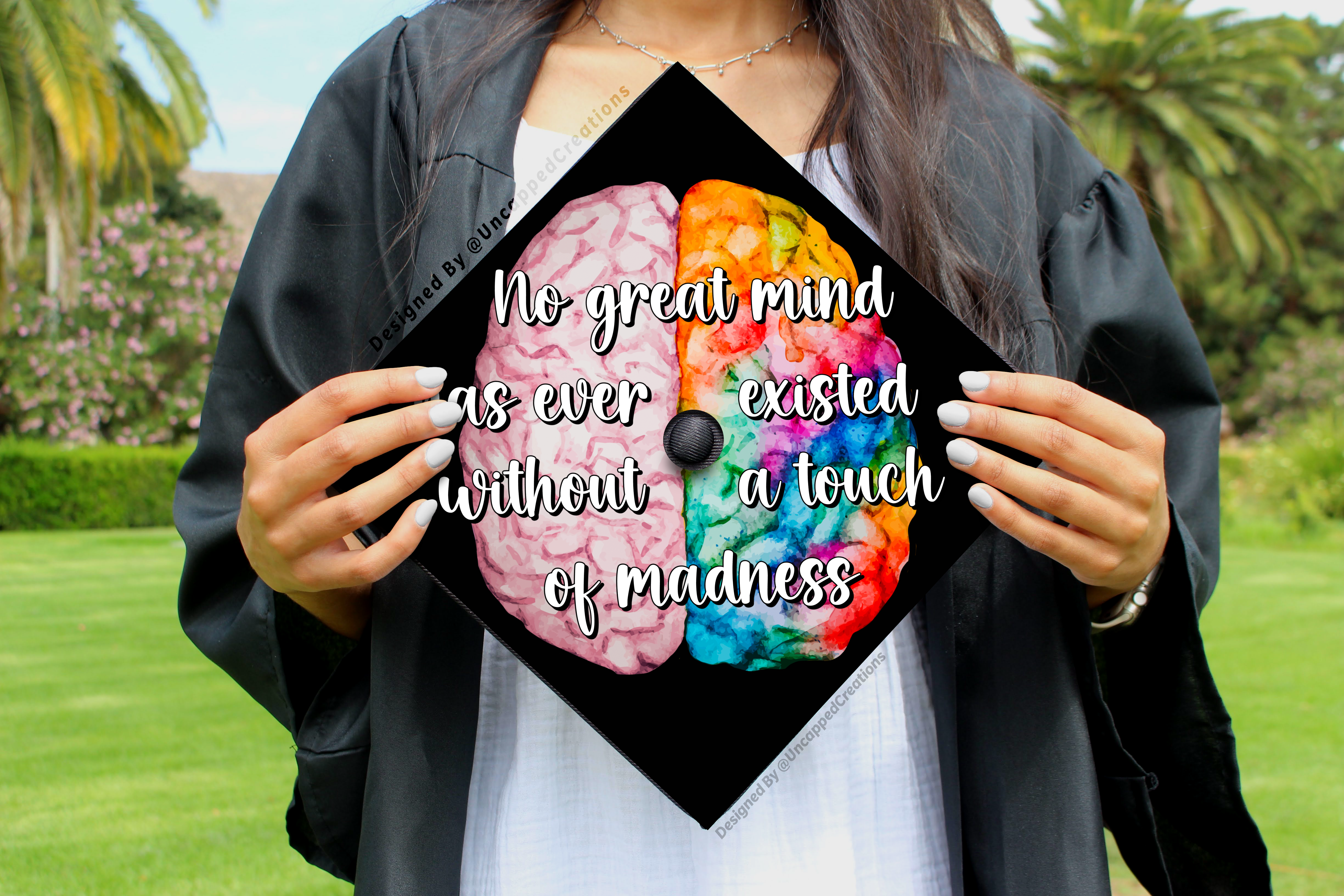 Premade grad cap design is sold AS IS. Design CANNOT be altered, edited, or changed and will be shipped exactly how you see it. Printed design may differ in color slightly in person. Watermarks are only on product photos, actual product will not have a watermark.