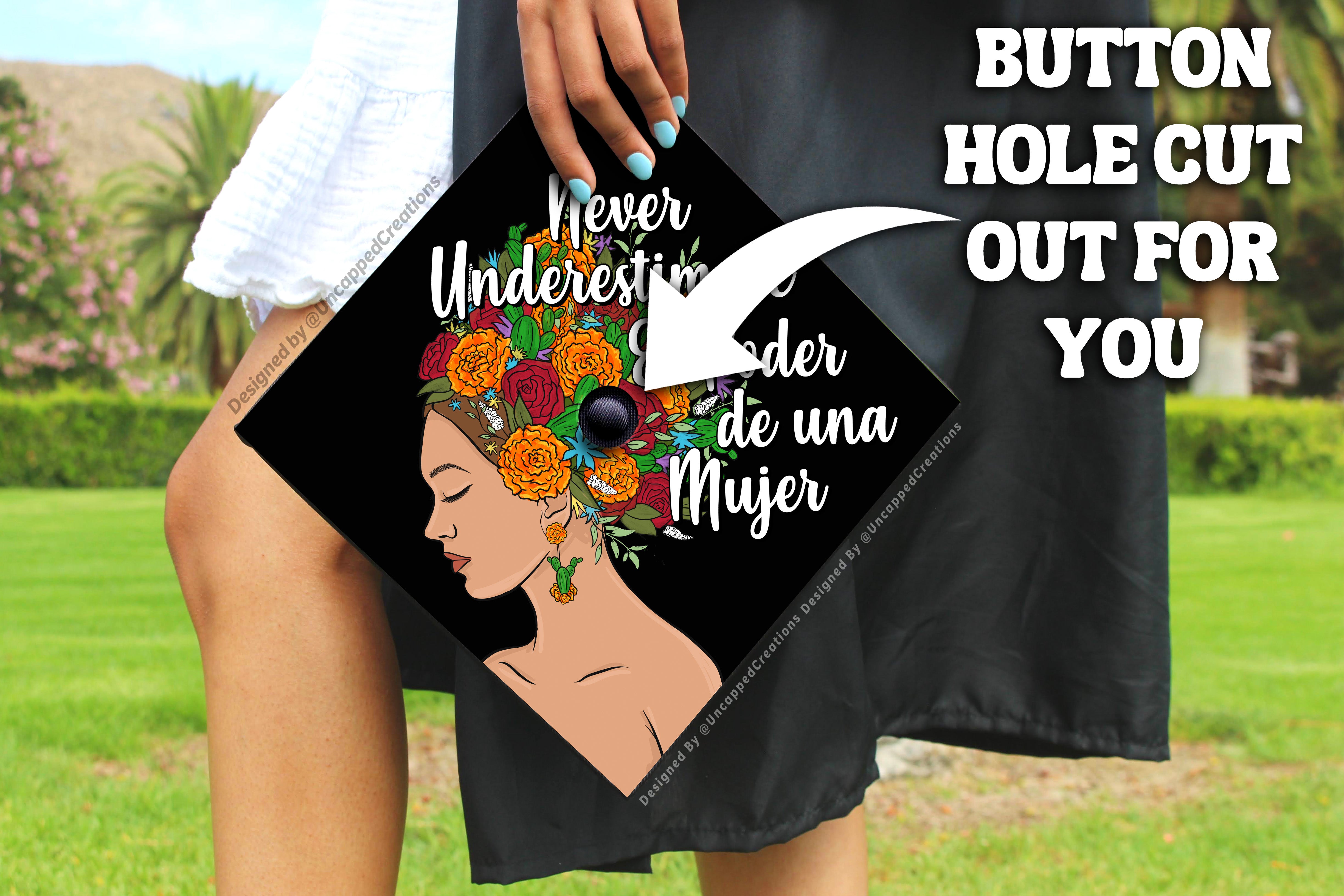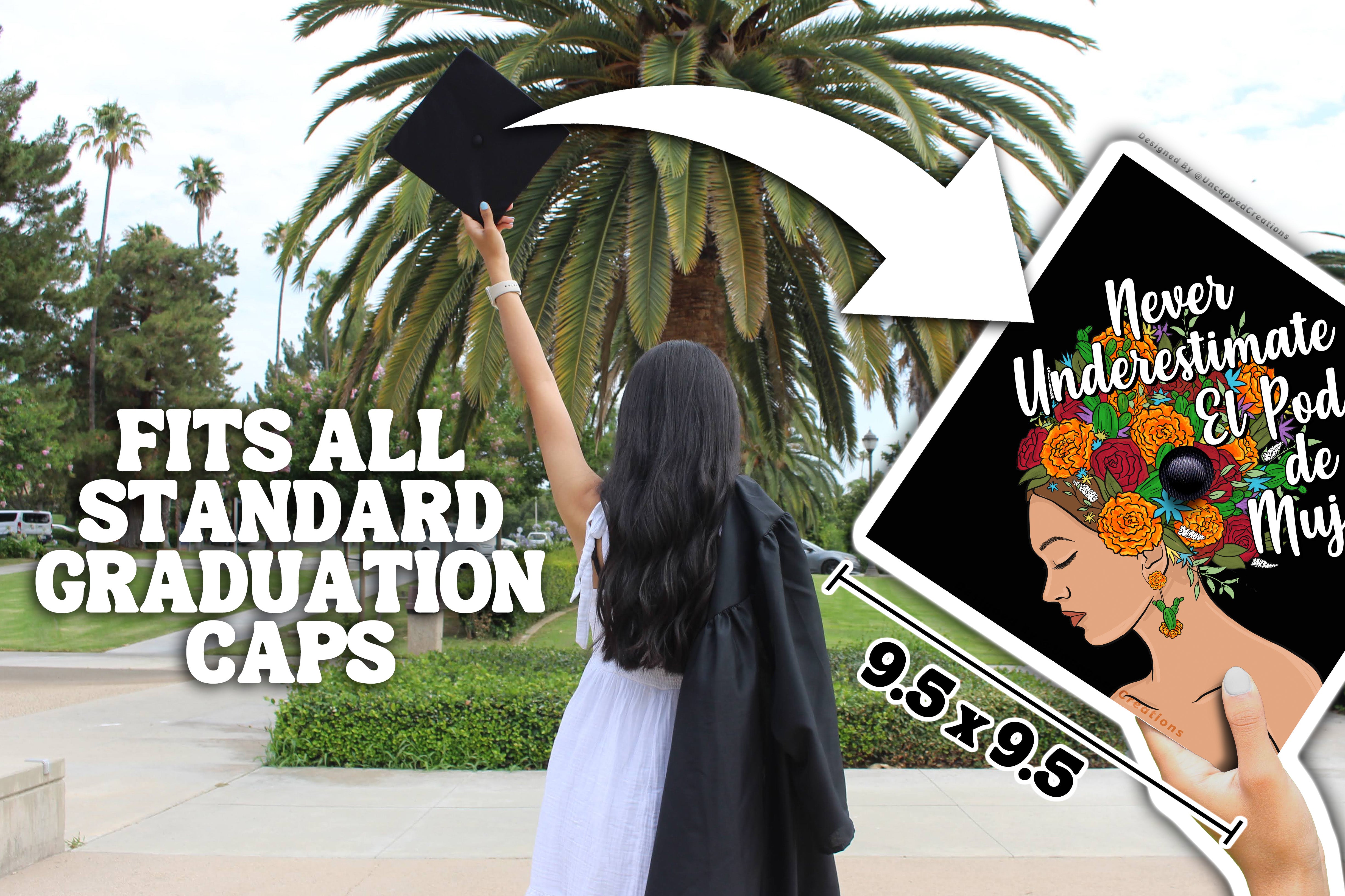 Design is 9.5 x 9.5 inches with an approximate 1 inch hole in the center and double sided adhesive in the back. Design is printed on cardstock, not hand painted. The topper will fit the standard 9 x 9 inches graduation cap / mortar board. Cap/Mortar board is not included. Center circle is not included.