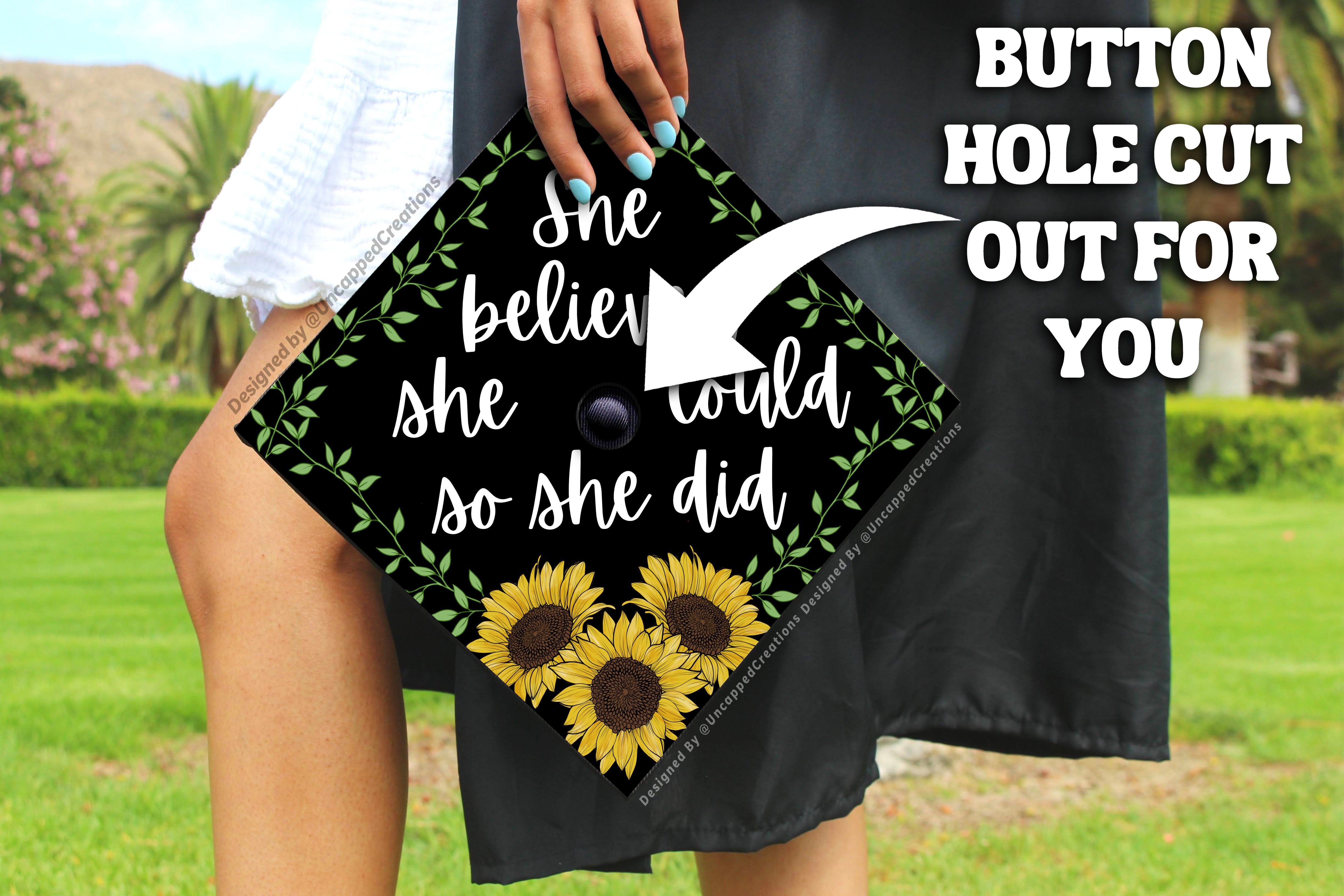 Design is 9.5 x 9.5 inches with an approximate 1 inch hole in the center and double sided adhesive in the back. Design is printed on cardstock, not hand painted. The topper will fit the standard 9 x 9 inches graduation cap / mortar board. Cap/Mortar board is not included. Center circle is not included.