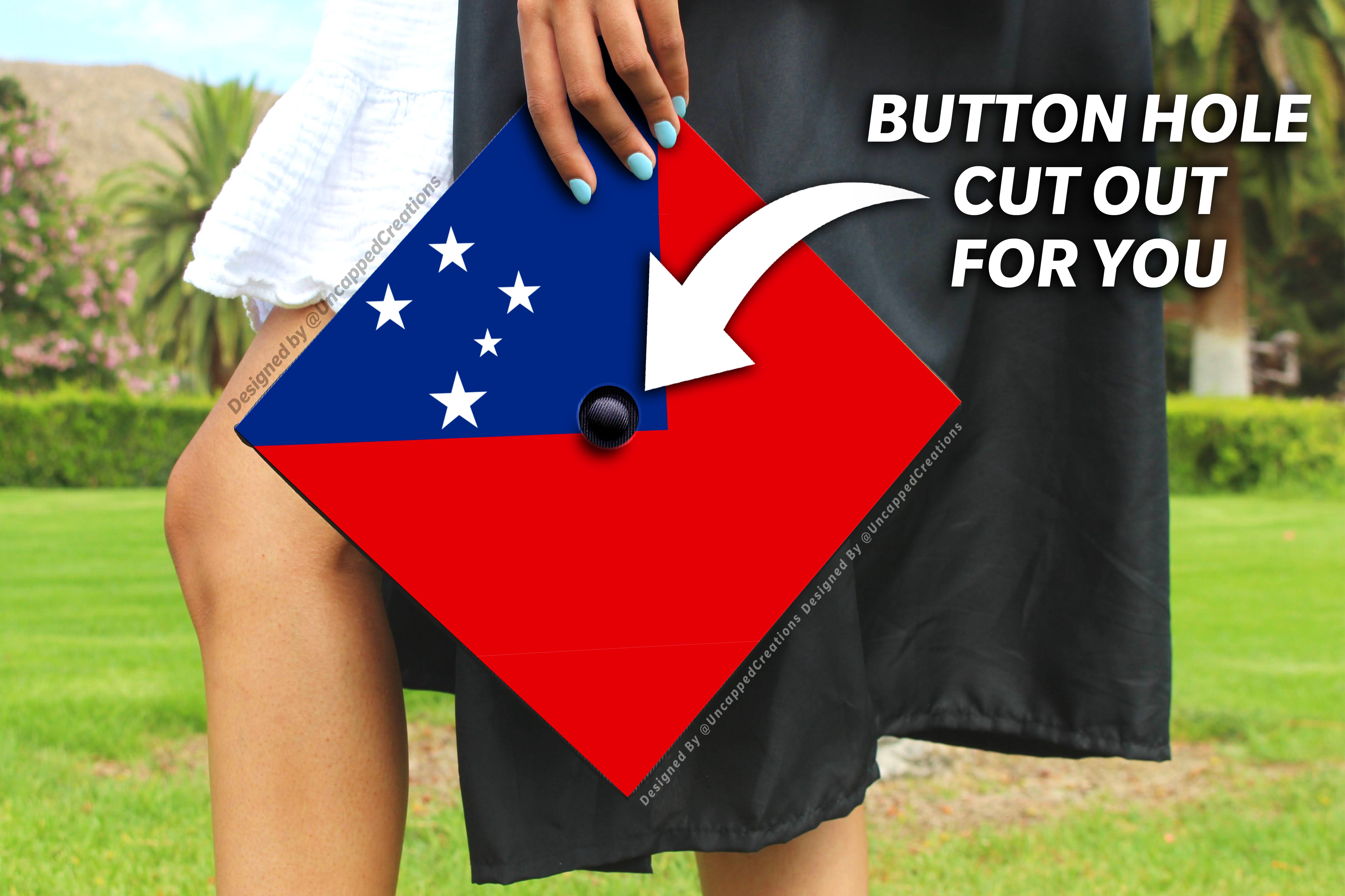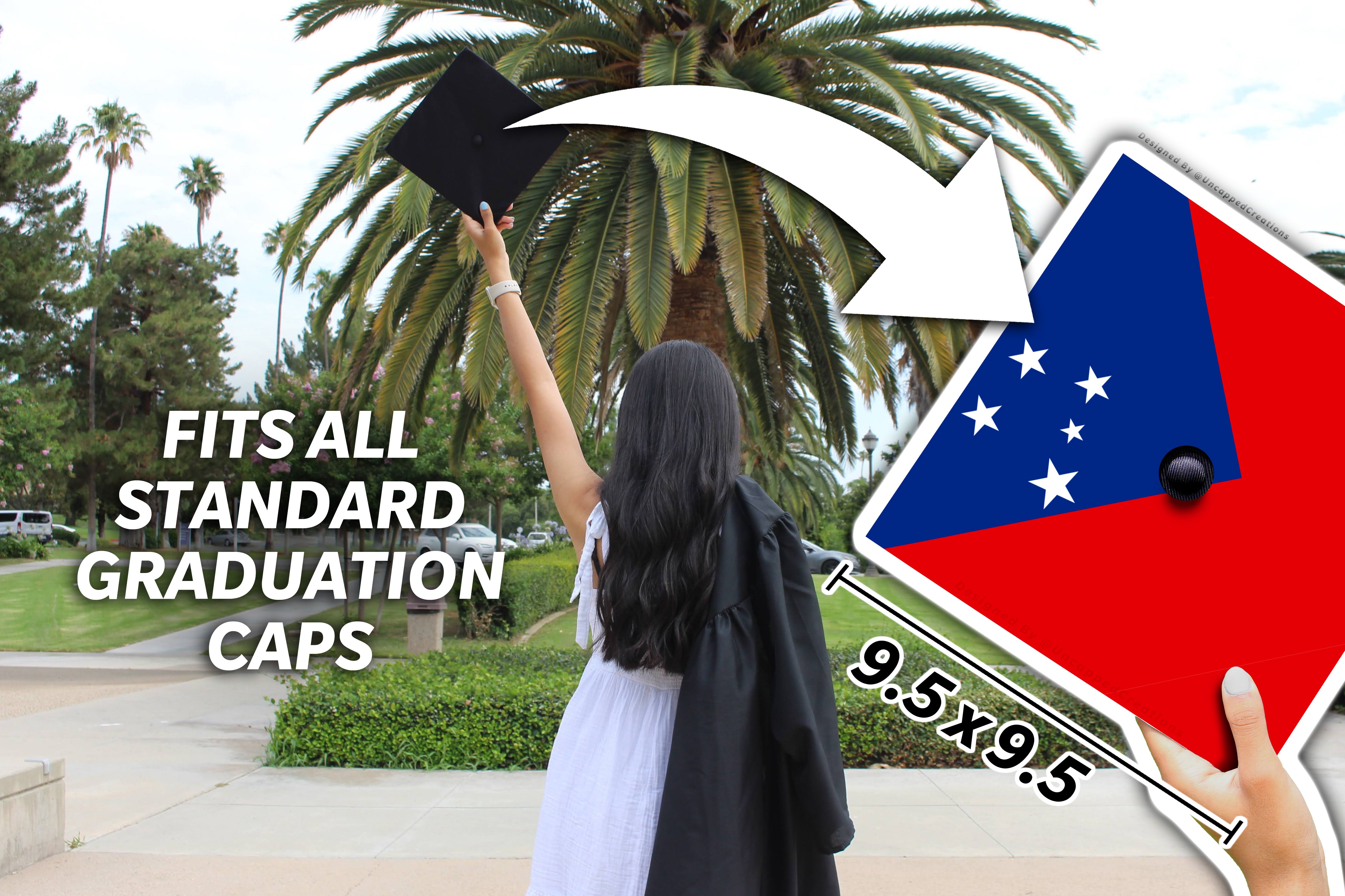 Design is 9.5 x 9.5 inches with an approximate 1 inch hole in the center and double sided adhesive in the back. Design is printed on cardstock, not hand painted. The topper will fit the standard 9 x 9 inches graduation cap / mortar board. Cap/Mortar board is not included. Center circle is not included.