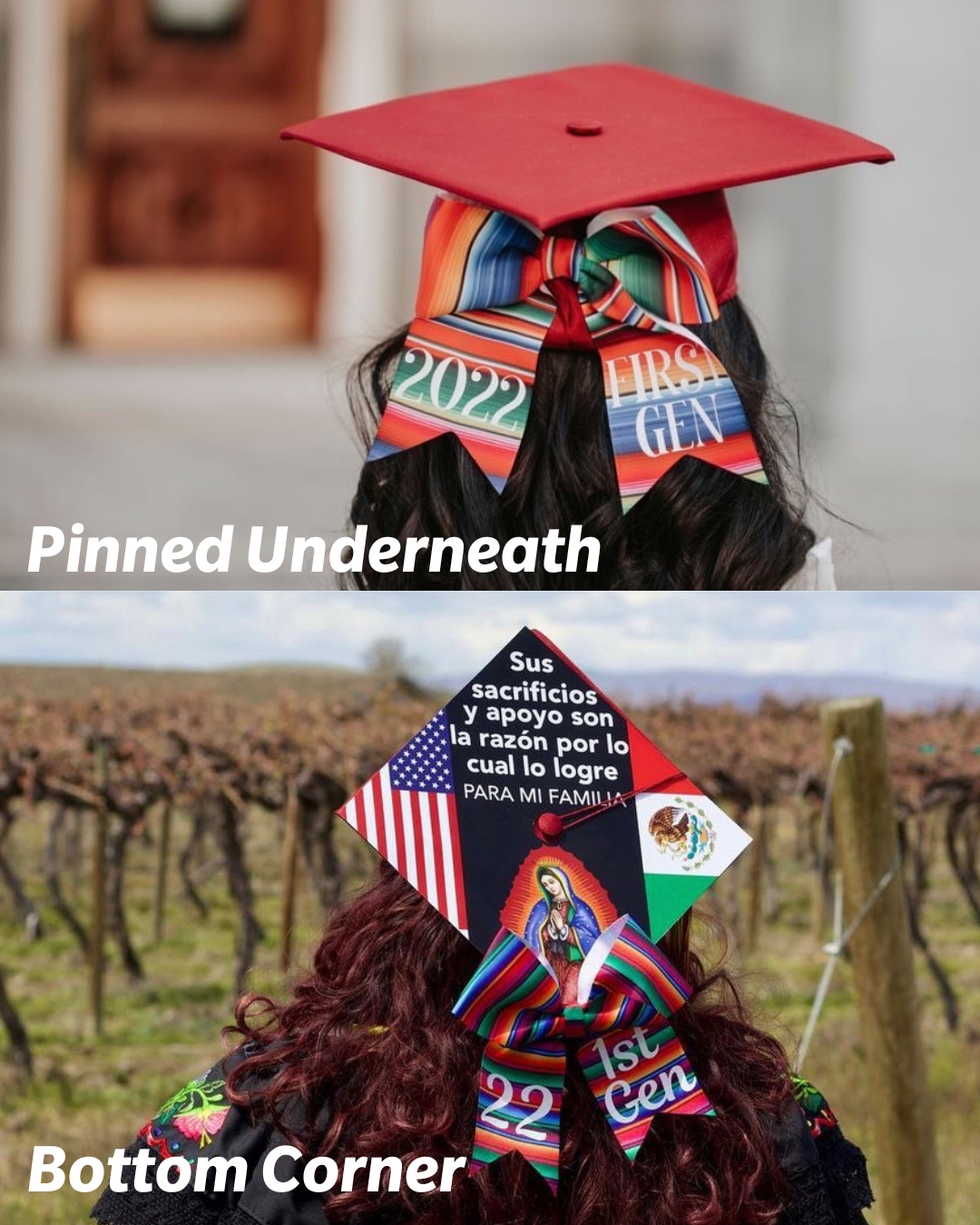 Pinned Underneath - If you plan on pinning your bow under the board on the back of your head, a pin will be embedded into the bow for you to pin to the back of your head.