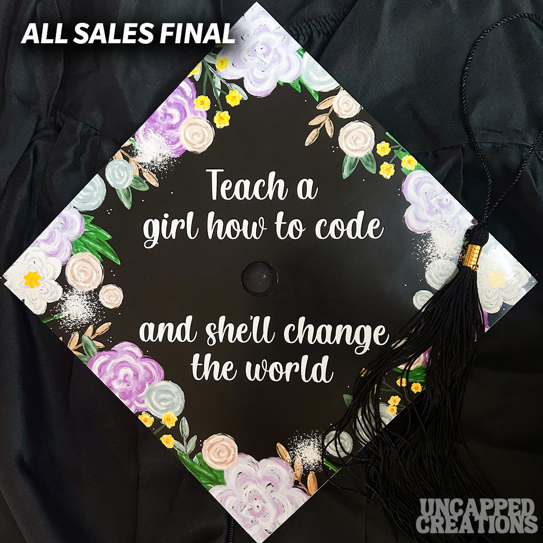 Design is 9.5 x 9.5 inches with an approximate 1 inch hole in the center and double sided adhesive in the back. Design is printed on cardstock, not hand painted, and rhinestoned on top. The topper will fit the standard 9 x 9 inches graduation cap / mortar board. Cap/Mortar board is not included. Center circle is not included.