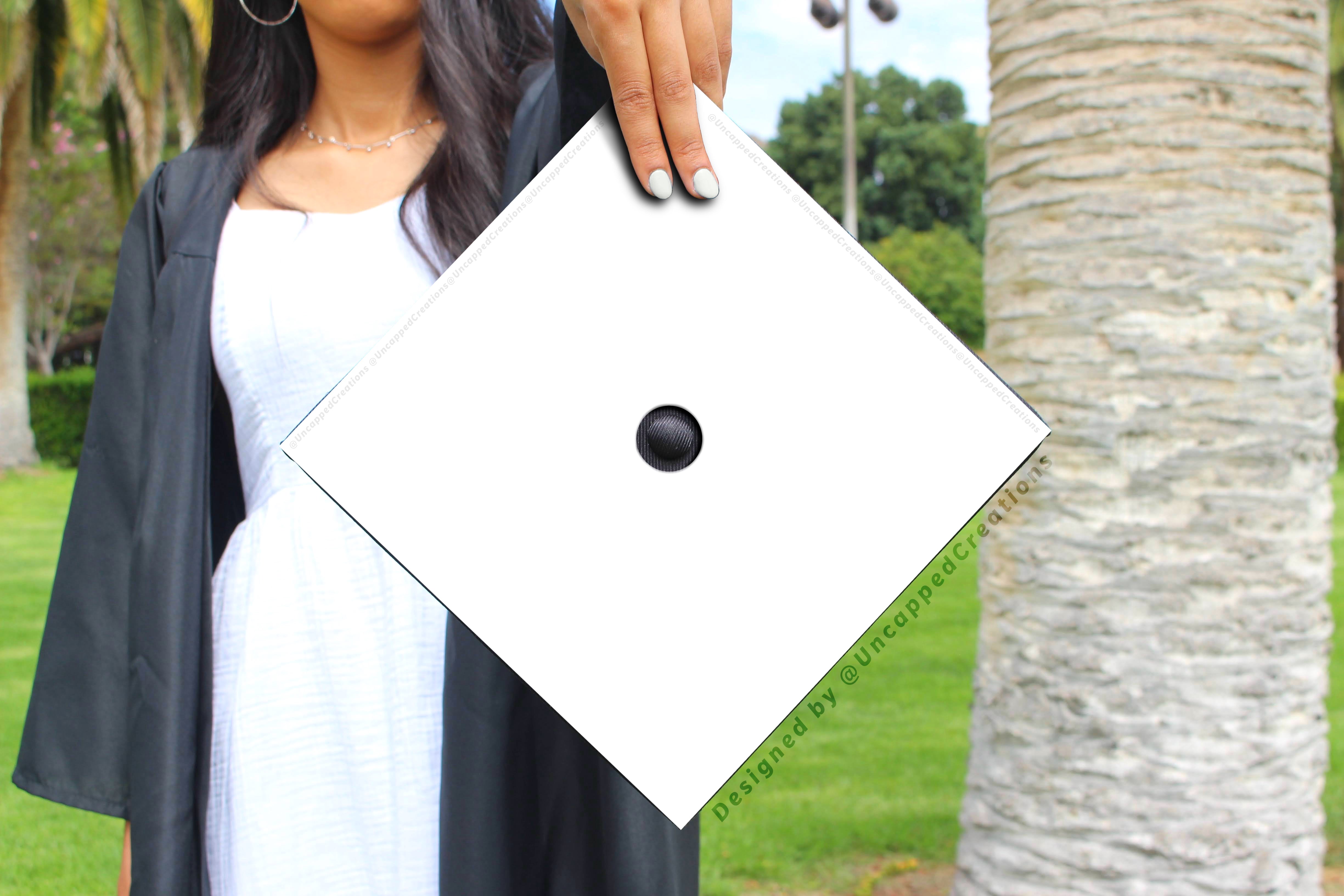 Design is 9.5 x 9.5 inches with an approximate 1 inch hole in the center and double sided adhesive in the back. Design is hand cut on cardstock paper. The topper will fit the standard 9 x 9 inches graduation cap / mortar board. Cap is not included.